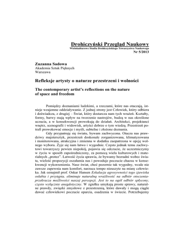 Drohiczyński Przegląd Naukowy Wielokulturowe Studia Drohiczyńskiego Towarzystwa Naukowego Nr 5/2013 Zuzanna Sadowa Akademia Sztuk Pięknych Warszawa Refleksje artysty o naturze przestrzeni i wolności The contemporary artist’s reflections on the nature of space and freedom Pomiędzy doznaniami ludzkimi, a rzeczami, które nas otaczają, istnieje wzajemne oddziaływanie. Z jednej strony jest Człowiek, który odbiera i doświadcza, z drugiej ‒ Świat, który dostarcza nam tych wrażeń. Kształty, formy, barwy mają wpływ na tworzenie nastrojów, budzą w nas określone uczucia, a w konsekwencji prowokują do działań. Architekci, projektanci wnętrz, scenografii i widowisk, artyści dobrze o tym wiedzą. Przestrzeń potrafi prowokować emocje i myśli, subtelne i złożone doznania. Gdy przypatruję się światu, bywam zachwycona. Otacza nas prawdziwy majstersztyk, przestrzeń doskonale zorganizowana, klimatyzowana i monitorowana, atrakcyjna i zmienna w dodatku zaopatrzona w opcję wolnego wyboru. Żyje się nam łatwo i wygodnie. Często jednak temu zachwytowi towarzyszy pewien niepokój, pojawia się odczucie, że uczestniczymy w życiu w sposób zapośredniczony, za pomocą wielu kulturowych i materialnych „protez”. Łatwość życia sprawia, że bywamy bezradni wobec świata, wielość propozycji oszałamia nas i powoduje poczucie chaosu w konsekwencji wykorzenienia. Nasz świat, choć pozornie tak wygodny, wcale nie zawsze zapewnia nam komfort, narzuca tempo nieuszyte na miarę człowieka. Jak oznajmił prof. Oskar Hansen Eskalacja agresywności tego zjawiska osłabia i przytępia, eliminuje naturalną wrażliwość na odbiór otoczeniaprzekracza możliwości naszej percepcji. Jest to na ogół odbiór spłycony, często wyłącznie anegdotyczny. W zgiełku umykają proste sprawy, naturalne prawdy, związki zmysłowe z przestrzenią, które dawały i mogą ciągle dawać człowiekowi poczucie oparcia, osadzenia w świecie. Potrzebujemy 398 Zuzanna Sadowa „małej ojczyzny”, „siedziby”, czegoś unikatowego, tylko swojego. Jako artysta i projektant swoje działania postrzegam jako „pracę u podstaw”, ciągłe aktualizowanie pytania o charakter związku ludzkich doznań i otaczającej rzeczywistości. One, moim zdaniem, mogą na nowo naprowadzać twórcze poszukiwania w stronę potencjalnych wartościowych relacji, które pełniej wiążą nas z rzeczywistością. Z tej perspektywy istota moich twórczych poszukiwań konkretyzuje się w pytaniach elementarnych: co to jest za miejsce, gdzie jesteśmy? które zamieszkujemy? co nas otacza? z czym obcujemy? I dalej pytając się o naturę rzeczy i charakter relacji dochodzę do pytań podstawowych i konkretnych: jak zbliżać się do nich bez tworzących dystans zapośredniczeń? jak chronić i rozwijać wrażliwość? I w konsekwencji jak świadomie uczestniczyć? jak być, w świecie, by tworzyć dobre relacje ‒ twórcze i mądre? Sensowność takich poszukiwań opieram na przekonaniu, że żyjemy w świecie, który jest znaczący, pełen struktur korespondujących wzajemnie na różnych poziomach. Rzeczywistość daje się odczytywać, poznawać, rekonstruować nawet z cząstek, z fragmentów, pojedynczych ujęć i obrazów. Gdy kiedyś zapatrzyłam się na ścianę z kołyszących się gałęzi drzew i krzewów na wietrze... ustawiłam kamerę i zarejestrowany obraz zapisałam w odwróconym czasie. Okazało się, że nic się nie zmieniło, ruch gałęzi był nadal harmonijny, jedynie lot ptaka zdradzał mój zabieg. Obraz został zaklęty w czasie. Odkryłam wtedy, że pewne obrazy, na przykład płynące chmury czy plątanina gałęzi, mają moc kierowania uwagi obserwatora ku innym porządkom rzeczywistości, prowokują stan kontemplacji, stają się jakby „błoną medytacyjną”, pobudzają wyobraźnię do dopełniania. I. Postrzegać i widzieć Jestem zdania, że ciągła próba spostrzegania i widzenia świeżego, niestereotypowego, otwartego uzbraja człowieka w szczególną wrażliwość na głębsze relacje, a w konsekwencji rodzi odczucia związku nas samych ze światem. Chcę przedstawić wybrane wglądy w opisywaną przeze mnie sprawę istotną dla mojej twórczości, na której także opieram własną myśl dydaktyczną. Refleksje artysty o naturze przestrzeni i wolności 399 SPECYFIKA MIEJSC I RZECZY Poszukując odpowiedzi na pytania: co to jest za miejsce, gdzie jesteśmy? co nas otacza? penetrowałam miejsca i rzeczy z mojego otoczenia, rozważałam ich sensy i właściwości, przypatrywałam się ich cechom, szukałam istotnych i potencjalnych relacji między nimi. Zdarzały się sytuacje niezwykłe, w których materialny kształt rzeczywistości wchodził w dialog z jej metafizycznym aspektem. Polując na takie chwile, odkrywałam w przestrzeniach pewne zależności formalne, emocjonalne i treściowe. Starałam się poznać specyfikę badanych miejsc, a rezultaty tych poszukiwań bywały nieoczekiwane. Gdy patrzymy z dna nieczynnego komina elektrowni ku górze doświadczamy bezwzględności przestrzeni, miejsca opuszczone, z łuszczącą się ze starości farbą budzą melancholię, w starych domach tropimy barwy nieokreślonej tęsknoty. Gdy pracowałam nad projektem „Babie Lato” (pokaz zrealizowany miedzy innymi na VII Konferencji Naukowej w Drohiczynie) przyglądałam się nadbużańskim łąkom. Procesowi zbliżania się do przestrzenności tego miejsca ‒ szczególnego, a jednak tak zwykłego, w jego byciu, trwaniu i przemijaniu, towarzyszyło chwytanie tego co nieuchwytne, a co współgra z osobistą wewnętrzną przestrzenią dzięki doświadczaniu obecności sobą. Moja praca przypominała polowanie. Realizowała się w ciągłym wizytowaniu, czatowaniu na „to coś”, co miało się objawić i objawiło jakby obok tego, że zmieniały się pory dnia, różnicowała się aura i pogoda. Stykając się z niezwykłą atmosferą danego miejsca, zastanawiam się zwykle, co jeszcz