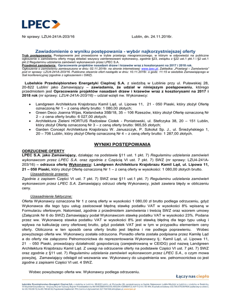Nr sprawy: LZU4-241A-203/16 Lublin, dn. 24.11.2016r. Zawiadomienie o wyniku postępowania - wybór najkorzystniejszej oferty Tryb postępowania: Postępowanie jest prowadzone w trybie przetargu nieograniczonego, w którym w odpowiedzi na publiczne ogłoszenie o zamówieniu oferty mogą składać wszyscy zainteresowani wykonawcy, zgodnie §23, związku z §22 ust.1 pkt.1 i §2 ust.1 pkt.2 Regulaminu udzielania zamówień wykonawcom przez LPEC S.A. Przedmiot zamówienia: Opracowanie projektów nasadzeń drzew i krzewów wraz z kosztorysami na 2017 i 2018 rok. Ogłoszenie o zamówieniu zamieszczono w dniu: 02.11.2016r. na stronie internetowej: www.lpec.pl, Zakładka: „Przetargi – Zamówienia” pod nr sprawy: LZU4-241A-203/16. Publiczne otwarcie ofert nastąpiło w dniu: 10.11.2016r. o godz. 11:15 w siedzibie Zamawiającego w Sali konferencyjnej (zgodnie z ogłoszeniem i SWZ). Lubelskie Przedsiębiorstwo Energetyki Cieplnej S.A. z siedzibą w Lublinie przy ul. Puławskiej 28, 20-822 Lublin/ jako Zamawiający – zawiadamia, że udział w niniejszym postępowaniu, którego przedmiotem jest Opracowanie projektów nasadzeń drzew i krzewów wraz z kosztorysami na 2017 i 2018 rok (nr sprawy: LZU4-241A-203/16) – udział wzięli nw. Wykonawcy: Landgreen Architektura Krajobrazu Kamil Ląd, ul. Lipowa 11, 21 - 050 Piaski, który złożył Ofertę oznaczoną Nr 1 – z ceną oferty brutto: 1 080,00 złotych; Green Deco Joanna Wijas, Kielanówka 35B/18, 35 – 106 Rzeszów, który złożył Ofertę oznaczoną Nr 2 – z cena oferty brutto: 6 027,00 złotych; Architektura Zieleni HORTUS Radosław Ciołek - Poniatowski, ul. Stefczyka 38, 20 – 151 Lublin, który złożył Ofertę oznaczoną Nr 3 – z ceną oferty brutto: 965,55 złotych; Garden Concept Architektura Krajobrazu W. Januszczyk, P. Szkołut Sp. J., ul. Śnieżyńskiego 1, 20 – 706 Lublin, który złożył Ofertę oznaczoną Nr 4 – z ceną oferty brutto: 1 287,00 złotych. WYNIKI POSTĘPOWANIA ODRZUCENIE OFERTY LPEC S.A. jako Zamawiający, działając na podstawie §11 ust. 1 pkt. 7) Regulaminu udzielania zamówień wykonawcom przez LPEC S.A. oraz zgodnie z Częścią VI ust. 7 pkt. 7) SWZ (nr sprawy: LZU4-241A203/16) – odrzuca ofertę Wykonawcy: Landgreen Architektura Krajobrazu Kamil Ląd, ul. Lipowa 11, 21 – 050 Piaski, który złożył Ofertę oznaczoną Nr 1 – z ceną oferty w wysokości: 1 080,00 złotych brutto. Uzasadnienie prawne: Zgodnie z zapisem Części VI ust. 7 pkt. 7) SWZ oraz §11 ust.1 pkt. 7) Regulaminu udzielania zamówień wykonawcom przez LPEC S.A. Zamawiający odrzuci ofertę Wykonawcy, jeżeli zawiera błędy w obliczeniu ceny. Uzasadnienie faktyczne: Oferta Wykonawcy oznaczona Nr 1 z ceną oferty w wysokości 1 080,00 zł brutto podlega odrzuceniu, gdyż Wykonawca dla tego typu usług zastosował błędną stawkę podatku VAT w wysokości 8% wpisaną w Formularzu ofertowym. Natomiast, zgodnie z przedmiotem zamówienia i treścią SWZ oraz wzorem umowy (Załącznik Nr 6 do SWZ) Zamawiający podał Wykonawcom stawkę podatku VAT w wysokości 23%. Podana przez ww. Wykonawcę stawka podatku VAT w wysokości 8% jest stawką błędną dla tego typu usług i wpływa na kalkulację ceny ofertowej brutto, gdyż podatek VAT jest w tym w przypadku elementem ceny oferty. Obliczona w ten sposób cena oferty brutto jest błędna i nie podlega poprawieniu. Wobec powyższego oferta ww. Wykonawcy została odrzucona. Ponadto oferta została podpisana przez Kamilę Ląd a do oferty nie załączono Pełnomocnictwa do reprezentowania Wykonawcy tj.: Kamil Ląd, ul. Lipowa 11, 21 - 050 Piaski, prowadzący działalność gospodarczą (zarejestrowaną w CEIDG) pod nazwą Landgreen Architektura Krajobrazu Kamil Ląd. Z uwagi na odrzucenie oferty na podstawie Części VI ust. 7 pkt. 7) SWZ oraz zgodnie z §11 ust. 7) Regulaminu udzielania zamówień wykonawcom przez LPEC S.A., o czym mowa powyżej, Zamawiający odstąpił od wezwania ww. Wykonawcy do uzupełnienia ww. pełnomocnictwa co jest zgodne z zapisami Części VI ust. 4 SWZ. Wobec powyższego oferta ww. Wykonawcy podlega odrzuceniu. WYBÓR OFERTY NAJKORZYSTNIEJSZEJ: LPEC S.A. jako Zamawiający zawiadamia, że w wyniku przeprowadzonego postępowania przetargowego dotyczącego niniejszego zamówienia dokonano wyboru oferty najkorzystniejszej, która została złożona przez Wykonawcę: Architektura Zieleni HORTUS Radosław Ciołek – Poniatowski, ul. Stefczyka 38, 20 – 151 Lublin, który złożył Ofertę oznaczoną Nr 3 – z ceną oferty brutto: 965,55 złotych, otrzymując max. ilość punktów 100, zgodnie z kryteriami oceny ofert (Część XI SWZ). UZASADNIENIE WYBORU OFERTY NAJKORZYSTNIEJSZEJ: Wybór oferty najkorzystniejszej został dokonany przy zastosowaniu jedynego kryterium oceny ofert, jakim jest – cena ofertowa brutto – 100%, zgodnie z zapisem z części XI SWZ. Streszczenie oceny i porównanie ofert spełniających warunki SWZ: Łączna Nr oferty Nazwa (firma) i adres wykonawcy cena oferty brutto w PLN Landgreen Architektura Krajobrazu Kamil Ląd 1 ul. Lipowa 11 1 080,00 21 – 050 Piaski Green Deco Joanna Wijas 2 Kielanówka 35B/18 6 027,00 35 – 106 Rzeszów Architektura Zieleni „HORTUS” Radosław Ciołek - Poniatowski 3 965,55 ul. Stefczyka 38 20 – 151 Lublin Garden Concept Architekci Krajobrazu W. Januszczyk, P. Szkołut Sp. J. 4 1 287,00 ul. Śnieżyńskiego 1 20 – 706 Lublin Łączna liczba uzyskanych punktów Oferta odrzucona 16,02 100 75,02 Ponadto LPEC S.A. jako Zamawiający informuje - zgodnie z Częścią XVI SWZ, że umowa w sprawie niniejszego zamówienia będzie zawarta z Wykonawcą, którego oferta została złożona jako najkorzystniejsza, po przekazaniu do publicznej wiadomości zawiadomienia o wyborze oferty najkorzystniejszej. O terminie i miejscu podpisania umowy Wykonawca, którego oferta została wybrana jako najkorzystniejsza, zostanie poinformowany zgodnie z warunkami SWZ. Zawiadomienie o wynikach postępowania i wyb