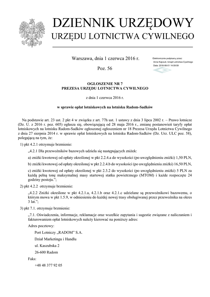 DZIENNIK URZĘDOWY URZĘDU LOTNICTWA CYWILNEGO Warszawa, dnia 1 czerwca 2016 r. Elektronicznie podpisany przez: Anna Kajczuk; Urząd Lotnictwa Cywilnego Poz. 56 Data: 2016-06-01 14:59:59 OGŁOSZENIE NR 7 PREZESA URZĘDU LOTNICTWA CYWILNEGO z dnia 1 czerwca 2016 r. w sprawie opłat lotniskowych na lotnisku Radom-Sadków Na podstawie art. 23 ust. 2 pkt 4 w związku z art. 77h ust. 1 ustawy z dnia 3 lipca 2002 r. – Prawo lotnicze (Dz. U. z 2016 r. poz. 605) ogłasza się, obowiązującą od 28 maja 2016 r., zmianę postanowień taryfy opłat lotniskowych na lotnisku Radom-Sadków ogłoszonej ogłoszeniem nr 18 Prezesa Urzędu Lotnictwa Cywilnego z dnia 27 sierpnia 2014 r. w sprawie opłat lotniskowych na lotnisku Radom-Sadków (Dz. Urz. ULC poz. 58), polegającą na tym, że: 1) pkt 4.2.1 otrzymuje brzmienie: „4.2.1 Dla przewoźników bazowych udziela się następujących zniżek: a) zniżki kwotowej od opłaty określonej w pkt 2.2.4.a do wysokości (po uwzględnieniu zniżki) 1,50 PLN, b) zniżki kwotowej od opłaty określonej w pkt 2.2.4.b do wysokości (po uwzględnieniu zniżki) 16,50 PLN, c) zniżki kwotowej od opłaty określonej w pkt 2.3.2 do wysokości (po uwzględnieniu zniżki) 5 PLN za każdą pełną tonę maksymalnej masy startowej statku powietrznego (MTOM) i każde rozpoczęte 24 godziny postoju.”; 2) pkt 4.2.2 otrzymuje brzmienie: „4.2.2 Zniżki określone w pkt 4.2.1.a, 4.2.1.b oraz 4.2.1.c udzielane są przewoźnikowi bazowemu, o którym mowa w pkt 1.5.9, w odniesieniu do każdej nowej trasy obsługiwanej przez przewoźnika na okres 3 lat.”; 3) pkt 7.1. otrzymuje brzmienie: „7.1. Oświadczenia, informacje, reklamacje oraz wszelkie zapytania i sugestie związane z naliczaniem i fakturowaniem opłat lotniskowych należy kierować na poniższy adres: Adres pocztowy: Port Lotniczy „RADOM” S.A. Dział Marketingu i Handlu ul. Kaszubska 2 26-600 Radom Faks: +48 48 377 92 05 Dziennik Urzędowy Urzędu Lotnictwa Cywilnego –2– Poz. 56 E-mail: [email protected]”. Prezes Urzędu Lotnictwa Cywilnego Piotr Ołowski