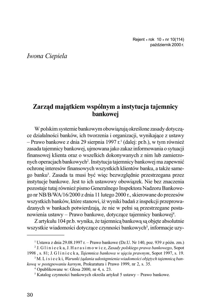 Iwona Ciepiela Rejent * rok 10 * nr 10(114) paŸdziernik 2000 r. Iwona Ciepiela Zarz¹d maj¹tkiem wspólnym a instytucja tajemnicy bankowej W polskim systemie bankowym obowi¹zuj¹ okreœlone zasady dotycz¹ce dzia³alnoœci banków, ich tworzenia i organizacji, wynikaj¹ce z ustawy – Prawo bankowe z dnia 29 sierpnia 1997 r.1 (dalej: pr.b.), w tym równie¿ zasada tajemnicy bankowej, ujmowana jako zakaz informowania o sytuacji finansowej klienta oraz o wszelkich dokonywanych z nim lub zamierzonych operacjach bankowych2. Instytucja tajemnicy bankowej ma zapewniæ ochronê interesów finansowych wszystkich klientów banku, a tak¿e samego banku3. Zasada ta musi byæ wiêc bezwzglêdnie przestrzegana przez instytucje bankowe. Jest to ich ustawowy obowi¹zek. Nie bez znaczenia pozostaje tutaj równie¿ pismo Generalnego Inspektora Nadzoru Bankowego nr NB/B/WA/16/2000 z dnia 11 lutego 2000 r., skierowane do prezesów wszystkich banków, które stanowi, i¿ wyniki badañ z inspekcji przeprowadzanych w bankach potwierdzaj¹, ¿e nie w pe³ni s¹ przestrzegane postanowienia ustawy – Prawo bankowe, dotycz¹ce tajemnicy bankowej4. Z artyku³u 104 pr.b. wynika, ¿e tajemnic¹ bankow¹ s¹ objête absolutnie wszystkie wiadomoœci dotycz¹ce czynnoœci bankowych5, informacje uzy1 Ustawa z dnia 29.08.1997 r. – Prawo bankowe (Dz.U. Nr 140, poz. 939 z póŸn. zm.) J. G l i n i e c k a, J. H a r a s i m o w i c z, Zasady polskiego prawa bankowego, Sopot 1998 , s. 81; J. G l i n i e c k a, Tajemnica bankowa w ujêciu prawnym, Sopot 1997, s. 19. 3 M. L i s i e c k i, Warunki ¿¹dania udostêpnienia wiadomoœci objêtych tajemnic¹ bankow¹ w postêpowaniu karnym, Prokuratura i Prawo 1999, nr 2, s. 35. 4 Opublikowane w: Glosa 2000, nr 4, s. 23. 5 Katalog czynnoœci bankowych okreœla artyku³ 5 ustawy – Prawo bankowe. 2 30 Zarz¹d maj¹tkiem wspólnym a instytucja tajemnicy bankowej skane w czasie negocjacji, a tak¿e zwi¹zane z zawarciem umowy z bankiem i jej realizacj¹ [...]. Zakres przedmiotowy tajemnicy bankowej zosta³ wiêc ustalony w sposób niezwykle szeroki, co stanowi pewne novum na gruncie polskiego prawa bankowego, gdy¿ obowi¹zuj¹ca pod rz¹dami poprzedniego prawa bankowego6 koncepcja tajemnicy bankowej dotyczy³a jedynie wielkoœci dokonywanych na rachunku bankowym obrotów, stanu rachunków (art. 48 ust. 1), a tak¿e wynajmowania sejfów i przyjêtych na przechowanie przedmiotów i papierów wartoœciowych (art. 48 ust. 6). Jak twierdzi J. Gliniecka, aktualnie obowi¹zuj¹ce rozwi¹zanie dotycz¹ce tajemnicy bankowej jest jednak bli¿sze rozwi¹zaniom europejskim7. Konstrukcja tajemnicy bankowej musi, chocia¿by ze wzglêdu na interes publiczny, przewidywaæ pewne wyj¹tki, czyli – innymi s³owy – okreœlaæ sytuacje, kiedy bank zwolniony bêdzie od zachowania dyskrecji. Z regulacji art. 104 i 105 pr.b. wynika, i¿ istnieje pewna grupa podmiotów, którym wiadomoœci konfidencjonalne mog¹ zostaæ ujawnione; bêdzie to na przyk³ad strona umowy, osoba przez ni¹ upowa¿niona, a tak¿e podmioty wymienione w art. 105. S¹ to wiêc beneficjenci tajemnicy bankowej. Wœród nich nie ma jednak ma³¿onków osób, które dokona³y z bankiem czynnoœci bankowej, zw³aszcza czynnoœci polegaj¹cej na zaci¹gniêciu zobowi¹zania (umowa kredytu bankowego, umowa po¿yczki). W praktyce stosunkowo czêsto w³aœnie ma³¿onkowie osób bêd¹cych stron¹ umowy bankowej wystêpuj¹ o ujawnienie informacji, które zgodnie z aktualnym stanem prawnym objête s¹ tajemnic¹. Czy ma³¿onkowie tacy mog¹ skutecznie domagaæ siê od banku uzyskania informacji objêtych na podstawie art. 104 pr.b. dyskrecj¹? Czy bank mo¿e udzielaæ ma³¿onkom osób bêd¹cych stron¹ wy¿ej przytoczonych umów bankowych takich informacji? Udzielenie odpowiedzi na te pytania wymaga ustalenia, czy jeden z ma³¿onków mo¿e samodzielnie, skutecznie zaci¹gn¹æ zobowi¹zanie na podstawie umowy po¿yczki, czy kredytu w takiej instytucji, jak¹ jest bank. W polskim systemie prawa rodzinnego z chwil¹ zawarcia ma³¿eñstwa powstaje miêdzy ma³¿onkami z mocy ustawy wspólnoœæ maj¹tkowa obej- 6 Ustawa – Prawo bankowe z dnia 31 stycznia 1989 r. (tekst jednolity: Dz.U. z 1992 r. Nr 72, poz. 359 z póŸn. zm.). 7 J. G l i n i e c k a, Tajemnica bankowa w ujêciu prawnym, s. 32. 31 Iwona Ciepiela muj¹ca ich dorobek – art. 31 kodeksu rodzinnego i opiekuñczego8 (dalej: k.r.i o.). Ustrój wspólnoœci ustawowej jest wiêc podstawowym i preferowanym przez ustawodawcê ustrojem w stosunkach ma³¿eñskich maj¹tkowych. Nie jest to jednak ustrój przymusowy, gdy¿ z art. 47 § 1 k.r.i o. jednoznacznie wynika, ¿e ma³¿onkowie mog¹ przez umowê maj¹tkow¹ wspólnoœæ ustawow¹ rozszerzyæ, ograniczyæ albo wy³¹czyæ. Wnioskuj¹c a contrario, jeœli ma³¿onkowie z w³asnej woli nie wprowadz¹ innego ustroju maj¹tkowego, nale¿y uznaæ obowi¹zywanie ustroju wspólnoœci ustawowej. Co wiêcej, ustrój wspólnoœci ustawowej nale¿y uznaæ w ka¿dej sytuacji, w której nie ma podstaw do przyjêcia innego ustroju9. Kodeks rodzinny i opiekuñczy w odniesieniu do ma³¿onków, których stosunki oparte s¹ na ustroju wspólnoœci maj¹tkowej, nak³ada bardzo istotny obowi¹zek wspó³dzia³ania w zarz¹dzie maj¹tkiem wspólnym (art. 36). Zarz¹d maj¹tkiem wspólnym definiowany jest jako ca³okszta³t czynnoœci prawnych oraz faktycznych, które dotycz¹ tego maj¹tku bezpoœrednio lub poœrednio poprzez osi¹gniêty skutek gospodarczy10. Wykonywanie zarz¹du maj¹tkiem wspólnym musi byæ wiêc oparte na wspó³dzia³aniu ma³¿onków, którego efektem jest wspólne podejmowanie decyzji dotycz¹cych ich rodziny. Krótko mówi¹c, wszelkie decyzje powinny byæ wynikiem ich uzgodnieñ i porozumieñ. Tylko w takich okolicznoœciach ma³¿onkowie bêd¹ uwzglêdniaæ i szanowaæ swoj¹ wolê, swoje zamiary. Tylko w takich warunkach ma³¿onkowie bêd¹ s³u¿yæ sobie pomoc¹ i wsparciem przy wykonywaniu czynnoœci z