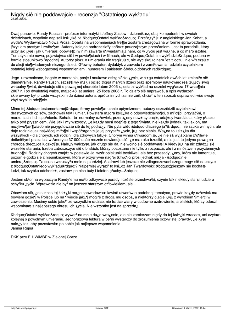 WiMBP Nigdy siê nie poddawajcie - recenzja "Ostatniego wyk³adu" 28.05.2009. Dwaj panowie, Randy Pausch - profesor informatyki i Jeffrey Zaslow - dziennikarz, obaj kompetentni w swoich dziedzinach, wspólnie napisali ksi±¿kê pt. „Ostatni wyk³ad”. Prze³o¿y³ j± z angielskiego Jan Kabat, a wyda³o Wydawnictwo Nowa Proza. Oparta na wspomnieniach tre¶æ zosta³a zredagowana w formie sprawozdania, jêzykiem prostym i zwiêz³ym. Autorzy kolejne podrozdzia³y koñcz± pouczaj±cym przes³aniem. Jest to poradnik, który uczy jak ¿yæ i jak umieraæ; opowie¶ci w nim zawarte u¶wiadamiaj± nam, co w ¿yciu jest wa¿ne, a co ma³o istotne. Tematyka nie nowa, pojawiaj±ca siê i w powie¶ciach i w filmach, ale w „Ostatnim wyk³adzie” podana w formie stosunkowo ³agodnej. Autorzy pisz± o umieraniu nie tragizuj±c, nie wyciskaj±c nam ³ez z oczu i nie w³±czaj±c do akcji nie¶wiadomych niczego dzieci. G³ówny bohater, dydaktyk z zawodu i z zami³owania, udziela czytelnikom ostatniej lekcji wzbogaconej wspomnieniami, humorem i pakietem „dobrych rad”. Jego urozmaicone, bogate w marzenia, pasje i naukowe osi±gniêcia ¿ycie, w ci±gu ostatnich dwóch lat zmieni³o siê diametralnie. Randy Pausch, szczê¶liwy m±¿ i ojciec trojga ma³ych dzieci oraz spe³niony naukowiec realizuj±cy swój wirtualny ¶wiat, dowiaduje siê o powa¿nej chorobie latem 2006 r., ostatni wyk³ad na uczelni wyg³asza 17 wrze¶nia 2007 r. i po dwuletniej walce, maj±c 48 lat umiera, 25 lipca 2008 r. To dzia³o siê naprawdê, a opis wydarzeñ skierowany by³ przede wszystkim do dzieci autora, oprócz innych zamierzeñ, chcia³ w ten sposób usprawiedliwiæ swoje zbyt szybkie odej¶cie. Mimo tej „testamentarnej” formy powie¶æ tchnie optymizmem, autorzy oszczêdzili czytelnikowi drastycznych opisów, zachowali takt i umiar. Powsta³a m±dra ksi±¿ka o odpowiedzialno¶ci, o mi³o¶ci, przyja¼ni, o marzeniach i ich spe³nianiu. Bohater to normalny cz³owiek, przera¿ony now± sytuacj±, udaj±cy twardziela, który p³acze tylko pod prysznicem. Wie, jak i my wszyscy, ¿e ka¿dy musi odej¶æ z tego ¶wiata, nie ka¿dy jednak, tak jak on, ma mo¿liwo¶æ ¶wiadomie przygotowaæ siê do tej podró¿y. Nie pyta wiêc „dlaczego ja?”, nie szuka winnych, ale daje rodzinie jak najwiêcej mi³o¶ci i wspó³organizuje jej przysz³e ¿ycie, ju¿ bez siebie. Wa¿na to ksi±¿ka dla wszystkich - dla chorych, ich rodzin i dla zdrowych tak¿e. Chorym winna u¶wiadomiæ, ¿e nie s± wyj±tkami z³o¶liwie dotkniêtymi przez los, w Ameryce 37 000 osób rocznie dowiaduje siê, ¿e ma raka trzustki, a nie jest to jedyna powa¿na choroba drêcz±ca ludzko¶æ. Nale¿y walczyæ, jak d³ugo siê da, nie wolno siê poddawaæ! A kiedy ju¿ na nic zdadz± siê wszelkie starania, trzeba zatroszczyæ siê o bliskich, którzy pozostan± nie tylko z rozpacz±, ale i z mnóstwem przyziemnych trudno¶ci. Rodziny chorych znajd± w postawie Jai wzór opiekunki troskliwej, ale bez przesady, ¿ony, która nie lamentuje, pozornie godzi siê z nieuniknionym, która w przyp³ywie nag³ej tkliwo¶ci prosi jednak mê¿a - „nie umieraj”. Ta scena wzruszy³a mnie najbardziej. A zdrowi lub jeszcze nie zdiagnozowani czego mog± siê nauczyæ z „Ostatniego wyk³adu”? Najpe³niej wyrazi³ to ksi±dz Jan Twardowski: „¦pieszmy siê kochaæ ludzi, tak szybko odchodz±, zostan± po nich buty i telefon g³uchy...”. Jestem sk³onna wybaczyæ Randy`emu ma³o odkrywcze porady i czêste przechwa³ki, czyni± tak niekiedy starsi ludzie u schy³ku ¿ycia. Wprawdzie nie by³ on jeszcze starszym cz³owiekiem, ale... Obawiam siê, ¿e sukces tej ksi±¿ki mo¿e spowodowaæ lawinê utworów o podobnej tematyce, prawie ka¿dy cz³owiek ma bowiem gdzie¶ w Polsce lub na ¶wiecie jak±¶ mogi³ê z drog± mu osob±, a niektórzy ci±gle ¿yj± z wyrokiem ¶mierci w zawieszeniu. Musimy sobie jako¶ ze wszystkim radziæ, nie traciæ wiary w cudowne uzdrowienie, a bliskich, którzy odeszli, wspominaæ z najlepszego okresu ich ¿ycia. Nie wszystko jest na sprzeda¿. „Ostatni wyk³ad” wywar³ na mnie du¿e wra¿enie, ale nie zamierzam nigdy do tej ksi±¿ki wracaæ, ani czytaæ kolejnej o powolnym umieraniu. Jednorazowa lektura w pe³ni wystarczy do zrozumienia oczywistej prawdy, ¿e ¿yæ nale¿y tak, aby pozostawiæ po sobie jak najlepsze wspomnienia. Janina Rujna DKK przy F.1 WiMBP w Zielonej Górze http://old.wimbp.zgora.pl Kreator PDF Utworzono 4 March, 2017, 13:24