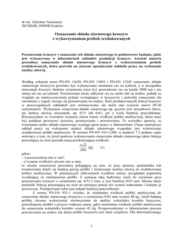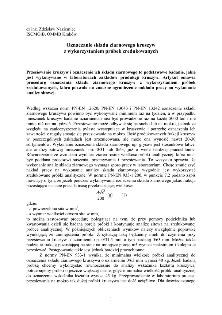 dr inż. Zdzisław Naziemiec ISCMOiB, OMMB Kraków Oznaczanie składu ziarnowego kruszyw z wykorzystaniem próbek zredukowanych Przesiewanie kruszyw i oznaczenie ich składu ziarnowego to podstawowe badanie, jakie jest wykonywane w laboratoriach zakładów produkcji kruszyw. Artykuł omawia procedurę oznaczania składu ziarnowego kruszyw z wykorzystaniem próbek zredukowanych, która pozwala na znaczne ograniczenie nakładu pracy na wykonanie analizy sitowej. Według wskazań norm PN-EN 12620, PN-EN 13043 i PN-EN 13242 oznaczenie składu ziarnowego kruszywa powinno być wykonywane minimum raz na tydzień, a w przypadku mieszanek kruszyw badanie uziarnienia musi być prowadzone raz na każde 5000 ton i nie mniej niż raz na tydzień. Przesiewanie może odbywać się na sucho lub na mokro, jednak ze względu na zanieczyszczenia pylaste występujące w kruszywie i potrzebę oznaczenia ich zawartości z reguły stosuje się przesiewanie na mokro. Ilość produkowanych frakcji kruszyw w poszczególnych zakładach jest zróżnicowana, ale może ona wynosić nawet 20-30 sortymentów. Wykonanie oznaczenia składu ziarnowego np. grysów jest stosunkowo łatwe, ale analizy sitowej mieszanek, np. 0/31 lub 0/63, już o wiele bardziej pracochłonne. Równocześnie ze wzrostem wymiaru ziaren rośnie wielkość próbki analitycznej, która musi być poddana procesowi suszenia, przemywania i przesiewania. To wszystko sprawia, że wykonanie analiz składu ziarnowego wymaga sporo pracy w laboratorium. Chcąc zmniejszyć nakład pracy na wykonanie analizy składu ziarnowego wygodnie jest wykorzystać zredukowane próbki analityczne. W normie PN-EN 933-1:200, w punkcie 7.2 podano zapis mówiący o tym, że jeżeli podczas wykonywania oznaczenia składu ziarnowego jakaś frakcja pozostająca na sicie posiada masę przekraczającą wielkość: A d [g] (1) 200 gdzie: - A powierzchnia sita w mm2, - d wymiar wielkości otworu sita w mm, to można zastosować procedurę polegającą na tym, że przy pomocy podzielnika lub kwartowania dzieli się badaną porcję próbki i kontynuuje analizę sitową na zredukowanej próbce analitycznej. W późniejszych obliczeniach wyników należy uwzględnić poprawkę wynikającą ze zmniejszenia próbki. Z sytuacją taką będziemy mieli do czynienia przy przesiewaniu kruszyw o uziarnieniu np. 0/31,5 mm, a tym bardziej 0/63 mm. Można także podzielić frakcję pozostającą na sicie na mniejsze porcje niż wynosi maksimum i kolejno je przesiewać. Postępowanie takie jest jednak bardziej pracochłonne. Z normy PN-EN 933-1 wynika, że minimalna wielkość próbki analitycznej do oznaczenia składu ziarnowego kruszywa o uziarnieniu 0/63 mm wynosi 40 kg. Jeżeli badaną próbkę chcemy wykorzystać równocześnie do analizy wskaźnika kształtu kruszywa, potrzebujemy próbki o jeszcze większej masie, gdyż minimalna wielkość próbki analitycznej do oznaczenia wskaźnika kształtu wynosi 45 kg. Przeprowadzenie w laboratorium procesu przesiewania na mokro tak dużej próbki kruszywa jest dość uciążliwe. Dla doświadczonego 1 laboranta omawiane zagadnienie nie stanowi problemu, ale dla laborantów początkujących często jest kłopotliwe. Przesiewanie na sucho i na mokro W procesie oznaczenia składu ziarnowego kruszywa bardzo ważne jest właściwe pobranie próbki i późniejsze jej pomniejszanie. W przygotowaniu próbek analitycznych pomocny może być wykres przedstawiony na rysunku 1. Podano na nim zależność wielkości minimalnej próbki analitycznej od górnej granicy uziarnienia badanego kruszywa. 50 45 wskaźnik płaskości PN-EN 933-3 i skład ziarnowy PN-EN 933-1 40 wskaźnik kształtu PN-EN 933-4 wielkość próbki [kg] 35 30 25 20 15 10 5 0 0 10 20 30 40 50 60 70 górna granica badanej klasy ziarnowej [mm] Rys. 1. Minimalna wielkość próbek analitycznych do oznaczania składu ziarnowego kruszyw zwykłych i zawartości ziaren nieforemnych Przy okazji warto zwrócić uwagę na różnice wyników, jakie mogą wystąpić podczas oznaczaniu składu ziarnowego kruszywa na sucho i na mokro. Na rysunku 2 przedstawiono krzywe składu ziarnowego kamienia wapiennego, zawierającego znaczne ilości zanieczyszczeń gliniastych, otrzymane przy analizie na mokro i na sucho. 100 90 1 - kruszywo przesiewane na sucho 2 - kruszywo przesiewane na mokro 80 70 % 60 50 40 2 30 20 1 10 0 0,1 1 10 2 100 mm Rys. 2. Skład ziarnowy kruszywa z dużą zawartością zanieczyszczeń gliniastych oznaczony przy pomocy przesiewania na mokro i na sucho Krzywe składu ziarnowego dla ziaren poniżej 15 mm zaczynają się rozchodzić. Krzywa 1 pokazuje nam wyraźnie zaniżoną zawartość frakcji najdrobniejszych (0-1 mm), a zawyżoną zawartość frakcji rzędu 1-10 mm. Z wykresu na rysunku 2 wynika niezaprzeczalnie, że jedynie analiza wykonana metodą na mokro jest miarodajna. Proponowana procedura oznaczania składu ziarnowego Dążąc do uproszczenia wykonywania analizy składu ziarnowego dużych próbek kruszywa proponuje się następujący tok postępowania, uwzględniający wymagania zawarte w PN-EN 933-1. Poniżej podano opis postępowania z próbką o uziarnieniu 0/63 mm, który bez problemu można dostosować do każdej innej frakcji kruszywa. 1. Pobrać i pomniejszyć próbkę zgodnie z normą PN-EN 932-1 i PN-EN 932-2. 2. Wysuszyć próbkę analityczną do stałej masy (M1). 3. Odsiać na sucho (może być ręcznie) frakcję powyżej np. 16 mm. 4. Dokładnie przemyć wydzieloną frakcję 16/63 na sicie 0,063 mm stosując sito zabezpieczające np. z oczkami 1 mm. 5. Zebrać wypłukany materiał 16/63 mm, wysuszyć i zważyć (M2). 6. Przesiewać próbkę 16/63 mm na wstrząsarce z wymaganym zestawem sit (np. 45, 31,5, 22,4 mm) i zważyć poszczególne frakcje (M2A, M2B, M2C …). 7. Zebrać całość materiału 0/16 mm z procesu przemywania i wysuszyć (zlewając wcześniej sklarowaną wodę). 8. Połączyć suchy materiał 0/16 mm uzyskany z przesiewania ręcznego (punkt 3), z wy