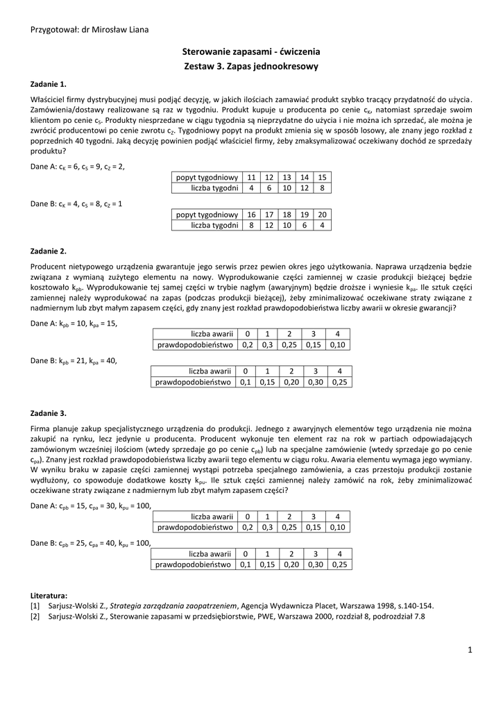 Przygotował: dr Mirosław Liana Sterowanie zapasami - ćwiczenia Zestaw 3. Zapas jednookresowy Zadanie 1. Właściciel firmy dystrybucyjnej musi podjąć decyzję, w jakich ilościach zamawiać produkt szybko tracący przydatność do użycia. Zamówienia/dostawy realizowane są raz w tygodniu. Produkt kupuje u producenta po cenie cK, natomiast sprzedaje swoim klientom po cenie cS. Produkty niesprzedane w ciągu tygodnia są nieprzydatne do użycia i nie można ich sprzedać, ale można je zwrócić producentowi po cenie zwrotu cZ. Tygodniowy popyt na produkt zmienia się w sposób losowy, ale znany jego rozkład z poprzednich 40 tygodni. Jaką decyzję powinien podjąć właściciel firmy, żeby zmaksymalizować oczekiwany dochód ze sprzedaży produktu? Dane A: cK = 6, cS = 9, cZ = 2, popyt tygodniowy liczba tygodni 11 4 12 6 13 10 14 12 15 8 popyt tygodniowy liczba tygodni 16 8 17 12 18 10 19 6 20 4 Dane B: cK = 4, cS = 8, cZ = 1 Zadanie 2. Producent nietypowego urządzenia gwarantuje jego serwis przez pewien okres jego użytkowania. Naprawa urządzenia będzie związana z wymianą zużytego elementu na nowy. Wyprodukowanie części zamiennej w czasie produkcji bieżącej będzie kosztowało kpb. Wyprodukowanie tej samej części w trybie nagłym (awaryjnym) będzie droższe i wyniesie k pa. Ile sztuk części zamiennej należy wyprodukować na zapas (podczas produkcji bieżącej), żeby zminimalizować oczekiwane straty związane z nadmiernym lub zbyt małym zapasem części, gdy znany jest rozkład prawdopodobieństwa liczby awarii w okresie gwarancji? Dane A: kpb = 10, kpa = 15, liczba awarii prawdopodobieństwo 0 0,2 1 0,3 2 0,25 3 0,15 4 0,10 liczba awarii prawdopodobieństwo 0 0,1 1 0,15 2 0,20 3 0,30 4 0,25 Dane B: kpb = 21, kpa = 40, Zadanie 3. Firma planuje zakup specjalistycznego urządzenia do produkcji. Jednego z awaryjnych elementów tego urządzenia nie można zakupić na rynku, lecz jedynie u producenta. Producent wykonuje ten element raz na rok w partiach odpowiadających zamówionym wcześniej ilościom (wtedy sprzedaje go po cenie cpb) lub na specjalne zamówienie (wtedy sprzedaje go po cenie cpa). Znany jest rozkład prawdopodobieństwa liczby awarii tego elementu w ciągu roku. Awaria elementu wymaga jego wymiany. W wyniku braku w zapasie części zamiennej wystąpi potrzeba specjalnego zamówienia, a czas przestoju produkcji zostanie wydłużony, co spowoduje dodatkowe koszty k pu. Ile sztuk części zamiennej należy zamówić na rok, żeby zminimalizować oczekiwane straty związane z nadmiernym lub zbyt małym zapasem części? Dane A: cpb = 15, cpa = 30, kpu = 100, liczba awarii prawdopodobieństwo 0 0,2 1 0,3 2 0,25 3 0,15 4 0,10 liczba awarii prawdopodobieństwo 0 0,1 1 0,15 2 0,20 3 0,30 4 0,25 Dane B: cpb = 25, cpa = 40, kpu = 100, Literatura: [1] Sarjusz-Wolski Z., Strategia zarządzania zaopatrzeniem, Agencja Wydawnicza Placet, Warszawa 1998, s.140-154. [2] Sarjusz-Wolski Z., Sterowanie zapasami w przedsiębiorstwie, PWE, Warszawa 2000, rozdział 8, podrozdział 7.8 1