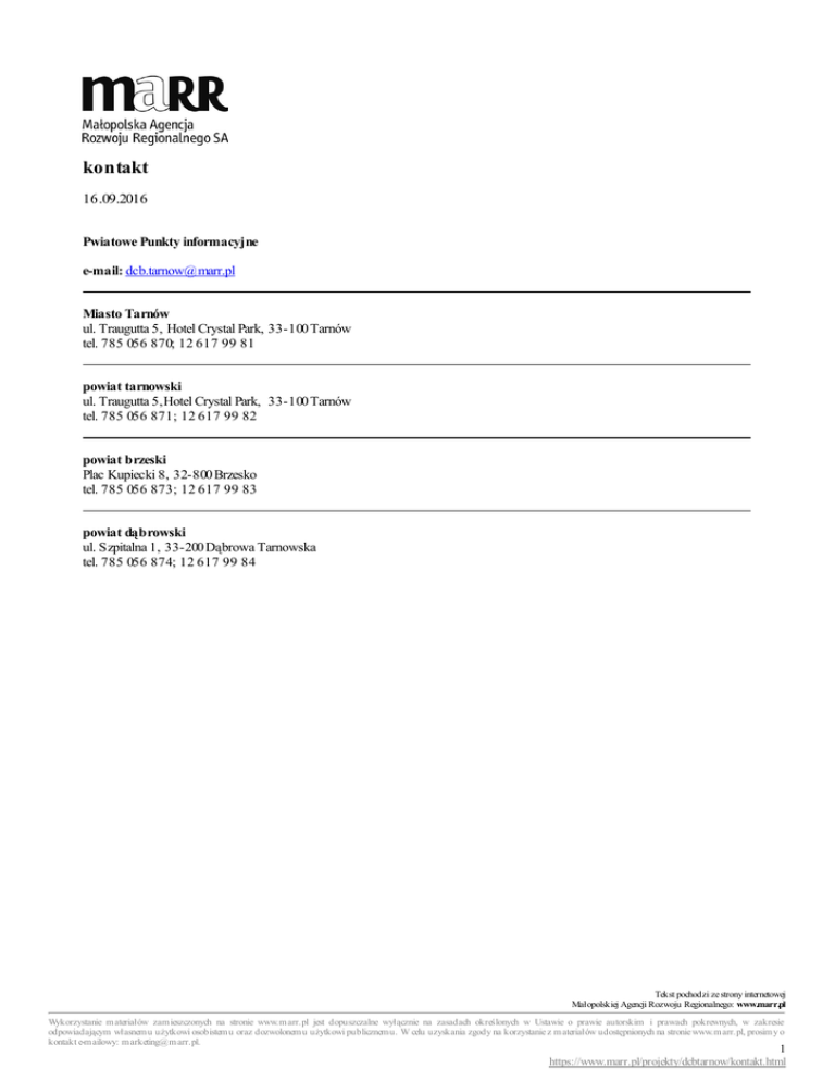 kontakt 16.09.2016 Pwiatowe Punkty informacyjne e-mail: [email protected] Miasto Tarnów ul. Traugutta 5, Hotel Crystal Park, 33-100 Tarnów tel. 785 056 870; 12 617 99 81 powiat tarnowski ul. Traugutta 5,Hotel Crystal Park, 33-100 Tarnów tel. 785 056 871; 12 617 99 82 powiat brzeski Plac Kupiecki 8, 32-800 Brzesko tel. 785 056 873; 12 617 99 83 powiat dąbrowski ul. Szpitalna 1, 33-200 Dąbrowa Tarnowska tel. 785 056 874; 12 617 99 84 Tekst pochodzi ze strony internetowej Małopolskiej Agencji Rozwoju Regionalnego: www.marr.pl Wykorzystanie m ateriałów zam ieszczonych na stronie www.m arr.pl jest dopuszczalne wyłącznie na zasadach określonych w Ustawie o prawie autorskim i prawach pokrewnych, w zakresie odpowiadającym własnem u użytkowi osobistem u oraz dozwolonem u użytkowi publicznem u. W celu uzyskania zgody na korzystanie z m ateriałów udostępnionych na stronie www.m arr.pl, prosim y o kontakt e-m ailowy: m arketing@m arr.pl. 1 https://www.marr.pl/projekty/dcbtarnow/kontakt.html