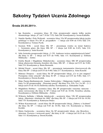 Szkolny Tydzień Ucznia Zdolnego Środa 25.05.2011r. 1. Iga Kurnicka - uczennica klasy III Gim przeprowadzi zajęcia kółka języka niemieckiego lekcja „0” (od 7:10 do 7:55). Sala 204. Koordynator p. Iwona Kukurba. 2. Natalia Opolka i Pola Waliszak - uczennice klasy VIa SP przeprowadzą lekcję języka polskiego w klasie IVa SP nt. przypadków - 1 lekcja (od 8:00 do 8:45) Sala 216. Koordynator p. Tomasz Pyzik. 3. Szymon Wilk - uczeń klasy IIIc SP – prezentacja wiedzy na temat budowy i brzmienia gitary dla klasy IIIb SP - 1 lekcja (od 8:00 do 8:45). Sala 214. Koordynator p. Anna Kusztal. 4. Julia Jezierska przeprowadzi lekcję „J. CH. Andersen twórca najpiękniejszych baśni” dla klasy Ic SP - 2 lekcja (od 8:55 do 9:40). Sala 115. Koordynator p. Elżbieta Mikłuszka – Ziober. 5. Emilia Buzek i Magdalena Małachowska - uczennice klasy IIIb SP przeprowadzą lekcję plastyczno-literacką (komiks) dla klasy IIIb SP - 2 lekcja (od 8:55 do 9:40). Sala 214. Koordynator p. Beata Bomastik. 6. Michał Puzoń - uczeń klasy IIIc SP – prezentacja instrumentów klawiszowych dla klasy IIIa SP - 2 lekcja (od 8:55 do 9:40). Sala 217. Koordynator p. Anna Kusztal. 7. Mateusz Drząszcz - uczeń klasy IIa SP przeprowadzi lekcję „Co to jest magnes? Poznajemy różne sztuczki” dla klasy Ib SP - 2 lekcja (od 8:55 do 9:40). Sala 117. Koordynator p. Dorota Kordek. 8. Maja Puente-Bartłomiejczyk, Joanna Dobrzyńska i Małgorzata Gepfert - uczennice klasy Ve SP przeprowadzą „Warsztaty poezji” dla klasy IVa, IVb, Va i Ve SP - 2 i 3 lekcja (od 8:55 do 10:35) Stołówka szkolna. Koordynator p. Aleksandra Tręda. 9. Magdalena Horbacz - uczennica klasy IIIa SP przeprowadzi warsztaty taneczne – taniec nowoczesny dla klasy Ic SP 3 lekcja (od 9:45 do 10:30). Świetlica szkolna. Koordynator p. Elżbieta Mikłuszka – Ziober. 10. Wiktoria Safińska i Mikołaj Jakubowski - uczniowie klasy VIb SP przeprowadzą lekcję „Mnożenie i dzielenie do 1000” dla klasy IIIc SP - 3 lekcja (od 9:45 do 10:30). Sala 118. Koordynator p. Katarzyna Dudys. 11. Wiktor Kaczmarczyk - uczeń klasy IIa SP przeprowadzi lekcję „Zabawy z liczbami” dla klasy IIa SP - 3 lekcja (od 9:45 do 10:30). Sala 116. Koordynator p. Dorota Kordek. 12. Maria Gachowska - uczennica klasy IIa SP przeprowadzi lekcję „Jan Brzechwa – dzieciom. Życiorys i twórczość poety” dla klasy Ic SP - 4 lekcja (od 10:35 do 11:20) Sala 115. Koordynator p. Dorota Kordek. 13. Natalia Michalska i Joanna Dobrzyńska - uczennice klasy Ve SP przeprowadzą lekcję wychowawczą „Najlepszy przyjaciel człowieka” dla klasy Ve SP - 4 lekcja (od 10:35 do 11:20) Sala 205. Koordynator p. Cecylia Rojek. 14. Maksymilian Mierzwa, Aleksandra Łukaszek, Milena Suchecka, Aleksander Gattner i Wojtek Pieniążek - uczniowie klasy Ia SP (członkowie Klubu Czytelniczego) przeprowadzą lekcję „To warto przeczytać”- prezentacja wybranych pozycji książkowych - 4 lekcja (od 10:35 do 11:20). Sala 108. Koordynator p. Grażyna Bogucka. 15. Kacper Sołowiów i Krzysztof Staniszewski - uczniowie klasy II Gim przeprowadzą pokaz doświadczeń chemicznych dla klas I-III Gim - 4 lekcja (od 10:35 do 11:20). Stołówka szkolna. Koordynator p. AnnaKaraś. 16. Aleksandra Nasiek - uczennica klasy Va SP przeprowadzi lekcję ortografii w klasie Va SP - 4 lekcja (od 10:35 do 11:20). Sala 206. Koordynator p. Tomasz Pyzik. 17. Zuzanna Strączek - uczennica klasy IIa SP przeprowadzi lekcję „Legendy polskieWiano Świętej Kingi” dla klasy IIa SP - 5 lekcja (od 11:30 do 12:15). Sala 116. Koordynator p. Dorota Kordek. 18. Korwin Bieniek i Tomasz Wędrychowicz - uczniowie klasy Ve SP przeprowadzą lekcję historii - Prezentacja multimedialna „Średniowieczne zamki w Polsce” dla klasy Ve SP - 5 lekcja (od 11:30 do 12:15) Sala 416. Koordynator p. Grzegorz Koniczek. 19. Natalia Nitarska - uczennica klasy Va SP przeprowadzi lekcję przyrody „Podstawy ekologii i ochrony środowiska” dla klasy Va SP - 5 lekcja (od 11:30 do 12:15) Sala 206. Koordynator p. Cecylia Rojek. 20. Mateusz Pochopin i Tymoteusz Ehrlich - uczniowie klasy Ve SP przeprowadzą lekcję przyrody „Owady wokół nas” dla klasy IVa SP - 6 lekcja (od 12:40 do 13:25). Sala 216. Koordynator p. Cecylia Rojek. 21. Natalia Opolka i Ewa Paciorek - uczennice klasy VIa SP przeprowadzą lekcję przyrody „ Powstawanie i budowa oraz rola komórek rozrodczych” dla klasy VIa SP 7 lekcja (od 13:30 do 14:15 ) Sala 307. Koordynator p. Cecylia Rojek. 22. Maja Matuszewska i Natalia Nitarska - uczennice klasy Va SP przeprowadzą zajęcia kółka plastycznego dla klas I SP - 8 lekcja (od 14:20 do 15:05) Sala 204. Koordynator p. Joanna Klebanowicz. 23. Mateusz Par – uczeń klasy III Gim. Przeprowadzi zajęcia Informatyki dla klasy III Gim. – 5 lekcja (11.30 – 12.15). Temat zajęć: Rozwój technologii komputerowej. Sala 405. Koordynator: p. Piotr Pielka.