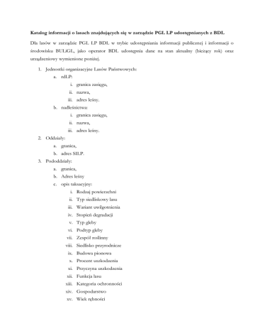 Katalog informacji o lasach znajdujących się w zarządzie PGL LP udostępnianych z BDL Dla lasów w zarządzie PGL LP BDL w trybie udostępniania informacji publicznej i informacji o środowisku BULiGL, jako operator BDL udostępnia dane na stan aktualny (bieżący rok) oraz urządzeniowy wymienione poniżej. 1. Jednostki organizacyjne Lasów Państwowych: a. rdLP: i. granica zasięgu, ii. nazwa, iii. adres leśny. b. nadleśnictwa: i. granica zasięgu, ii. nazwa, iii. adres leśny. 2. Oddziały: a. granica, b. adres SILP. 3. Pododdziały: a. granica, b. Adres leśny c. opis taksacyjny: i. Rodzaj powierzchni ii. Typ siedliskowy lasu iii. Wariant uwilgotnienia iv. Stopień degradacji v. Typ gleby vi. Podtyp gleby vii. Zespół roślinny viii. Siedlisko przyrodnicze ix. Budowa pionowa x. Procent uszkodzenia xi. Przyczyna uszkodzenia xii. Funkcja lasu xiii. Kategoria ochronności xiv. Gospodarstwo xv. Wiek rębności xvi. Powierzchnia xvii. Warstwa: 1. Nazwa 2. Gatunek a. Nazwa b. Ranga c. Udział d. Wiek e. Wysokość f. Pierśnica g. Zwarcie h. Zmieszanie i. Zadrzewienie j. Zagęszczenie k. Miąższość gatunku w warstwie xviii. Wskazówki gospodarcze xix. Rodzaj pokrywy 2