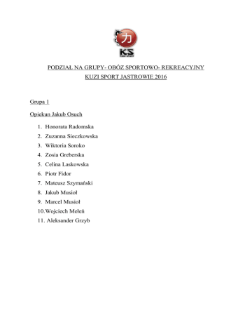 PODZIAŁ NA GRUPY- OBÓZ SPORTOWO- REKREACYJNY KUZI SPORT JASTROWIE 2016 Grupa 1 Opiekun Jakub Osuch 1. Honorata Radomska 2. Zuzanna Sieczkowska 3. Wiktoria Soroko 4. Zosia Greberska 5. Celina Laskowska 6. Piotr Fidor 7. Mateusz Szymański 8. Jakub Musioł 9. Marcel Musioł 10.Wojciech Mełeń 11. Aleksander Grzyb Grupa 2 Opiekun Maciej Drążewski 1. Stanisław Popow 2. Kacper Biadała 3. Piotr Szeląg 4. Artur Rumiński 5. Bartłomiej Bartczak 6. Wojciech Jopek 7. Krzysztof Jopek 8. Oliwier Mikołajczak 9. Michał Olczak 10.Tomasz Jarząbek 11.Kajetan Kula Grupa 3 Opiekun Mikołaj Junikowski 1. Jan Laskowski 2. Paweł Jarząbek 3. Piotr Kaczmarek 4. Wojciech Piechnik 5. Antoni Kajrys 6. Piotr Matuszak 7. Bartosz Jędroszyk 8. Bartosz Kurasiński 9. Mikołaj Rodziewicz 10. Feliks Albrecht 11.Wiktoria Kurasińska 12.Agnieszka Ludwiczak 13.Alicja Jakubowicz 14.Julia Jędroszyk 15.Adrianna Pawlak 16.Zuzanna Bartkowiak Grupa 4 Opiekun Anna Trzebińska 1. Grzegorz Jopek 2. Jakub Trzeciak 3. Krzysztof Surma 4. Ignacy Łabęda 5. Franciszek Łabęda 6. Antoni Łabęda 7. Hanna Copija 8. Zuzanna Nowak 9. Aleksandra Hetmańczyk 10.Olga Olczak 11.Zuzanna Budzińska Grupa 5 Opiekun Hubert Minor 1. Zuzanna Majkowska 2. Antonina Majkowska 3. Aleksandra Grzesik 4. Aleksandra Kuś 5. Zofia Robaszyńska 6. Maria Gwizdała 7. Julian Stachowiak 8. Jakub Łopatka 9. Jeremiasz Leitgeber 10.Filip Maciąga 11.Szymon Maciąga Grupa 6 Opiekun Bartosz Protasewicz 1. Fryderyk Misztal 2. Jakub Gryziński 3. Tomasz Gazda 4. Maciej Gazda 5. Jakub Spychała 6. Bogna Gaczyńska 7. Jagna Gaczyńska 8. Karolina Grot 9. Amelia Łabuzińska 10.Laura Rutkowska
