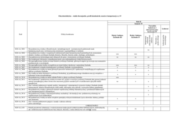 Okcydentalistyka – studia licencjackie, profil akademicki, macierz kompetencji, cz. IV Rok II Semestr IV 02O-1A_W01 02O-1A_W02 02O-1A_W03 02O-1A_W04 02O-1A_W05 02O-1A_W06 02O-1A_W07 02O-1A_W08 02O-1A_W09 02O-1A_W10 02O-1A_W11 02O-1A_W12 02O-1A_W13 02O-1A_W14 02O-1A_W15 02O-1A_W16 02O-1A_U01 Ma podstawową wiedzę o filozoficznych, metodologicznych i normatywnych podstawach nauk humanistycznych oraz ich historycznej zmienności i egzemplifikacji w kulturze. Ma podstawową wiedzę o wzajemnych zależnościach nauk humanistycznych potrzebnych do zrozumienia dziejów i kultury cywilizacji Zachodu (historia, filozofia, historia sztuki, etnologia, archeologia). Zna podstawową terminologię nauk służących do opisu i zrozumienia cywilizacji Zachodu. Ma świadomość złożoności, niejednoznaczności oraz niekompletności źródeł historycznych. Ma uporządkowaną wiedzę na temat historii cywilizacji Zachodu: głównych etapów jej rozwoju oraz momentów przełomowych w jej dziejach. Ma uporządkowaną wiedzę szczegółową na temat kultury duchowej i materialnej Zachodu. Ma świadomość związku teraźniejszości cywilizacji Zachodu z jej przeszłością. Ma podstawową wiedzę na temat głównych procesów kulturowych i społecznych modyfikujących współczesne oblicze cywilizacji Zachodu. Ma wiedzę na temat złożoności cywilizacji Zachodniej, jej problematycznego charakteru oraz jej związków z kulturami świata niezachodniego. Ma podstawową wiedzę na temat wkładu Polski w dzieje cywilizacji Zachodu. Ma świadomość i podstawową wiedzę na temat roli języka w rozwoju cywilizacji Zachodu jako pewnej jedności narracji porządkującej obraz świata oraz znaczenia języków narodowych w kształtowaniu specyfiki kultur narodowych. Zna i rozumie podstawowe metody analizy, interpretacji i reinterpretacji wytworów kultury Zachodu (źródeł historycznych, tekstów filozoficznych, dzieł sztuki, obyczajów oraz zjawisk i wytworów kultury popularnej). Ma podstawową wiedzę o głównych nurtach współczesnej refleksji humanistycznej i przełomach badawczych oraz interpretacyjnych w humanistyce. Ma podstawową wiedzę o instytucjach kultury zachodniej i ich kondycji oraz podstawową orientację we współczesnym życiu kulturalnym. Ma podstawową wiedzę na temat związków pomiędzy różnymi dziedzinami życia człowieka: kultury, polityki oraz ekonomii. Zna i rozumie podstawowe pojęcia i zasady z zakresu ochrony prawa autorskiego. UMIEJĘTNOŚCI Potrafi pozyskiwać informacje z wykorzystaniem tradycyjnych źródeł (zasobów bibliotecznych, archiwalnych), jak i elektronicznych (elektroniczne bazy danych, Internet), a także dokonywać ich selekcji 9 i oceny. Dzieje i kultura Zachodu III Dzieje i kultura Zachodu IV xx xxx xxx xx xx xx xxx x xxx x xx x x x x x x x x x xxx xx x x x x x xx xx x Lektorat Lektorat języka nowożytnego Efekty kształcenia Warsztaty z języka obcego Kod Interpretacja widowisk (obyczaj rytuał, zabawa) Narzędzia badawcze i interpretacyjnokrytyczne IV 02O-1A_U02 02O-1A_U03 02O-1A_U04 02O-1A_U05 02O-1A_U06 02O-1A_U07 02O-1A_U08 02O-1A_U09 02O-1A_U10 02O-1A_U11 02O-1A_U12 02O-1A_U13 02O-1A_U14 02O-1A_U15 02O-1A_U16 02O-1A_K01 02O-1A_K02 02O-1A_K03 02O-1A_K04 02O-1A_K05 02O-1A_K06 02O-1A_K07 02O-1A_K08 02O-1A_K09 02O-1A_K10 02O-1A_K11 Posiada podstawowe umiejętności formułowania problemów badawczych i interpretacyjnych oraz posiada podstawowe umiejętności zastosowania metod odpowiednich do badanego przedmiotu. Potrafi łączyć ze sobą nastawienia różnych dziedzin nauk humanistycznych i badać dany problem z perspektywy interdyscyplinarnej. Potrafi dokonać na poziomie podstawowym analizy, oceny i interpretacji zjawisk i wydarzeń z obszaru cywilizacji Zachodu. Posługuje się różnymi paradygmatami interpretacyjnymi i krytycznymi przy opisie i analizie zjawisk cywilizacji Zachodniej. Poprawnie stosuje terminologię odpowiednich nauk humanistycznych. Potrafi zidentyfikować różne wytwory cywilizacji Zachodu (źródła historyczne, teksty filozoficzne, obyczaje oraz zjawiska i wytwory kultury popularnej) i dokonać ich analizy, oceny oraz interpretacji na poziomie podstawowym. Potrafi umiejscowić badane zjawisko w odpowiednim kontekście historycznym, społecznym, kulturowym i ideowym. Posiada podstawowe umiejętności racjonalnej argumentacji oraz logicznego rozumowania. Posiada umiejętność opracowywania i prezentacji wyników badań przy użyciu tradycyjnych metod, jak i z wykorzystaniem narzędzi multimedialnych. Posiada podstawowe umiejętności pisania oraz redagowania tekstów naukowych takich jak esej, recenzja, referat w języku polskim oraz w języku obcym z uwzględnieniem specyfiki danej dziedziny humanistycznej. Posiada umiejętność formułowania wypowiedzi słownych charakteryzujących się kulturą logiczną i retoryczną oraz wzbogaconych o prezentację materiału ikonograficznego na różnych nośnikach informacji. Potrafi sformułować prostą wypowiedź ustną w języku obcym na zadany temat szczegółowy związany z dziejami i kulturą cywilizacji Zachodu. Posiada umiejętność przeprowadzenia prostego wywiadu naukowego ze specjalistą z danej dziedziny humanistyki w języku polskim i obcym, kierując się wskazówkami opiekuna naukowego. Potrafi samodzielnie zdobywać wiedzę oraz rozwijać umiejętności badawcze pisząc prace zaliczeniowe (w tym pracę dyplomową) oraz realizując proste projekty zespołowe. Ma umiejętności językowe właściwe dla studiów nad cywilizacją Zachodu, zgodne z wymaganiami określonymi dla poziomu B2 Europejskiego Systemu Opisu Kształcenia Językowego. KOMPETENCJE Zna zakres i charakter swojej wiedzy i rozumie potrzebę jej ciągłego pogłębiania oraz rozwijania umiejętności zawodowych. Potrafi współdziałać w grupie realizując proste zadania zespołowe oraz małe projekty. Potrafi planować oraz metodycznie realizować wyznaczone przez siebie lub innych zadania. Odznacza 