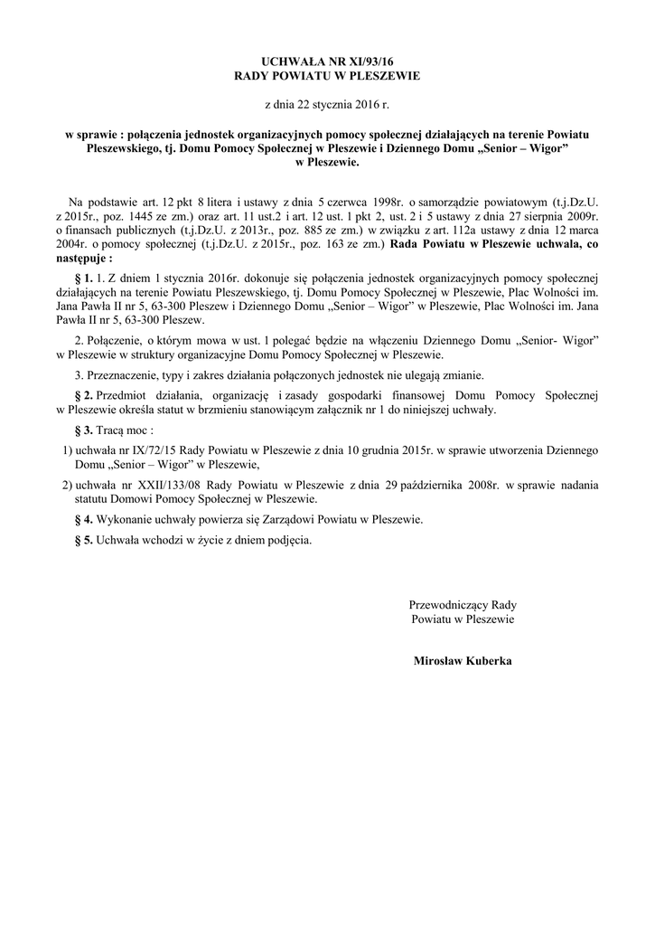 UCHWAŁA NR XI/93/16 RADY POWIATU W PLESZEWIE z dnia 22 stycznia 2016 r. w sprawie : połączenia jednostek organizacyjnych pomocy społecznej działających na terenie Powiatu Pleszewskiego, tj. Domu Pomocy Społecznej w Pleszewie i Dziennego Domu „Senior – Wigor” w Pleszewie. Na podstawie art. 12 pkt 8 litera i ustawy z dnia 5 czerwca 1998r. o samorządzie powiatowym (t.j.Dz.U. z 2015r., poz. 1445 ze zm.) oraz art. 11 ust.2 i art. 12 ust. 1 pkt 2, ust. 2 i 5 ustawy z dnia 27 sierpnia 2009r. o finansach publicznych (t.j.Dz.U. z 2013r., poz. 885 ze zm.) w związku z art. 112a ustawy z dnia 12 marca 2004r. o pomocy społecznej (t.j.Dz.U. z 2015r., poz. 163 ze zm.) Rada Powiatu w Pleszewie uchwala, co następuje : § 1. 1. Z dniem 1 stycznia 2016r. dokonuje się połączenia jednostek organizacyjnych pomocy społecznej działających na terenie Powiatu Pleszewskiego, tj. Domu Pomocy Społecznej w Pleszewie, Plac Wolności im. Jana Pawła II nr 5, 63-300 Pleszew i Dziennego Domu „Senior – Wigor” w Pleszewie, Plac Wolności im. Jana Pawła II nr 5, 63-300 Pleszew. 2. Połączenie, o którym mowa w ust. 1 polegać będzie na włączeniu Dziennego Domu „Senior- Wigor” w Pleszewie w struktury organizacyjne Domu Pomocy Społecznej w Pleszewie. 3. Przeznaczenie, typy i zakres działania połączonych jednostek nie ulegają zmianie. § 2. Przedmiot działania, organizację i zasady gospodarki finansowej Domu Pomocy Społecznej w Pleszewie określa statut w brzmieniu stanowiącym załącznik nr 1 do niniejszej uchwały. § 3. Tracą moc : 1) uchwała nr IX/72/15 Rady Powiatu w Pleszewie z dnia 10 grudnia 2015r. w sprawie utworzenia Dziennego Domu „Senior – Wigor” w Pleszewie, 2) uchwała nr XXII/133/08 Rady Powiatu w Pleszewie z dnia 29 października 2008r. w sprawie nadania statutu Domowi Pomocy Społecznej w Pleszewie. § 4. Wykonanie uchwały powierza się Zarządowi Powiatu w Pleszewie. § 5. Uchwała wchodzi w życie z dniem podjęcia. Przewodniczący Rady Powiatu w Pleszewie Mirosław Kuberka Załącznik do Uchwały Nr XI/93/16 Rady Powiatu w Pleszewie z dnia 22 stycznia 2016 r. Statut DOMU POMOCY SPOŁECZNEJ W PLESZEWIE Rozdział 1. Postanowienia ogólne § 1. Dom Pomocy Społecznej w Pleszewie zwany dalej „Domem” działa na podstawie: 1. Ustawy z dnia 12 marca 2004 r. o pomocy społecznej (Dz. U. z 2015 r., poz. 163 z późniejszymi zmianami). 2. Rozporządzenia Ministra Pracy i Polityki Społecznej z dnia 23 sierpnia 2012 r. w sprawie domów pomocy społecznej (Dz. U. z 2012 r., poz. 964). 3. Ustawy z dnia 19 sierpnia 1994 r. o ochronie zdrowia psychicznego (Dz. U. z 2011 r., nr 231, poz. 1375 z późniejszymi zmianami). 4. Przepisów prawnych dotyczących jednostek organizacyjnych pomocy społecznej, samorządowych jednostek organizacyjnych i jednostek budżetowych. 5. Ustawy z dnia 27 sierpnia 2009 r. o finansach publicznych (Dz. U. z 2013 r., poz. 885 z późniejszymi zmianami). § 2. 1. Dom działa pod nazwą „Dom Pomocy Społecznej w Pleszewie” i ma siedzibę w Pleszewie. 2. Dom jest jednostką organizacyjną samorządu terytorialnego podległą Radzie Powiatu. 3. Dom jest jednostką o zasięgu ponadlokalnym z wyłączeniem Działu Wsparcia Dziennego, o którym mowa w § 6 ust. 3 Rozdział 2. Organizacja i zasady działania § 3. 1. Domem kieruje Dyrektor, który jest odpowiedzialny za jego funkcjonowanie oraz pracę podległych pracowników. 2. W szczególności do zadań Dyrektora należy: a) ustalanie planów działalności Domu, b) kierowanie bieżącą działalnością Domu oraz nadzór nad gospodarką finansową i powierzonym majątkiem, c) reprezentowanie Domu na zewnątrz, d) prowadzenie polityki kadrowej w Domu, e) podejmowanie decyzji we wszystkich sprawach dotyczących Domu, f) utrzymanie w Domu obowiązującego standardu usług oraz czynienie starań w celu podniesienia jego poziomu. 3. Dyrektora Domu zatrudnia oraz rozwiązuje z nim umowę o pracę Zarząd Powiatu Pleszewskiego. § 4. 1. Dyrektor zarządza Domem przy pomocy: a) Głównego Księgowego, b) Kierowników Komórek Organizacyjnych. 2. Główny Księgowy, Kierownicy Komórek Organizacyjnych kierują działalnością bezpośrednio im podporządkowanych komórek organizacyjnych w zakresie ustalonym przez Dyrektora Domu w Regulaminie Organizacyjnym oraz zgodnie z indywidualnymi zakresami obowiązków, uprawnień i odpowiedzialności. § 5. Strukturę organizacyjną, ogólne zadania i organizację komórek wewnętrznych określa Regulamin Organizacyjny Domu zatwierdzony przez Zarząd Powiatu Pleszewskiego. Rozdział 3. Zakres i poziom świadczonych usług § 6. 1. Dom jest stacjonarną jednostką organizacyjną pomocy społecznej posiadającą 240 miejsc, z zastrzeżeniem ust. 3. 2. Dom przeznaczony jest dla osób dorosłych obojga płci, przewlekle somatycznie chorych oraz przewlekle psychicznie chorych, których stan zdrowia nie wymaga leczenia szpitalnego, a uzasadnia konieczność zapewnienia stałej opieki. 3. W strukturze Domu funkcjonuje Dział Wsparcia Dziennego – Dzienny Dom „Senior-Wigor” – zwany dalej Działem Wsparcia Dziennego, przeznaczony dla maksymalnie 30 osób w wieku 60+ nieaktywnych zawodowo z terenu Powiatu Pleszewskiego. 4. Zakres świadczonych usług Działu Wsparcia Dziennego określa § 9. Treść paragrafów 7 i 8 dotyczy Domu z wyłączeniem Działu Wsparcia Dziennego. § 7. 1. Do Domu kierowane są osoby, które ze względu na warunki rodzinne, wiek i sytuację życiową zakwalifikowane zostały do korzystania z tej formy pomocy. 2. Pobyt w Domu jest odpłatny. Zasady odpłatności za pobyt określają przepisy Ustawy o pomocy społecznej. § 8. 1. Dom zapewnia mieszkańcom całodobową opiekę oraz zaspakajanie ich indywidualnych niezbędnych potrzeb. 2. Zakres usług świadczonych przez Dom uwzględniający potrzeby i możliwości psychofizyczne mieszkańca obejmuje w szczególności: 1) w zakresie potrzeb bytowych zapewniając: - miejsce zamieszkan