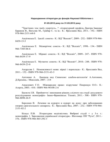 Надходження літератури до фондів Наукової бібліотеки з 01.05.2012 року по 31.05.2012 року "Трагічних тем твоїх упертість...": літературний профіль Дмитра Іванова/ Баранов В., Ватуляк М., Грабар С. та ін.- К.: Ярославів Вал, 2011.- 192.- ISBN 978-966-2151-64-0 Андієвська Е. Ідилії: сонети.- К.: ВД "Всесвіт", 2009.- 252.- ISBN 978-9668439-15-5 Андієвська Е. Межиріччя: сонети.- К.: ВД "Всесвіт", 1998.- 134.- ISBN 966-7305-06-6 Андієвська Е. Міражі: сонети.- К.: ВД "Всесвіт", 2009.- 247.- ISBN 978966-8439-17-9 Андієвська Е. Мутанти: сонети.- К.: ВД "Всесвіт", 2010.- 248.- ISBN 978966-8439-23-0 Андрусяк І. Неможливості мови: вірші і переклади.- К.: Ярославів Вал, 2011.- 152.- ISBN 978-966-2151-63-3 Антонюк А. Лампада над Синюхою: альбом-антологія/ А.Антонюк, Д.Кремінь.- Миколаїв, 2007.- 214 Анцелевич Г.О. Міжнародне право: підручник/ Покрещук О.О.- К.: Алерта, 2003.- 410.- ISBN 966-96108-2-6 Басиста І.В. Прийняття і виконання рішень слідчого на стадії досудового розслідування: монографія.- Івано-Франківськ: Тіповіт, 2011.- 500.- ISBN 978966-8098-26-9 Берсенев В. Лечение на курорте и курорт на дому: при заболеваниях опорно-двигательного аппарата.- К.: Ярославів Вал, 2007.- 232.- ISBN 978-9662151-02-2 Білоус П.В. Літературна медієвістика. Вибрані студії = у 3-х т.: монографія. 1. Зародження української літератури.- Житомир: ПП "Рута", 2011.376.- ISBN 978-966-465-292-3 Білоус П.В. Літературна медієвістика. Вибрані студії = у 3-х т.: ізборник. 2. Хужожній світ давньої української літератури.- Житомир: ПП "Рута", 2012.428.- ISBN 978-936-345-876-7 Білоус П.В. ПриСутність: поезія.- Житомир: ПП "Рута", 2011.- 288 Божок Г. Божий промисел від трипільців до Українців: Збірка поезій.Харків: ЛІДЕР, 2011.- 148.- ISBN 978-966-2432 Божок Г.І. Божий перомисел від трипільців до українців: громадянська світоглядна поезія.- Харків: Лідер, 2012.- 264.- ISBN 978-966-2732-01-6 Бондаренко С. Кирилиця київських вулиць: вірші.- К.: Ярославів Вал, 2011.- 140.- ISBN 978-966-2151-72-5 Бондаренко С.Г. От я вся - я свято, або Віхола лохів: роман для високочолих майже без убивств.- вид. 2-ге.- К.: Ярославів Вал, 2010.- 200.- ISBN 978-966-2151-12-1 Бохан В.Г. Технічні засоби справочинства: навч. посіб./ за заг. ред. Жуйкова В.Я.- К.: Ун-т "Україна", 2009.- 324.- ISBN 978-966-388-232-1 Венглінський Л. Твори: у 2-х т. 1. Вибрані поезії українською мовою.- К.: Ун-т "Україна", 2011.- 800.- ISBN 978-966-388-370-0 Вибори депутатів ВР АРК, місцевих рад та сільських, селищних, міських голів 31 жовтня 2010 року: інформаційне видання/ гол. ред. Шаповал В.М.- К.: Фенікс, 2011.- 844.- ISBN 978-966-651-903-3 Вибрані праці академіка В.І.Вернадського. 1. Володимир Іванович Вернадський і Україна. кн. 2. Вибрані праці/ авт.-укл.: Гавриленко І.М., Даниленко В.М., Дубровіна Л.А. та ін.- К.: НБУ ім. В.І.Вернадського, 2011.585.- ISBN 978-966-02-6293-5 Вибрані праці академіка В.І.Вернадського. 1. Володимир Іванович Вернадський і Україна. кн. 1. Науково-організаційна діяльність (1918 - 1921)/ авт.-укл.: Онищенко О.С., Дубровіна Л.А., Зубкова Н.М. та ін.- К.: НБУ ім. В.І.Вернадського, 2011.- 699.- ISBN 978-966-02-6293-5 Визначні постаті України: Андрій Чайковський та Теофіл Окуневський (до 150-річчя від дня народження): Збірник наукових праць, присвячених 150- річчя від дня народження А. Чайковського (2007) та Теофіла Окуневського (2008).- Львів: Афіша, 2010.- 309.- ISBN 978-966-02-5914-0 Вінценз С. На високій полонині.- Івано-Франківськ: Лілея-НВ, 2011.640.- ISBN 978-966-668-271-3 Вісник Львівської Національної Академії мистецтв/ Шмагало Р., Дацко О. та ін.- Спецвипуск 4.- Львів: ЛНАМ, 2007.- 351.- ISBN 0236-4832 Вольвач П. Вірші на розі: поезія.- К.: Ярославів Вал, 2010.- 64.- ISBN 978966-2151-56-5 Гірник П.М. Посвітається: поезії.- Хмельницький: Алли Цюпак, 2008.232.- ISBN 978-966-2180-50-3 Гончар Л. Козацький роман: п