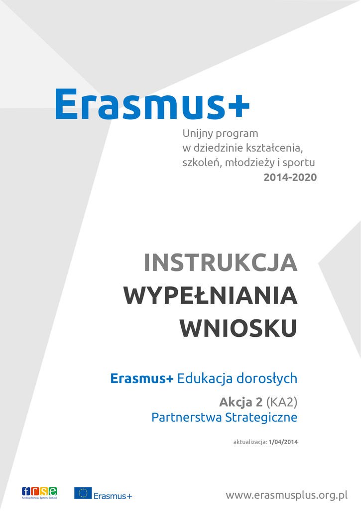 INSTRUKCJA WYPEŁNIANIA WNIOSKU Erasmus+ Edukacja dorosłych Akcja 2 (KA2) Partnerstwa Strategiczne aktualizacja: 1/04/2014 Instrukcja wypełniania wniosku o Partnerstwa Strategiczne (KA2) w edukacji dorosłych - Erasmus+ Spis treści Uwagi ogólne..................................................................................................................................................................... 3 B. Informacje o projekcie (Context) .................................................................................................................................. 3 B.1. Dane identyfikacyjne projektu (Project Identification) ..................................................................................... 3 B.2. Narodowa Agencja instytucji wnioskującej (National Agency of the Applicant Organisation) ....................... 4 C. Instytucje uczestniczące w projekcie (Participating organisation(s)) ........................................................................... 4 C.1. Instytucja wnioskująca (Applicant Organisation).............................................................................................. 4 C.1.3 Przedstawiciel prawny (Legal Representative)............................................................................................... 4 C.2./C.3. (itd.) Instytucja partnerska (Partner Organisation) ................................................................................... 4 D. Opis projektu (Description of the Project) ............................................................................................................. 5 F. Wdrażanie (Implementation) .................................................................................................................................... 5 F.2 Działania w ramach projektu (Project Activities) .............................................................................................. 5 F.2.1. Rezultaty pracy intelektualnej (Intellectual Outputs)...................................................................................... 5 F.2.2. Wydarzenia upowszechniające rezultaty pracy intelektualnej (Multiplier Events)......................................... 6 F.2.3. Działania związane z uczeniem się/nauczaniem/szkoleniami (Learning/Teaching/Training Activities) ......... 6 H. Budżet (Budget)..................................................................................................................................................... 7 H. 1. Zarządzanie projektem i jego wdrażanie (Project management and Implementation) ................................... 7 H. 2. Międzynarodowe spotkania projektowe (Transnational Project Meetings) .................................................... 7 H. 3. Rezultaty pracy intelektualnej (Intellectual Outputs) ....................................................................................... 8 H. 4. Wydarzenia upowszechniające rezultaty pracy intelektualnej (Multiplier events) .............................................. 8 H.5. Działania związane z uczeniem się/nauczaniem/szkoleniami (Learning/Teaching/Training Activities) .............. 8 H.5.1. Podróż (Travel) ................................................................................................................................................ 8 H.5.3. Wsparcie językowe (Linguistic support) ......................................................................................................... 9 I. H. 6. Specjalne potrzeby (Special needs) ................................................................................................................... 9 H. 7. Koszty nadzwyczajne (Exceptional costs) .......................................................................................................... 9 Streszczenie projektu (Project summary).................................................................................................................. 9 I.1 Instytucje uczestniczące (zestawienie) (Summary of participating organisations), I.2 Podsumowanie budżetu (Budget Summary) ........................................................................................................................................................ 9 I.2.1 Budżet projektu - całkowita kwota dofinansowania (Project Total Grant) ..................................................... 10 J. Lista kontrolna (Checklist), L. Oświadczenie (Declaration of honour).......................................................................... 10 M. Załączniki (Annexes) ................................................................................................................................................... 10 N. Złożenie wniosku (Submission) ................................................................................................................................... 11 2 Instrukcja wypełniania wniosku o Partnerstwa Strategiczne (KA2) w edukacji dorosłych - Erasmus+ Uwagi ogólne Przed rozpoczęciem wypełniania wniosku należy go zapisać na swoim komputerze i dopiero wówczas rozpocząć jego wypełnianie. Nie ma możliwości otwarcia i wypełnienia wniosku otwartego na stronie internetowej. Formularz wniosku można wypełnić tylko w Programie Adobe Reader. Zaleca się korzystanie z najnowszej wersji Programu, czyli 11.0, którą można pobrać ze strony: http://get.adobe.com/reader/otherversions/. INSTYTUCJA WNIOSKUJĄCA (BĘDĄCA KOORDYNATOREM CAŁEGO PROJEKTU) WYSYŁA ONLINE WNIOSEK WRAZ Z ZAŁĄCZNIKAMI, W IMIENIU CAŁEJ GRUPY PARTNERSKIEJ. Wypełniając wniosek, należy pamiętać o poniższych zasadach: W momencie o wpisywania numeru/numerów PIC do wniosku, o wypełniania części budżetowej wniosku, o składania ostatecznej wersji wniosku online musi być zapewniona stała łączność internetowa urządzenia (np. komputera), na którym wypełniany jest wniosek. eForm jest aktywnym formularzem wniosku, w którym niektóre pola pojawiają się, a niektóre znik