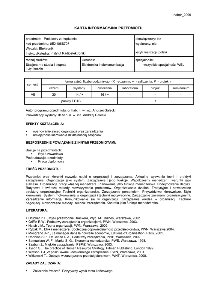 nabór_2009 KARTA INFORMACYJNA PRZEDMIOTU przedmiot: Podstawy zarządzania kod przedmiotu: 0EX106S707 Wydział: Elektroniki Instytut/Katedra: Instytut Radioelektroniki obowiązkowy: tak wybierany: nie rodzaj studiów: Stacjonarne studia I stopnia inżynierskie specjalność: wszystkie specjalności WEL semestr VII język realizacji: polski kierunek: Elektronika i telekomunikacja forma zajęć, liczba godzin/rygor (X -egzamin, + - zaliczenia, # - projekt) razem wykłady ćwiczenia laboratoria projekt seminarium 30 14 / + 16 / + - - - punkty ECTS 1 Autor programu przedmiotu: dr hab. n. w. inż. Andrzej Gałecki Prowadzący wykłady: dr hab. n. w. inż. Andrzej Gałecki EFEKTY KSZTAŁCENIA: opanowanie zasad organizacji oraz zarządzania umiejętność kierowania działalnością zespołów BEZPOŚREDNIE POWIĄZANIE Z INNYMI PRZEDMIOTAMI: Bazuje na przedmiotach: Etyka zawodowa Podbudowuje przedmioty: Praca dyplomowa TREŚĆ PRZEDMIOTU: Przedmiot oraz kierunki rozwoju nauki o organizacji i zarządzania. Aktualne wyzwania teorii i praktyki zarządzania. Organizacja jako system. Zarządzanie i jego funkcje. Współczesny menedżer i warunki jego sukcesu. Organizacja pracy własnej menedżera. Planowanie jako funkcja menedżerska. Podejmowanie decyzji. Rutynowe i twórcze metody rozwiązywania problemów. Organizowanie działań. Tradycyjne i nowoczesne struktury organizacyjne Techniki organizatorskie. Zarządzanie personelem. Przywództwo kierownicze. Style kierowania. System motywowania w organizacji i techniki motywacyjne. Zarządzanie zmianami organizacyjnymi. Zarządzanie informacją. Komunikowanie się w organizacji. Zarządzanie wiedzą w organizacji. Techniki negocjacji. Nowoczesne metody i techniki zarządzania. Kontrola jako funkcja menedżerska. LITERATURA: Drucker P.F., Myśli przewodnie Druckera, Wyd. MT Biznes, Warszawa, 2002. Griffin R.W., Podstawy zarządzania organizacjami, PWN, Warszawa, 2003. Hatch J.M., Teoria organizacji, PWN, Warszawa, 2002. Rybak M., Etyka menedżera. Społeczna odpowiedzialność przedsiębiorstwa, PWN, Warszawa,2004. Mongrand J-P., Le manager dans la nouvelle economie, Editions d’Organisation, Paris, 2001. Robbins S.P., DeCenzo D.A., Podstawy zarządzania, PWE, Warszawa, 2002. Samuelson W. F., Marks S. G., Ekonomia menedżerska, PWE, Warszawa, 1998. Szaban J., Miękkie zarządzanie, PSPiZ, Warszawa, 2003. Tyson S., The practice of Human Resource Strategy, Pitman Publishing, London 1999. Watson T.J.,W poszukiwaniu doskonałego zarządzania, PWN, Warszawa, 2001. Witkowski T., Decyzje w zarządzaniu przedsiębiorstwem, WNT, Warszawa, 2000. ZASADY ZALICZANIA: Zaliczenie ćwiczeń. Pozytywny wynik testu końcowego.