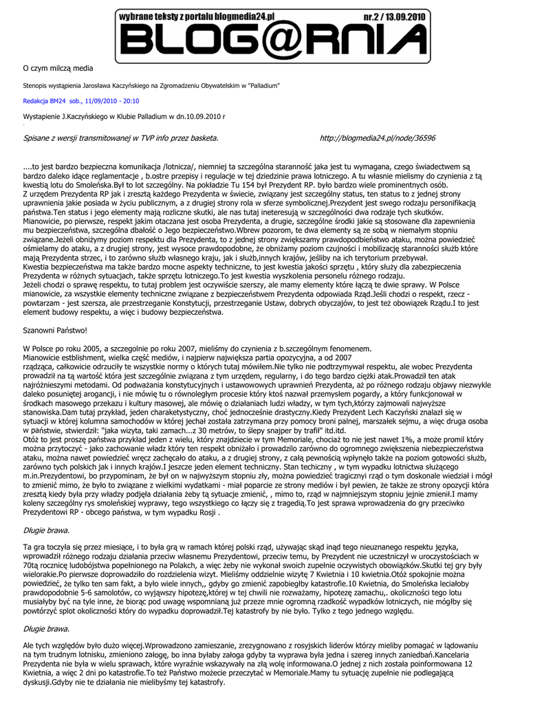 O czym milczą media Stenopis wystąpienia Jarosława Kaczyńskiego na Zgromadzeniu Obywatelskim w "Palladium" Redakcja BM24 sob., 11/09/2010 - 20:10 Wystapienie J.Kaczyńskiego w Klubie Palladium w dn.10.09.2010 r . Spisane z wersji transmitowanej w TVP info przez basketa. http://blogmedia24.pl/node/36596 ....to jest bardzo bezpieczna komunikacja /lotnicza/, niemniej ta szczególna staranność jaka jest tu wymagana, czego świadectwem są bardzo daleko idące reglamentacje , b.ostre przepisy i regulacje w tej dziedzinie prawa lotniczego. A tu własnie mielismy do czynienia z tą kwestią lotu do Smoleńska.Był to lot szczególny. Na pokładzie Tu 154 był Prezydent RP. było bardzo wiele prominentnych osób. Z urzędem Prezydenta RP jak i zresztą każdego Prezydenta w świecie, związany jest szczególny status, ten status to z jednej strony uprawnienia jakie posiada w życiu publicznym, a z drugiej strony rola w sferze symbolicznej.Prezydent jest swego rodzaju personifikacją państwa.Ten status i jego elementy mają rozliczne skutki, ale nas tutaj ineteresują w szczególności dwa rodzaje tych skutków. Mianowicie, po pierwsze, respekt jakim otaczana jest osoba Prezydenta, a drugie, szczególne środki jakie są stosowane dla zapewnienia mu bezpieczeństwa, szczególna dbałość o Jego bezpieczeństwo.Wbrew pozorom, te dwa elementy są ze sobą w niemałym stopniu związane.Jeżeli obniżymy poziom respektu dla Prezydenta, to z jednej strony zwiększamy prawdopodbieństwo ataku, można powiedzieć ośmielamy do ataku, a z drugiej strony, jest wysoce prawdopodobne, że obniżamy poziom czujności i mobilizację staranności służb które mają Prezydenta strzec, i to zarówno służb własnego kraju, jak i służb,innych krajów, jeśliby na ich terytorium przebywał. Kwestia bezpieczeństwa ma także bardzo mocne aspekty techniczne, to jest kwestia jakości sprzętu , który służy dla zabezpieczenia Prezydenta w różnych sytuacjach, także sprzętu lotniczego.To jest kwestia wyszkolenia personelu różnego rodzaju. Jeżeli chodzi o sprawę respektu, to tutaj problem jest oczywiście szerszy, ale mamy elementy które łączą te dwie sprawy. W Polsce mianowicie, za wszystkie elementy techniczne związane z bezpieczeństwem Prezydenta odpowiada Rząd.Jeśli chodzi o respekt, rzecz powtarzam - jest szersza, ale przestrzeganie Konstytucji, przestrzeganie Ustaw, dobrych obyczajów, to jest też obowiązek Rządu.I to jest element budowy respektu, a więc i budowy bezpieczeństwa. Szanowni Państwo! W Polsce po roku 2005, a szczegolnie po roku 2007, mieliśmy do czynienia z b.szczególnym fenomenem. Mianowicie estblishment, wielka część mediów, i najpierw największa partia opozycyjna, a od 2007 rządząca, całkowicie odrzuciły te wszystkie normy o których tutaj mówiłem.Nie tylko nie podtrzymywał respektu, ale wobec Prezydenta prowadził na tą wartość która jest szczególnie związana z tym urzędem, regularny, i do tego bardzo ciężki atak.Prowadził ten atak najróżnieszymi metodami. Od podważania konstytucyjnych i ustawowowych uprawnień Prezydenta, aż po różnego rodzaju objawy niezwykle daleko posuniętej arogancji, i nie mówię tu o równoległym procesie który ktoś nazwał przemysłem pogardy, a który funkcjonował w środkach masowego przekazu i kultury masowej, ale mówię o działaniach ludzi władzy, w tym tych,którzy zajmowali najwyższe stanowiska.Dam tutaj przykład, jeden charaketystyczny, choć jednocześnie drastyczny.Kiedy Prezydent Lech Kaczyński znalazł się w sytuacji w której kolumna samochodów w której jechał została zatrzymana przy pomocy broni palnej, marszałek sejmu, a więc druga osoba w państwie, stwierdził: "jaka wizyta, taki zamach...z 30 metrów, to ślepy snajper by trafił" itd.itd. Otóż to jest proszę państwa przykład jeden z wielu, który znajdziecie w tym Memoriale, chociaż to nie jest nawet 1%, a może promil który można przytoczyć - jako zachowanie władz który ten respekt obniżało i prowadzilo zarówno do ogromnego zwiększenia niebezpieczeństwa ataku, można nawet powiedzieć wręcz zachęcało do ataku, a z drugiej strony, z całą pewnością wpłynęło także na poziom gotowości służb, zarówno tych polskich jak i innych krajów.I jeszcze jeden element techniczny. Stan techiczny , w tym wypadku lotnictwa służącego m.in.Prezydentowi, bo przypominam, że był on w najwyższym stopniu zły, można powiedzieć tragicznyi rząd o tym doskonale wiedział i mógł to zmienić mimo, że było to związane z wielkimi wydatkami - miał poparcie ze strony mediów i był pewien, że także ze strony opozycji która zresztą kiedy była przy władzy podjęła działania żeby tą sytuacje zmienić, , mimo to, rząd w najmniejszym stopniu jejnie zmienił.I mamy koleny szczególny rys smoleńskiej wyprawy, tego wszystkiego co łączy się z tragedią.To jest sprawa wprowadzenia do gry przeciwko Prezydentowi RP - obcego państwa, w tym wypadku Rosji . Długie brawa. Ta gra toczyła się przez miesiące, i to była grą w ramach której polski rząd, używając skąd inąd tego nieuznanego respektu języka, wprowadził różnego rodzaju działania przeciw własnemu Prezydentowi, przeciw temu, by Prezydent nie uczestniczył w uroczystościach w 70tą rocznicę ludobójstwa popełnionego na Polakch, a więc żeby nie wykonał swoich zupełnie oczywistych obowiązków.Skutki tej gry były wielorakie.Po pierwsze doprowadziło do rozdzielenia wizyt. Mieliśmy oddzielnie wizytę 7 Kwietnia i 10 kwietnia.Otóż spokojnie można powiedzieć, że tylko ten sam fakt, a było wiele innych,, gdyby go zmienić zapobiegłby katastrofie.10 Kwietnia, do Smoleńska leciałoby prawdopodobnie 5-6 samolotów, co wyjąwszy hipotezę,której w tej chwili nie rozważamy, hipotezę zamachu,. okoliczności tego lotu musiałyby być na tyle inne, że biorąc pod uwagę wspomnianą już przeze mnie ogromną rzadkość wypadków l