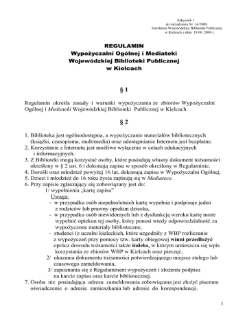 Załącznik 1 do zarządzenia Nr 34/2008 Dyrektora Wojewódzkiej Biblioteki Publicznej w Kielcach z dnia 19.06. 2008 r. REGULAMIN WypoŜyczalni Ogólnej i Mediateki Wojewódzkiej Biblioteki Publicznej w Kielcach §1 Regulamin określa zasady i warunki wypoŜyczania ze zbiorów WypoŜyczalni Ogólnej i Mediateki Wojewódzkiej Biblioteki Publicznej w Kielcach. §2 1. Biblioteka jest ogólnodostępna, a wypoŜyczanie materiałów bibliotecznych (ksiąŜki, czasopisma, multimedia) oraz udostępnianie Internetu jest bezpłatne. 2. Korzystanie z Internetu jest moŜliwe wyłącznie w celach edukacyjnych i informacyjnych. 3. Z Biblioteki mogą korzystać osoby, które posiadają własny dokument toŜsamości określony w § 2 ust. 6 i dokonują zapisu w sposób określony w Regulaminie. 4. Dorośli oraz młodzieŜ powyŜej 16 lat, dokonują zapisu w WypoŜyczalni Ogólnej. 5. Dzieci i młodzieŜ do 16 roku Ŝycia zapisują się w Mediatece. 6. Przy zapisie zgłaszający się zobowiązany jest do: 1/ wypełnienia „kartę zapisu” Uwaga: - w przypadku osób niepełnoletnich kartę wypełnia i podpisuje jeden z rodziców lub prawny opiekun dziecka, - w przypadku osób niewidomych lub z dysfunkcją wzroku kartę moŜe wypełnić opiekun tej osoby, który ponosi wtedy odpowiedzialność za wypoŜyczone materiały biblioteczne, - studenci (z uczelni kieleckich, które uzgodniły z WBP rozliczanie z wypoŜyczeń przy pomocy tzw. karty obiegowej winni przedłoŜyć oprócz dowodu toŜsamości takŜe indeks, w którym umieszcza się wpis korzystania ze zbiorów WBP w Kielcach oraz pieczęć, 2/ okazania dokumentu toŜsamości potwierdzającego miejsce stałego lub czasowego zameldowania, 3/ zapoznania się z Regulaminem wypoŜyczeń i złoŜenia podpisu na karcie zapisu oraz karcie bibliotecznej. 7. Osoba nie posiadająca adresu zameldowania zobowiązana jest złoŜyć pisemne oświadczenie o adresie zamieszkania lub adresie do korespondencji. 1 8. Czytelnik zobowiązany jest do informowania o zmianie danych osobowych: nazwiska, miejsca zamieszkania, miejsca stałego zameldowania, szkoły, uczelni 9. Czytelnik podając dane osobowe i podpisując kartę zapisu do Biblioteki. zobowiązuje się do przestrzegania Regulaminu i jednocześnie wyraŜa zgodę na przetwarzanie danych osobowych wyłącznie do celów realizacji zadań statutowych Biblioteki, określonych w Ustawie o bibliotekach. . §3 1. Administratorem danych osobowych czytelników jest Wojewódzka Biblioteka Publiczna, ul. Ściegiennego 13 25-033 Kielce. 2. Dane osobowe podlegają ochronie zgodnie z ustawą z dnia 29 sierpnia 1997 r. o ochronie danych osobowych (Dz.U.2002r.Nr 101.poz.926 z późn. zm.). 3. Czytelnikom przysługuje prawo wglądu do własnych danych osobowych. §4 1. Czytelnik otrzymuje bezpłatnie kartę biblioteczną waŜną na rok kalendarzowy, którą powinien kaŜdorazowo okazywać przy korzystaniu z Biblioteki. 2. PrzedłuŜenie waŜności karty bibliotecznej na rok kolejny następuje po zaktualizowaniu danych czytelnika. 3. Uprawnień wynikających z posiadania karty bibliotecznej nie wolno odstępować. 5. Właściciel karty bibliotecznej zobowiązany jest do jej chronienia przed zniszczeniem i zagubieniem oraz ponosi odpowiedzialność za kaŜde jej wykorzystanie. 6. Ewentualną utratę karty bibliotecznej, czytelnik powinien niezwłocznie zgłosić telefonicznie 041 34 453 84; 041 34 00 338 lub osobiście w Bibliotece. 7. Biblioteka nie ponosi odpowiedzialności za posługiwanie się kartą biblioteczną przez osoby trzecie, do czasu zgłoszenia zastrzeŜenia karty przez jej właściciela. W dniu wydania nowej karty czytelnik składa pisemne oświadczenie o jej utracie i zobowiązany jest do uregulowania ewentualnych zobowiązań wobec Biblioteki wynikających z utraty karty. 8. Za wydanie nowej karty bibliotecznej Biblioteka pobiera opłatę w wysokości 5 zł. 9. Niestosowanie się Czytelnika do powyŜszych ustaleń Regulaminu powoduje uniewaŜnienie karty bibliotecznej. §5 1. Mogą być wypoŜyczone: 1/ ksiąŜki wydane po 1950 roku, w tym dzieła zebrane (do 5 tomów), 2/ „ksiąŜki mówione” (nagrania na kasetach magnetofonowych oraz audiobooki), 3/ multimedia. 2. Zamawiając ksiąŜki przechowywane w magazynach, czytelnik zobowiązany jest wypełnić rewersy i złoŜyć je u dyŜurującego bibliotekarza. 2 3. Zamówienia do realizacji w dniu bieŜącym przyjmowane są nie później jak na 1 godzinę przed zamknięciem Biblioteki. Po tym czasie realizowane są dnia następnego. 4. Czas realizacji zamówień na ksiąŜki z magazynów jest uzaleŜniony od natęŜenia ruchu czytelniczego w danym dniu (jednak nie trwa dłuŜej niŜ 1 godzinę). 5. KsiąŜki zgromadzone w WypoŜyczalni Ogólnej oraz Mediatece udostępniane są w wolnym dostępie do półek. 6. Czytelnik korzystający ze zbioru w wolnym dostępie do półek zobowiązany jest do odkładania ksiąŜek wyjętych z półek na wskazane miejsce. 7. Egzemplarze ksiąŜek wypoŜyczane przez czytelnika rejestruje w bazie komputerowej dyŜurujący bibliotekarz. 8. Czytelnik nie moŜe wynosić ksiąŜek i multimediów poza WypoŜyczalnię Ogólną oraz Mediatekę bez uprzedniego zarejestrowania ich w bazie wypoŜyczeń. §6 1. Właściciel karty bibliotecznej moŜe wypoŜyczyć ksiąŜki lub media po okazaniu karty bibliotecznej. 2. Korzystający z Biblioteki moŜe wypoŜyczyć: 1/ 6 wol. ksiąŜek - studenci uczelni kieleckich (korzystający dodatkowo na podstawie indeksu zgodnie z § 2 ust. 6), 5 wol. ksiąŜek - inny czytelnik dorosły, 7 wol. ksiąŜek - dzieci i młodzieŜ do lat 16 - na okres nie dłuŜszy niŜ 4 tygodnie z moŜliwością prolongaty ich zwrotu), 2/ 2 media (filmy, muzyka) – czytelnik dorosły (na okres nie dłuŜszy niŜ 3 dni). Termin zwrotu multimediów nie podlega prolongacie), 3/ 3 tytuły „ksiąŜki mówionej” - osoby niewidome lub z dysfunkcją wzroku - na okres 8 tygodni). 4/ Pozostali czytelnicy mogą wypoŜyczyć nie wię