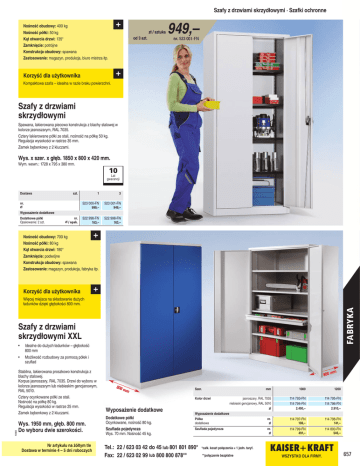 Szafy z drzwiami skrzydłowymi · Szafki ochronne Nośność obudowy: 400 kg Nośność półki: 50 kg Kąt otwarcia drzwi: 135° Zamknięcie: potrójne Konstrukcja obudowy: spawana Zastosowanie: magazyn, produkcja, biuro mistrza itp. zł / sztuka od 3 szt. 949,– nr. 523 001-FN Korzyść dla użytkownika Kompaktowa szafa – idealna w razie braku powierzchni. Szafy z drzwiami skrzydłowymi Spawana, lakierowana piecowo konstrukcja z blachy stalowej w kolorze jasnoszarym, RAL 7035. Cztery lakierowane półki ze stali, nośność na półkę 50 kg. Regulacja wysokości w rastrze 35 mm. Zamek bębenkowy z 2 kluczami. Wys. x szer. x głęb. 1850 x 800 x 420 mm. Wym. wewn.: 1728 x 795 x 380 mm. 10 Lat gwarancji Dostawa szt. nr. zł 1 3 523 000-FN 523 001-FN 522 998-FN 522 998-FN 999,– 949,– Wyposażenie dodatkowe Dodatkowe półki Opakowanie: 2 szt. nr. zł / opak. 163,– 163,– Nośność obudowy: 700 kg Nośność półki: 80 kg Kąt otwarcia drzwi: 180° Zamknięcie: podwójne Konstrukcja obudowy: spawana Zastosowanie: magazyn, produkcja, fabryka itp. Korzyść dla użytkownika FABRYKA BETRIEB Więcej miejsca na składowanie dużych ładunków dzięki głębokości 800 mm. Szafy z drzwiami skrzydłowymi XXL • Idealne do dużych ładunków – głębokość 800 mm • Możliwość rozbudowy za pomocą półek i szuflad 154882 Stabilna, lakierowana proszkowo konstrukcja z blachy stalowej. Korpus jasnoszary, RAL 7035. Drzwi do wyboru w kolorze jasnoszarym lub niebieskim gencjanowym, RAL 5010. Cztery ocynkowane półki ze stali. Nośność na półkę 80 kg. Regulacja wysokości w rastrze 25 mm. Zamek bębenkowy z 2 kluczami. Wys. 1950 mm, głęb. 800 mm. Do wyboru dwie szerokości. Nr artykułu na żółtym tle Dostawa w terminie 4 – 5 dni roboczych m 800 m 800 mm Szer. mm 1000 1200 jasnoszary, RAL 7035 niebieski gencjanowy, RAL 5010 zł 114 793-FN 114 794-FN 114 795-FN 114 796-FN 2.490,– 2.910,– Półka dodatkowa nr. zł 114 797-FN 114 798-FN Szuflada pojedyncza nr. zł 114 799-FN 114 800-FN Kolor drzwi Wyposażenie dodatkowe Dodatkowe półki Ocynkowane, nośność 80 kg. Szuflada pojedyncza Wys. 70 mm. Nośność 45 kg. Wyposażenie dodatkowe Tel.: 22 / 623 03 42 do 45 lub 801 801 890* Fax: 22 / 623 02 99 lub 800 800 878** *całk. koszt połączenia = 1 jedn. taryf. **połączenie bezpłatne 106,– 491,– 141,– 545,– KAISER + KRAFT WSZYSTKO DLA FIRMY. 657