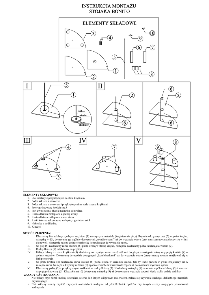 ELEMENTY SKŁADOWE: 1. Blat szklany z przyklejonym na stałe krąŜkiem 2. Półka szklana z otworem 3. Półka szklana z otworem i przyklejonymi na stałe trzema krąŜkami 4. Pręty gwintowane krótkie szt.3 5. Pręt gwintowany długi z nakrętką kontrującą 6. Rurka dłuŜsza zaślepiona z jednej strony 7. Rurka dłuŜsza zaślepiona z obu stron 8. Rurki krótsze zakończone zaślepką z gwintem szt.3 9. Nakrętka z podkładką 10. Kluczyk SPOSÓB ZŁOśENIA: I. Kładziemy blat szklany z jednym krąŜkiem (1) na czystym materiale (krąŜkiem do góry). Ręcznie wkręcamy pręt (5) w gwint krąŜka, nakrętką w dół, dokręcamy go ogólnie dostępnymi „kombinerkami” aŜ do wyczucia oporu (pręt musi zawsze znajdować się w linii pionowej). Następnie naleŜy dokręcić nakrętkę kontrującą aŜ do wyczucia oporu. II. Na pręt (5) nakładamy rurkę dłuŜszą (6) pustą stroną w stronę krąŜka, następnie nakładamy półkę szklaną z otworem (2). III. Rurkę dłuŜszą (7) nakładamy na pręt (5). IV. Półkę szklaną z trzema krąŜkami (3) kładziemy na czystym materiale (krąŜkami do góry), a następnie wkręcamy pręty krótkie (4) w gwinty krąŜków. Dokręcamy je ogólnie dostępnymi „kombinerkami” aŜ do wyczucia oporu (pręty muszą zawsze znajdować się w linii pionowej). V. Na pręty krótkie (4) nakładamy rurki krótkie (8) pustą stroną w kierunku krąŜka, tak by trafić prętem w gwint znajdujący się w zaślepce rurki. Następnie kręcimy rurkami (8) zgodnie z ruchem wskazówek zegara aŜ do momentu wyczucia oporu. VI. Kładziemy półkę (3) z przykręconymi nóŜkami na rurkę dłuŜszą (7). Nakładamy nakrętkę (9) na otwór w półce szklanej (3) i zarazem na pręt gwintowany (5). Kluczykiem (10) dokręcamy nakrętkę (9) aŜ do momentu wyczucia oporu i kiedy stolik będzie stabilny. ZASADY UśYTKOWANIA: - Nie naleŜy myć nóŜek mokrą, ścierającą ścierką lub innym wilgotnym materiałem, zaleca się uŜywanie suchego, delikatnego materiału czyszczącego - Blat szklany naleŜy czyścić czystymi materiałami wolnymi od jakichkolwiek opiłków czy innych rzeczy mogących powodować zadrapania