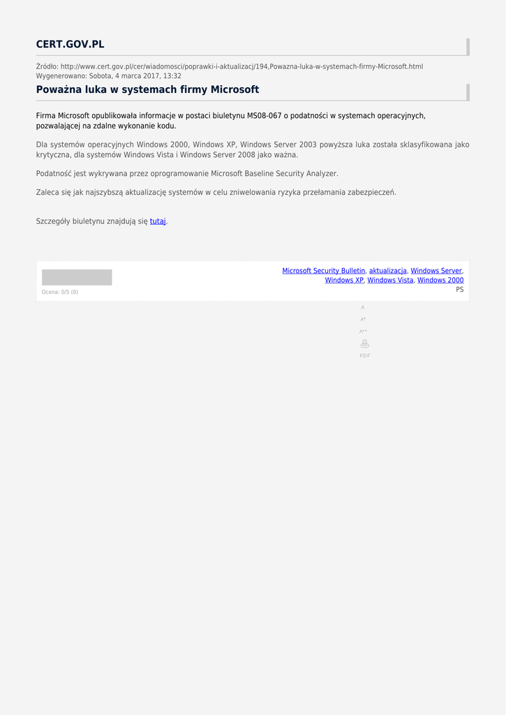 CERT.GOV.PL Źródło: http://www.cert.gov.pl/cer/wiadomosci/poprawki-i-aktualizacj/194,Powazna-luka-w-systemach-firmy-Microsoft.html Wygenerowano: Sobota, 4 marca 2017, 13:32 Poważna luka w systemach firmy Microsoft Firma Microsoft opublikowała informacje w postaci biuletynu MS08-067 o podatności w systemach operacyjnych, pozwalającej na zdalne wykonanie kodu. Dla systemów operacyjnych Windows 2000, Windows XP, Windows Server 2003 powyższa luka została sklasyfikowana jako krytyczna, dla systemów Windows Vista i Windows Server 2008 jako ważna. Podatność jest wykrywana przez oprogramowanie Microsoft Baseline Security Analyzer. Zaleca się jak najszybszą aktualizację systemów w celu zniwelowania ryzyka przełamania zabezpieczeń. Szczegóły biuletynu znajdują się tutaj. Ocena: 0/5 (0) Microsoft Security Bulletin, aktualizacja, Windows Server, Windows XP, Windows Vista, Windows 2000 PS