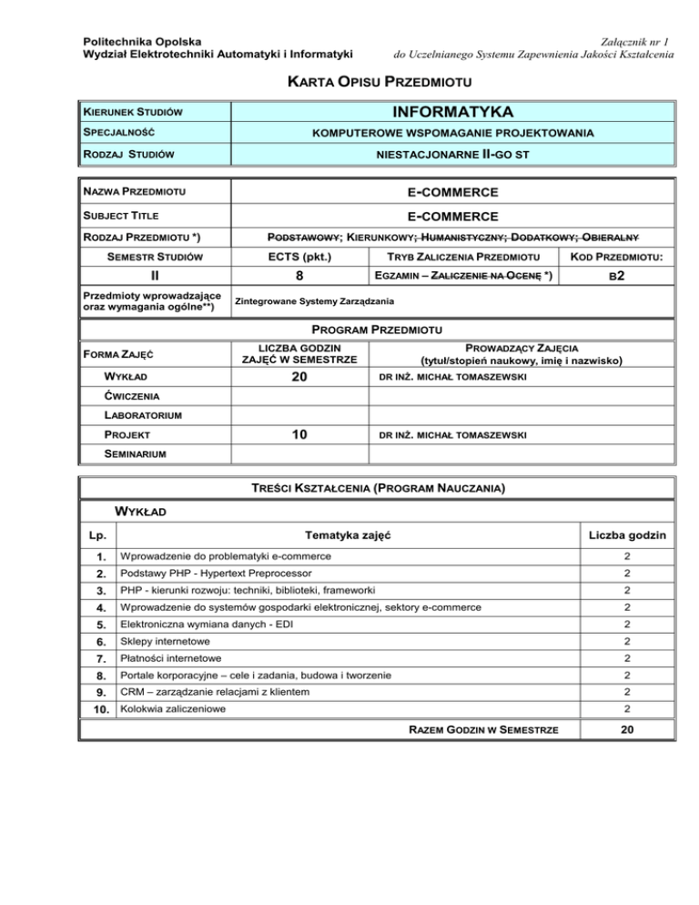 Politechnika Opolska Wydział Elektrotechniki Automatyki i Informatyki Załącznik nr 1 do Uczelnianego Systemu Zapewnienia Jakości Kształcenia KARTA OPISU PRZEDMIOTU INFORMATYKA KIERUNEK STUDIÓW SPECJALNOŚĆ KOMPUTEROWE WSPOMAGANIE PROJEKTOWANIA NIESTACJONARNE II-GO ST RODZAJ STUDIÓW NAZWA PRZEDMIOTU E-COMMERCE SUBJECT TITLE E-COMMERCE RODZAJ PRZEDMIOTU *) PODSTAWOWY; KIERUNKOWY; HUMANISTYCZNY; DODATKOWY; OBIERALNY SEMESTR STUDIÓW ECTS (pkt.) TRYB ZALICZENIA PRZEDMIOTU KOD PRZEDMIOTU: II 8 EGZAMIN – ZALICZENIE NA OCENĘ *) B2 Przedmioty wprowadzające oraz wymagania ogólne**) Zintegrowane Systemy Zarządzania PROGRAM PRZEDMIOTU FORMA ZAJĘĆ WYKŁAD PROWADZĄCY ZAJĘCIA (tytuł/stopień naukowy, imię i nazwisko) LICZBA GODZIN ZAJĘĆ W SEMESTRZE 20 DR INś. MICHAŁ TOMASZEWSKI 10 DR INś. MICHAŁ TOMASZEWSKI ĆWICZENIA LABORATORIUM PROJEKT SEMINARIUM TREŚCI KSZTAŁCENIA (PROGRAM NAUCZANIA) WYKŁAD Lp. Tematyka zajęć Liczba godzin 1. Wprowadzenie do problematyki e-commerce 2 2. Podstawy PHP - Hypertext Preprocessor 2 3. PHP - kierunki rozwoju: techniki, biblioteki, frameworki 2 4. Wprowadzenie do systemów gospodarki elektronicznej, sektory e-commerce 2 5. Elektroniczna wymiana danych - EDI 2 6. Sklepy internetowe 2 7. Płatności internetowe 2 8. Portale korporacyjne – cele i zadania, budowa i tworzenie 2 9. CRM – zarządzanie relacjami z klientem 2 10. Kolokwia zaliczeniowe 2 RAZEM GODZIN W SEMESTRZE 20 Nazwa przedmiotu PROJEKT Lp. Tematyka zajęć Liczba godzin 1. Wykonanie projektów z zakresu zagadnień poruszanych na wykładzie 8 2. Kolokwia sprawdzające 2 RAZEM GODZIN W SEMESTRZE 10 ZAŁOśENIA I CELE PRZEDMIOTU: Przedstawienie problematyki e-commerce: rozwiązań, technologii, systemów, narzędzi. Przedstawienie rozwiązań funkcjonujących w sektorach B2B oraz B2C. Portale korporacyjne – cele i zadania, budowa i tworzenie. METODY DYDAKTYCZNE: Wykład, Projekt FORMA I WARUNKI ZALICZENIA PRZEDMIOTU: wykład: zaliczany w formie pisemnej; projekt: ocena samodzielnie rozwiązywanych zadań problemowych LITERATURA PODSTAWOWA: 1) 2) 3) 4) 5) 6) 7) 8) 9) Afuah A., Tucci C., Internet business models and strategies, Oficyna Ekonomiczna , 2003 Barrow C., Biznes w sieci (How to Survive the E-Business Downturn), FELBERG , 2006 Guziur P., Marketing w Internecie. Strategie dla małych i duŜych firm, Helion, Gliwice 2001 Hartman A., Sifonis J., Kador J., E-biznes. Strategie sukcesu w gospodarce internetowej, K.E. Liber, Warszawa 2001 Köhler T., Best R., Electronic Commerce, CeDeWu, Warszawa 2001 Kyciak W., Przeliorz K., Jak załoŜyć skuteczny i dochodowy sklep internetowy, Helion, Gliwice, 2006 Niedźwiedziński M., Globalny handel elektroniczny, PWN , Warszawa, 2004 Norris M., West S., E-biznes, WKŁ, Warszawa 2001 Teluk T., E-biznes. Nowa gospodarka, One Press , 2002 LITERATURA UZUPEŁNIAJĄCA: 1) 2) Welling L., Thomson L., PHP i MySQL. Tworzenie stron WWW. Vademecum profesjonalisty, Helion, 2005 Greenspan J. , Bulger B., MySQL/PHP Database Applications, M&T Books, 2004 *) niewłaściwe przekreślić – zgodnie z arkuszem planu studiów, **) podać wybrane nazwy przedmiotów stanowiących wprowadzenie/uzupełnienie do przedmiotu opisywanego, oraz zakres wiadomości/umiejętności/kompetencji jakie powinien posiadać student przed rozpoczęciem nauki tego przedmiotu; ............................................................................. ................................................. (Kierownik jednostki organizacyjnej/bezpośredni przełoŜony: pieczęć/podpis) (Dziekan Wydziału …………………: pieczęć/podpis) 2