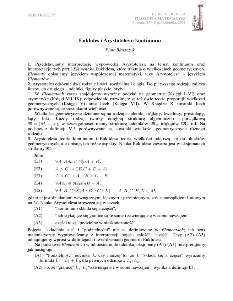 III KONFERENCJA FILOZOFIA MATEMATYKI Poznań, 17-18 października 2011 ABSTRAKTY Euklides i Arystoteles o kontinuum Piotr Błaszczyk 1. Przedstawiamy interpretację wypowiedzi Arystotelesa na temat kontinuum oraz interpretację tych partii Elementów Euklidesa, które traktują o wielkościach geometrycznych. Elementy opisujemy językiem współczesnej matematyki, tezy Arystotelesa – językiem Elementów. 2. Arystoteles odróżnia dwa rodzaje ilości: rozdzielną i ciągłą. Do pierwszego rodzaju zalicza liczby, do drugiego – odcinki, figury płaskie, bryły. W Elementach zrazu znajdujemy wyraźny podział na geometrię (Księgi I–VI) oraz arytmetykę (Księgi VII–IX); odpowiednio rozwinięte są też dwie teorie proporcji: wielkości geometrycznych (Księga V) oraz liczb (Księga VII). W Księdze X stosunki liczb porównywane są ze stosunkami wielkości. Wielkości geometryczne dzielone są na rodzaje: odcinki, trójkąty, kwadraty, prostokąty, kąty, łuki. Każdy rodzaj tworzy odrębną strukturę algebraiczno- -porządkową , w szczególności mamy strukturę odcinków , trójkątów , itd. Na podstawie definicji V.5 porównywane są stosunki wielkości geometrycznych różnego rodzaju. 3. Arystotelesa teoria kontinuum i Euklidesa teoria wielkości odnoszą się do obiektów geometrycznych, ale opisują ich różne aspekty. Nauka Euklidesa zawarta jest w aksjomatach struktury : 0mm (E1) , (E2) , (E3) , (E4) , (E5) , gdzie jest działaniem wewnętrznym, łącznym i przemiennym, zaś na . Nauka Arystotelesa streszcza się w tezach: (A1) “kontinuum składa się z części", porządkiem liniowym (A2) “ich stykające się granice są te same i zawierają się w sobie nawzajem", (A3) części te są “podzielne w nieskończoność". Pojęcia “składania się" i “podzielności" nie są definiowane w Elementach; ich sens matematyczny wyprowadzamy z interpretacji pojęć “całość", “część". Tezy (A2)–(A3) odnajdujemy wprost w definicjach i twierdzeniach geometrii Euklidesa. Na podstawie Elementów i w odniesieniu do odcinka, aksjomaty (A1)-(A3) interpretujemy jak następuje: (A1) “Podzielność" odcinka , czy inaczej to, że “składa się z części" wyrażamy formułą , dla pewnych odcinków . (A2) To, że “granice" “zawierają się w sobie nawzajem" wynika z definicji I.3. ABSTRAKTY III KONFERENCJA FILOZOFIA MATEMATYKI Poznań, 17-18 października 2011 (A3) “Nieskończona podzielność" oznacza, że każda z “części" być przedstawiona podobnie jak , tj. , Dowód tego faktu zawiera twierdzenie I.10. może . 4. Modelowym przykładem kontinuum tak dla Arystotelesa, jak i Euklidesa jest odcinek. Charakterystyka (A1)–(A3) jest zapisem przekonań dotyczących budowy odcinka. Aksjomaty (E1)–(E5) natomiast charakteryzują nie pojedynczy odcinek, ale strukturę odcinków. Pokazujemy, że we współczesnej matematyce podejście Arystotelesa znajduje kontynuację w topologicznej charakterystyce kontinuum [Cantor 1883], zaś Euklidesa opis struktury odcinków znalazł rozwinięcie w pojęciu ciała uporządkowanego [Hilbert 1900] i grupy uporządkowanej [Weber 1895], [Hölder 1901]. Ten drugi wątek związany jest wykształceniem się nowego modelu kontinuum jakim jest ciało uporządkowane w sposób ciągły. Literatura 1. Bekker I. (ed.), Aristotelis Opera, Berlin 1831. 2. Cantor G., Über unendliche lineare Punktmannigfaltigkeiten, 1883; O nieskończonych liniowych rozmaitościach punktowych, §9-10, tł. J. Pogonowski, Poznań 2010 (maszynopis). 3. Euklides, Elementy, Księgi V–VI, tł. P. Błaszczyk, K. Mrówka, Kraków 2011 (maszynopis). 4. Heiberg J.L. (ed.), Euclidis Elementa, Leipzig 1883-1885. 5. Hilbert D., Über den Zahlbegrieff, 1900; O pojęciu liczby, tł. J. Pogonowski, [w:] Annales Universitatis Paedagogicae Cracoviensis. Studia ad Didacticam Mathematicae Pertinentia IV, 2011; http://www.up.krakow.pl/mat/annal-dyd/. 6. Hölder O., Die Axiome der Quantität und die Lehre vom Mass, 1901. 7. Weber H., Lehrbuch der Algebra. Einleitung, Braunschweig 1895; Podręcznik Algebry. Wprowadzenie, tł. J. Pogonowski, Poznań 2010 (maszynopis).