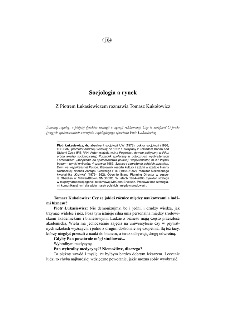 104 Socjologia a rynek Z Piotrem Łukasiewiczem rozmawia Tomasz Kukołowicz Dawniej socjolog, a później dyrektor strategii w agencji reklamowej. Czy to możliwe? O praktycznych zastosowaniach warsztatu socjologicznego opowiada Piotr Łukasiewicz. Piotr Łukasiewicz, dr; absolwent socjologii UW (1978), doktor socjologii (1986, IFiS PAN, promotor Andrzej Siciński); do 1992 r. związany z Zakładem Badań nad Stylami Życia IFiS PAN. Autor książek, m.in.: Pogłoska i dowcip polityczny w PRL: próba analizy socjologicznej, Porządek społeczny w potocznych wyobrażeniach i przekazach: (spojrzenie na społeczeństwo polskie); współredaktor, m.in.: Wyniki badań – wyniki wyborów: 4 czerwca 1989, Szanse i zagrożenia polskich przemian, Dom we współczesnej Polsce. Kierownik resortu kultury i sztuki w rządzie Hanny Suchockiej; członek Zarządu Głównego PTS (1988–1992), redaktor niezależnego kwartalnika „Krytyka” (1979–1992). Obecnie Brand Planning Director w zespole Obsidian w MillwardBrown SMG/KRC. W latach 1994–2008 dyrektor strategii w międzynarodowej agencji reklamowej McCann Erickson. Pracował nad strategiami komunikacyjnymi dla wielu marek polskich i międzynarodowych. Tomasz Kukołowicz: Czy są jakieś różnice między naukowcami a ludźmi biznesu? Piotr Łukasiewicz: Nie demonizujmy, bo i jedni, i drudzy wiedzą, jak trzymać widelec i nóż. Poza tym istnieje silna unia personalna między środowiskami akademickimi i biznesowymi. Ludzie z biznesu mają często przeszłość akademicką. Wielu ma jednocześnie zajęcia na uniwersytecie czy w prywatnych szkołach wyższych, i jedno z drugim doskonale się uzupełnia. Są też tacy, którzy niegdyś przeszli z nauki do biznesu, a teraz odbywają drogę odwrotną. Gdyby Pan powtórnie mógł studiować... Wybrałbym medycynę. Pan wybrałby medycynę?! Niemożliwe, dlaczego? To piękny zawód i myślę, że byłbym bardzo dobrym lekarzem. Leczenie ludzi to chyba najbardziej wdzięczne powołanie, jakie można sobie wyobrazić. Z Piotrem Łukasiewiczem rozmawia Tomasz Kukołowicz 105 Czym kierował się Pan wybierając socjologię? To był okres głębokiego PRL-u. Miałem dosyć mylne wrażenie, że socjolog może uzyskać wpływ na życie społeczne. Myśl, że ktoś poza władzą komunistyczną mógłby mieć wpływ na sprawy publiczne, to była oczywiście mrzonka. Ale tak to sobie wymyśliłem. A druga rzecz: socjologia i życie naukowe było sferą, w której panowała względna swoboda i gdzie byli przyzwoici ludzie. Generalnie jednak zawsze byłem bardziej zainteresowany życiem społecznym niż socjologią jako nauką. Byłem socjologiem o tyle, o ile socjologia była związana z tym, co dzieje się w społeczeństwie. A jak rozpoczął Pan pracę w biznesie? Pracowałem w Polskiej Akademii Nauk przez dwanaście lat, w Zakładzie Badań nad Stylami Życia. Następnie poszedłem do administracji publicznej, byłem wiceministrem kultury w rządzie Jana Olszewskiego i Hanny Suchockiej. Potem nie chciałem już wracać do nauki. Bardziej interesowała mnie praktyka społeczna niż teoretyzowanie na temat praktyki. Zwłaszcza wtedy nauka wydawała mi się trochę oderwana od tego, co było najbardziej ciekawe i dynamiczne w Polsce. To był rok 1994. Wciągnął mnie biznes. Czy warsztat socjologa można wykorzystać w biznesie? Można tu mówić o dwóch aspektach. O warsztacie socjologa w wąskim rozumieniu, czyli o technikach badawczych – i te są jak najbardziej używane w badaniach komercyjnych. Komercyjny sondaż na temat spożycia coca-coli lub ryb jest robiony podobnie jak sondaż na wydziale socjologii na temat rozkładu postaw społecznych. Druga rzecz to jest duch socjologii jako nauki, podejście charakterystyczne dla tej nauki. Na pewno pomocne może być to, że socjologowie potrafią myśleć w kategoriach praw i zależności o zachowaniach ludzi, o ich postawach, o dynamice instytucji. Potrafimy generalizować z przypadków jednostkowych na przypadki szersze. Znamy też ograniczenia generalizacji. Barierę może natomiast stanowić nadmierna skłonność do rozdzielania racji oraz przeświadczenie, że każde zjawisko można zinterpretować na więcej niż jeden sposób. To w biznesie raczej utrudnia życie, a nie ułatwia. Jaki jest problem z tym szukaniem więcej niż jednej racji? Czy mógłby Pan rozwinąć tę myśl. Zachowania ludzkie nie podlegają jednolitym algorytmom jak w matematyce. Empiria podpowiada, że w rozmaitych sytuacjach ludzie mogą się różnie zachowywać. Dla biznesu taka odpowiedź nie jest wystarczająca, bo biznes musi przyjąć twarde założenia, żeby zaplanować działania. Tutaj jest potrzebna większa jednoznaczność. Jakie są różnice między badaniami komercyjnymi i naukowymi? Przede wszystkim jest znacznie większa presja czasu. W tradycyjnie prowadzonych badaniach socjologicznych, do których byłem przyzwyczajony, czas nie odgrywał większej roli. Po prostu było tyle czasu, ile trzeba. Nikt się 106 Socjologia a rynek nie spieszył. Można było zaplanować i roztrząsać wszystkie etapy, pilotaże, procesowanie danych. To jest w badaniach komercyjnych nie do pomyślenia. Wszystko odbywa się pod niesłychaną presją i wszystko musi być na czas. Gdy po paru latach miałem okazję wrócić do tempa pracy w nauce, ta różnica najbardziej mnie uderzyła. Druga różnica to mniejszy rygoryzm metodologiczny. Ja jeszcze jestem wychowany w szkole profesora Stefana Nowaka. Poprawność metodologiczna to była kardynalna zasada, od której nie było odstępstw. Teraz, między innymi z powodu ograniczeń czasowych i finansowych, często nie ma dostatecznie dużo czasu na zrobienie pilotażu czy na budowanie superrzetelnego kwestionariusza. Następna różnica to większa swoboda snucia hipotez, wyciągania śmiałych wniosków, inaczej mówiąc: większy wsad interpretacyjny w badaniach komercyjnych. To, co w raportach naukowych byłoby podawane albo ze 