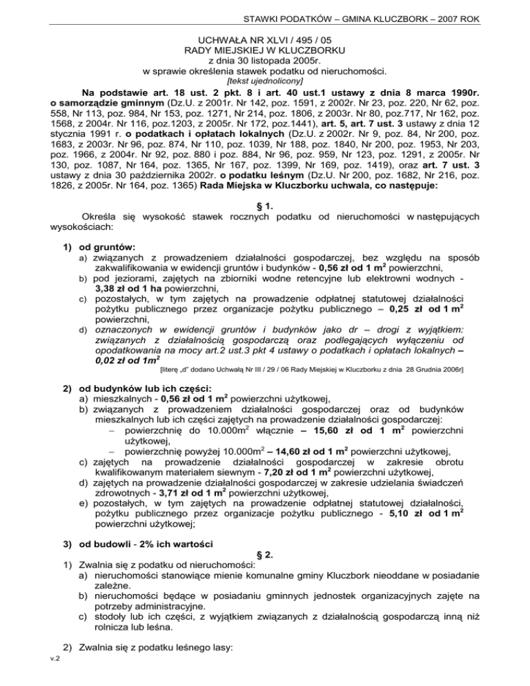 STAWKI PODATKÓW – GMINA KLUCZBORK – 2007 ROK UCHWAŁA NR XLVI / 495 / 05 RADY MIEJSKIEJ W KLUCZBORKU z dnia 30 listopada 2005r. w sprawie określenia stawek podatku od nieruchomości. [tekst ujednolicony] Na podstawie art. 18 ust. 2 pkt. 8 i art. 40 ust.1 ustawy z dnia 8 marca 1990r. o samorządzie gminnym (Dz.U. z 2001r. Nr 142, poz. 1591, z 2002r. Nr 23, poz. 220, Nr 62, poz. 558, Nr 113, poz. 984, Nr 153, poz. 1271, Nr 214, poz. 1806, z 2003r. Nr 80, poz.717, Nr 162, poz. 1568, z 2004r. Nr 116, poz.1203, z 2005r. Nr 172, poz.1441), art. 5, art. 7 ust. 3 ustawy z dnia 12 stycznia 1991 r. o podatkach i opłatach lokalnych (Dz.U. z 2002r. Nr 9, poz. 84, Nr 200, poz. 1683, z 2003r. Nr 96, poz. 874, Nr 110, poz. 1039, Nr 188, poz. 1840, Nr 200, poz. 1953, Nr 203, poz. 1966, z 2004r. Nr 92, poz. 880 i poz. 884, Nr 96, poz. 959, Nr 123, poz. 1291, z 2005r. Nr 130, poz. 1087, Nr 164, poz. 1365, Nr 167, poz. 1399, Nr 169, poz. 1419), oraz art. 7 ust. 3 ustawy z dnia 30 października 2002r. o podatku leśnym (Dz.U. Nr 200, poz. 1682, Nr 216, poz. 1826, z 2005r. Nr 164, poz. 1365) Rada Miejska w Kluczborku uchwala, co następuje: § 1. Określa się wysokość stawek rocznych podatku od nieruchomości w następujących wysokościach: 1) od gruntów: a) związanych z prowadzeniem działalności gospodarczej, bez względu na sposób zakwalifikowania w ewidencji gruntów i budynków - 0,56 zł od 1 m2 powierzchni, b) pod jeziorami, zajętych na zbiorniki wodne retencyjne lub elektrowni wodnych 3,38 zł od 1 ha powierzchni, c) pozostałych, w tym zajętych na prowadzenie odpłatnej statutowej działalności pożytku publicznego przez organizacje pożytku publicznego – 0,25 zł od 1 m2 powierzchni, d) oznaczonych w ewidencji gruntów i budynków jako dr – drogi z wyjątkiem: związanych z działalnością gospodarczą oraz podlegających wyłączeniu od opodatkowania na mocy art.2 ust.3 pkt 4 ustawy o podatkach i opłatach lokalnych – 0,02 zł od 1m2 [literę „d” dodano Uchwałą Nr III / 29 / 06 Rady Miejskiej w Kluczborku z dnia 28 Grudnia 2006r] 2) od budynków lub ich części: a) mieszkalnych - 0,56 zł od 1 m2 powierzchni użytkowej, b) związanych z prowadzeniem działalności gospodarczej oraz od budynków mieszkalnych lub ich części zajętych na prowadzenie działalności gospodarczej: − powierzchnię do 10.000m2 włącznie – 15,60 zł od 1 m2 powierzchni użytkowej, − powierzchnię powyżej 10.000m2 – 14,60 zł od 1 m2 powierzchni użytkowej, c) zajętych na prowadzenie działalności gospodarczej w zakresie obrotu kwalifikowanym materiałem siewnym - 7,20 zł od 1 m2 powierzchni użytkowej, d) zajętych na prowadzenie działalności gospodarczej w zakresie udzielania świadczeń zdrowotnych - 3,71 zł od 1 m2 powierzchni użytkowej, e) pozostałych, w tym zajętych na prowadzenie odpłatnej statutowej działalności, pożytku publicznego przez organizacje pożytku publicznego - 5,10 zł od 1 m2 powierzchni użytkowej; 3) od budowli - 2% ich wartości § 2. 1) Zwalnia się z podatku od nieruchomości: a) nieruchomości stanowiące mienie komunalne gminy Kluczbork nieoddane w posiadanie zależne. b) nieruchomości będące w posiadaniu gminnych jednostek organizacyjnych zajęte na potrzeby administracyjne. c) stodoły lub ich części, z wyjątkiem związanych z działalnością gospodarczą inną niż rolnicza lub leśna. 2) Zwalnia się z podatku leśnego lasy: v.2 STAWKI PODATKÓW – GMINA KLUCZBORK – 2007 ROK a) stanowiące mienie komunalne gminy Kluczbork nieoddane w posiadanie zależne, b) będące w posiadaniu gminnych jednostek organizacyjnych. § 3. Traci moc Uchwała Nr XXXII/310/04 Rady Miejskiej w Kluczborku z dnia 30 listopada 2004r. w sprawie określenia stawek podatku od nieruchomości. § 4. Wykonanie niniejszej uchwały powierza się Burmistrzowi Miasta Kluczborka. § 5. Uchwała wchodzi w życie po upływie 14 dni od ogłoszenia w Dzienniku Urzędowym Województwa Opolskiego z mocą obowiązującą od 1 stycznia 2006r. Przewodniczący Rady Miejskiej w Kluczborku Janusz Kędzia Uchwała Nr XLVI / 494 / 05 Rady Miejskiej w Kluczborku z dnia 30 listopada 2005r. w sprawie ustalenia stawek podatku od środków transportowych. Na podstawie art. 18 ust. 2 pkt. 8 i art. 40 ust.1 ustawy z dnia 8 marca 1990r. o samorządzie gminnym (Dz.U. z 2001r. Nr 142, poz. 1591, z 2002r. Nr 23, poz. 220, Nr 62, poz. 558, Nr 113, poz. 984, Nr 153, poz. 1271, Nr 214, poz. 1806, z 2003r. Nr 80, poz.717, Nr 162, poz. 1568, z 2004r. Nr 116, poz.1203, z 2005r. Nr 172, poz.1441), art. 10 ust. 1 ustawy z dnia 12 stycznia 1991 r. o podatkach i opłatach lokalnych (Dz.U. z 2002r. Nr 9, poz. 84, Nr 200, poz. 1683, z 2003r. Nr 96, poz. 874, Nr 110, poz. 1039, Nr 188, poz. 1840, Nr 200, poz. 1953, Nr 203, poz. 1966, z 2004r. Nr 92, poz. 880 i poz. 884, Nr 96, poz. 959, Nr 123, poz. 1291, z 2005r. Nr 130, poz. 1087, Nr 164, poz. 1365, Nr 167, poz. 1399, Nr 169, poz. 1419) Rada Miejska w Kluczborku uchwala, co następuje: Określa się wysokość w następujących wysokościach: stawek §1 rocznych podatku od środków transportowych 1. Od samochodów ciężarowych o dopuszczalnej masie całkowitej od 3,5 t i poniżej 12 t: Masa całkowita pojazdu od 3,5t. do 5,5t. włącznie W wieku do 10 lat włącznie nie posiadające posiadające katalizatora katalizator 500 zł. 450 zł. W wieku powyżej 10 lat. nie posiadające posiadające katalizatora katalizator 600 zł. 500 zł. powyżej 5,5t. do 9t. włącznie 900 zł. 810 zł. 1000 zł. 910 zł. powyżej 9t. i poniżej 12 t. 1100 zł. 990 zł. 1200 zł. 1090 zł. 2. Od samochodów ciężarowych o dopuszczalnej masie całkowitej równej lub wyższej niż 12t: O liczbie osi jezdnych z O liczbie osi jezdnych z innymi Masa całkowita pojazdu zawieszeniem pneumatycznym systemami zawieszenie. lub uznanym za równorzędne. 2 lub 3 osie 4 osie i więcej 2 lub 3 osie 4 osie i więcej v.2 od 12t. do 18t. włącznie 1700 zł. 1900 zł. 1800 zł. 200