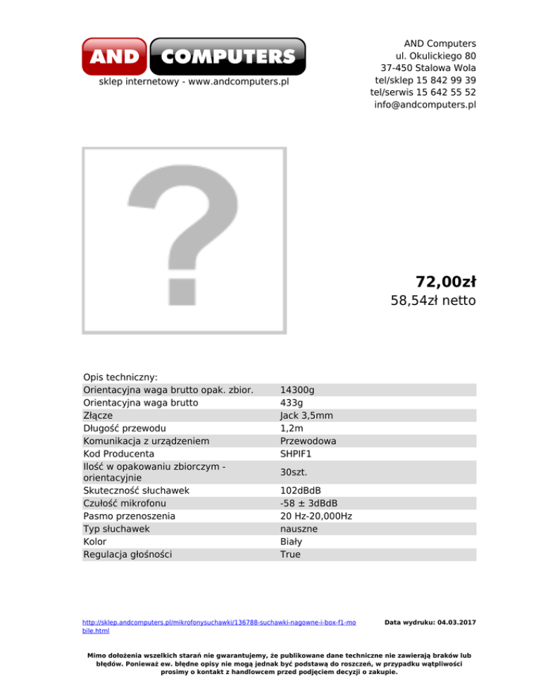 sklep internetowy - www.andcomputers.pl AND Computers ul. Okulickiego 80 37-450 Stalowa Wola tel/sklep 15 842 99 39 tel/serwis 15 642 55 52 [email protected] 72,00zł 58,54zł netto Opis techniczny: Orientacyjna waga brutto opak. zbior. Orientacyjna waga brutto Złącze Długość przewodu Komunikacja z urządzeniem Kod Producenta Ilość w opakowaniu zbiorczym orientacyjnie Skuteczność słuchawek Czułość mikrofonu Pasmo przenoszenia Typ słuchawek Kolor Regulacja głośności 14300g 433g Jack 3,5mm 1,2m Przewodowa SHPIF1 30szt. 102dBdB -58 ± 3dBdB 20 Hz-20,000Hz nauszne Biały True http://sklep.andcomputers.pl/mikrofonysuchawki/136788-suchawki-nagowne-i-box-f1-mo bile.html Data wydruku: 04.03.2017 Mimo dołożenia wszelkich starań nie gwarantujemy, że publikowane dane techniczne nie zawierają braków lub błędów. Ponieważ ew. błędne opisy nie mogą jednak być podstawą do roszczeń, w przypadku wątpliwości prosimy o kontakt z handlowcem przed podjęciem decyzji o zakupie. http://sklep.andcomputers.pl/mikrofonysuchawki/136788-suchawki-nagowne-i-box-f1-mo bile.html Data wydruku: 04.03.2017 Mimo dołożenia wszelkich starań nie gwarantujemy, że publikowane dane techniczne nie zawierają braków lub błędów. Ponieważ ew. błędne opisy nie mogą jednak być podstawą do roszczeń, w przypadku wątpliwości prosimy o kontakt z handlowcem przed podjęciem decyzji o zakupie.
