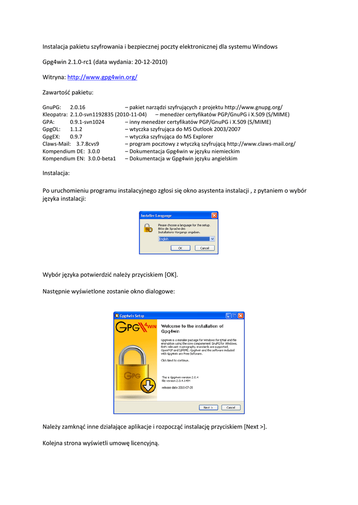 Instalacja pakietu szyfrowania i bezpiecznej poczty elektronicznej dla systemu Windows Gpg4win 2.1.0-rc1 (data wydania: 20-12-2010) Witryna: http://www.gpg4win.org/ Zawartośd pakietu: GnuPG: 2.0.16 – pakiet narządzi szyfrujących z projektu http://www.gnupg.org/ Kleopatra: 2.1.0-svn1192835 (2010-11-04) – menedżer certyfikatów PGP/GnuPG i X.509 (S/MIME) GPA: 0.9.1-svn1024 – inny menedżer certyfikatów PGP/GnuPG i X.509 (S/MIME) GpgOL: 1.1.2 – wtyczka szyfrująca do MS Outlook 2003/2007 GpgEX: 0.9.7 – wtyczka szyfrująca do MS Explorer Claws-Mail: 3.7.8cvs9 – program pocztowy z wtyczką szyfrującą http://www.claws-mail.org/ Kompendium DE: 3.0.0 – Dokumentacja Gpg4win w języku niemieckim Kompendium EN: 3.0.0-beta1 – Dokumentacja w Gpg4win języku angielskim Instalacja: Po uruchomieniu programu instalacyjnego zgłosi się okno asystenta instalacji , z pytaniem o wybór języka instalacji: Wybór języka potwierdzid należy przyciskiem *OK+. Następnie wyświetlone zostanie okno dialogowe: Należy zamknąd inne działające aplikacje i rozpocząd instalację przyciskiem *Next >+. Kolejna strona wyświetli umowę licencyjną. Instalację kontynuujemy wybierając przycisk *Next >+. Kolejne okno zawiera możliwość wyboru elementów, które mają zostad zainstalowane. Domyślne ustawienia będą już zaznaczone. Poszczególne elementy można także doinstalowad później. Wskazanie elementu kursorem myszki powoduje wyświetlenie krótkiego opisu. Kontynuacja instalacji następuje po naciśnięciu przycisku *Next >+. W kolejnym oknie zostanie zasugerowany katalog (folder) docelowy instalacji. Kontynuacja instalacji następuje po naciśnięciu przycisku *Next >+. Następnie, można zdecydowad o umieszczeniu ikon instalowanych programów w interfejsie użytkownika systemu Windows. Kontynuacja instalacji następuje po naciśnięciu przycisku *Next >+. W przypadku akceptacji utworzenia pozycji w menu Start – kolejne okno pozwala na określenie nazwy tej pozycji. Kontynuacja instalacji następuje po naciśnięciu przycisku *Next >+. Następnie rozpocznie się proces instalacji elementów pakietu. W czasie jego trwania będzie wyświetlany pasek postępu instalacji. Przycisk *Show details+ pozwala wyświetlid bieżący zapis logu instalacji. W trakcie instalacji programu Claws-Mail może pojawid się okno z pytaniem o wybór domyślnego klienta poczty elektronicznej. Jeżeli użytkownik wyrazi na to zgodę, będzie nim program Claws-Mail. Kolejne okno pozwala na zdefiniowanie zaufanych certyfikatów korzenia systemu S/MIME: Należy zaznaczyd pole wyboru i nacisnąd przycisk *Next >+. Ostatnie okno asystenta instalacji jest wyświetlane, gdy instalacja zakooczy się sukcesem: Jeżeli użytkownik nie chce wyświetlenia pliku README, zawierającego istotne informacje o właściwościach zainstalowanej wersji pakietu Gpg4win, należy deaktywowad pole zaznaczenia. Zakooczenie działania asystenta instalacji nastąpi po naciśnięciu przycisku *Finish+. W niektórych przypadkach może zajśd koniecznośd ponownego uruchomienia systemu Windows. W takiej sytuacji zostanie wyświetlony komunikat: Użytkownik może zdecydowad, czy restart systemu nastąpi od razu, czy nie. Należy nacisnąd przycisk [Finish]. Wspomniany plik README, który zawiera najnowsze informacje o wersji pakietu Gpg4win można wyświetlid także za pomocą menu systemowego: Start -> Programs -> Gpg4win -> Documentation -> Gpg4win README Koniec! Pakiet Gpg4win jest gotowy do użycia.