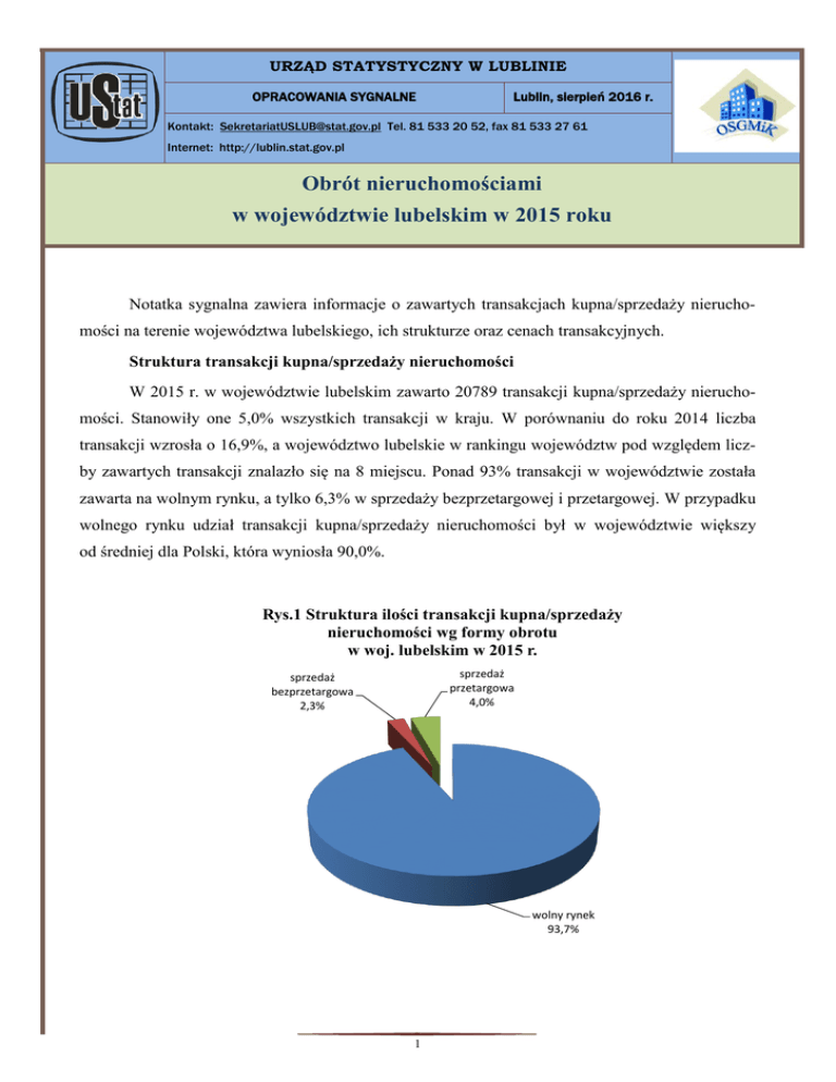URZĄD STATYSTYCZNY W LUBLINIE OPRACOWANIA SYGNALNE Lublin, sierpień 2016 r. Kontakt: [email protected] Tel. 81 533 20 52, fax 81 533 27 61 Internet: http://lublin.stat.gov.pl Obrót nieruchomościami w województwie lubelskim w 2015 roku Notatka sygnalna zawiera informacje o zawartych transakcjach kupna/sprzedaży nieruchomości na terenie województwa lubelskiego, ich strukturze oraz cenach transakcyjnych. Struktura transakcji kupna/sprzedaży nieruchomości W 2015 r. w województwie lubelskim zawarto 20789 transakcji kupna/sprzedaży nieruchomości. Stanowiły one 5,0% wszystkich transakcji w kraju. W porównaniu do roku 2014 liczba transakcji wzrosła o 16,9%, a województwo lubelskie w rankingu województw pod względem liczby zawartych transakcji znalazło się na 8 miejscu. Ponad 93% transakcji w województwie została zawarta na wolnym rynku, a tylko 6,3% w sprzedaży bezprzetargowej i przetargowej. W przypadku wolnego rynku udział transakcji kupna/sprzedaży nieruchomości był w województwie większy od średniej dla Polski, która wyniosła 90,0%. Rys.1 Struktura ilości transakcji kupna/sprzedaży nieruchomości wg formy obrotu w woj. lubelskim w 2015 r. sprzedaż przetargowa 4,0% sprzedaż bezprzetargowa 2,3% wolny rynek 93,7% 1 W Polsce udział sprzedaży bezprzetargowej wyniósł 5,7%, a przetargowej 4,3% i przekraczał średnie dla województwa lubelskiego, w którym obrót nieruchomościami należącymi do samorządu terytorialnego i osób prawnych był prawie dwukrotnie mniejszy od średniej krajowej. W 2015r. w województwie lubelskim największy udział, wynoszący ponad 59%, miały transakcje nieruchomościami gruntowymi niezabudowanymi (12363 transakcji), następnie lokalami mieszkalnymi i niemieszkalnymi ponad 24% (5122), nieruchomościami gruntowymi zabudowanymi prawie 16% (3296) oraz nieruchomościami budynkowymi poniżej 0,1% (8). Rys.2 Struktura ilości transakcji kupna/sprzedaży wg rodzaju nieruchomości w woj. lubelskim w 2015 r. nieruchomości gruntowe niezabudowane 59,5% lokale 24,6% budynki 0,0% nieruchomości gruntowe zabudowane 15,9% Struktura transakcji w województwie lubelskim różniła się od struktury kraju. W województwie udział transakcji lokalami był prawie dwukrotnie niższy od średniej dla Polski, podczas gdy udział transakcji nieruchomościami gruntowymi niezabudowanymi wyraźnie (o 19,8 p. proc.) przekraczał średnią krajową. Tak duży udział transakcji nieruchomościami gruntowymi niezabudowanymi w województwie lubelskim wynikał z wysokiego obrotu użytkami rolnymi, które stanowiły aż 83,4% tego typu transakcji. Dominacja użytków rolnych w transakcjach wiązała się z rolniczym charakterem województwa lubelskiego, które pod względem powierzchni użytków rolnych zajmuje trzecie miejsce w kraju po woj. mazowieckim i wielkopolskim. Inną prawdopodobną przyczyną było znaczne rozdrobnienie gospodarstw rolnych. Gospodarstwa o powierzchni do 5 ha stanowiły w województwie lubelskim 53,0%, a do 10 ha aż 80,0%, przy czym przeciętna powierzchnia gospodarstwa rolnego wynosiła 9,11 ha. Średnia dla Polski sięgała 11,60 ha, a dla woj. zachodniopomorskiego aż 29,93 ha, natomiast dla woj. małopolskiego tylko 4,94 ha. 2 W 2015 r. wartość wszystkich transakcji nieruchomościami zawartych w województwie lubelskim wyniosła 2,61 mld zł., co stanowiło 2,6% wartości transakcji zawartych w kraju. Największy udział w wartości transakcji miały nieruchomości lokalowe, a najmniejszy nieruchomości budynkowe. Różnica pomiędzy nimi w strukturze wartości transakcji wynikała z różnic w liczbie i cenie kupna/sprzedaży poszczególnych rodzajów nieruchomości. Rys 3. Struktura wartości transakcji kupna/sprzedaż wg rodzaju nieruchomości w woj. lubelskim w 2015 r. nieruchomości gruntowe niezabudowane 30,6% lokale 38,8% budynki 0,1% nieruchomości gruntowe zabudowane 30,6% Przeciętna wartość pojedynczej transakcji w województwie lubelskim dla lokali wyniosła 197 818 zł, dla nieruchomości budynkowych 184 375 zł, dla nieruchomości gruntowych zabudo- wanych 242 124 zł, a dla nieruchomości gruntowych niezabudowanych tylko 64 669 zł. Rys 4. Przeciętna wartość pojedyńczej transakcji kupna/sprzedaży nieruchomości w 2015 r. zł 600000 500000 400000 300000 Polska lubelskie 200000 100000 0 lokale budynki nieruchomości nieruchomości gruntowe gruntowe zabudowane niezabudowane 3 Dla budynków, nieruchomości gruntowych zabudowanych i niezabudowanych przeciętna wartość pojedynczej transakcji w województwie była ponad dwukrotnie niższa od średniej w kraju. Rozmieszczenie przestrzenne zawartych w 2015 r. transakcji kupna/sprzedaży nieruchomości wskazuje na znaczną przewagę stolicy województwa nad innymi powiatami i miastami na prawach powiatów. Na ponad 20 tys. transakcji w województwie, w Lublinie zawarto 3394 transakcji (19,6%), a w powiecie lubelskim 1564 (9,1%). Najmniej transakcji zawarto w mieście na prawach powiatu Białej Podlaskiej (267) oraz Chełmie (433). Jeżeli liczbę transakcji przedstawi się w przeliczeniu na 1000 mieszkańców, to rozmieszczenie przestrzenne transakcji w województwie znacznie się zmienia. Najwięcej transakcji w przeliczeniu na 1000 mieszkańców przeprowadzono we wschodnich powiatach województwa tj. chełmskim (16,8), włodawskim (16,3) i hrubieszowskim (15,3), najmniej w powiecie biłgorajskim (4,5) oraz Białej Podlaskiej (4,6). Lublin ze wskaźnikiem wynoszącym 9,9 transakcji znalazł się dopiero na 13 miejscu na 24 powiaty i miasta na prawach powiatów, a powiat lubelski ze wskaźnikiem wynoszącym 10,4 transakcji na 12 miejscu. Rys. 6 Transakcje kupna/sprzedaży nieruchomości w przeliczeniu na 1000 mieszkańców w województwie lubelskim w 2014 r. BIAŁA PODLASKA łukowski bialski radzyński parczewski rycki lubartowski włodawski puławski łęczyński LUBLIN CHEŁM świdnicki opolski chełmski lubelski krasnostawski kraśnicki hrubieszowski ZAMOŚ