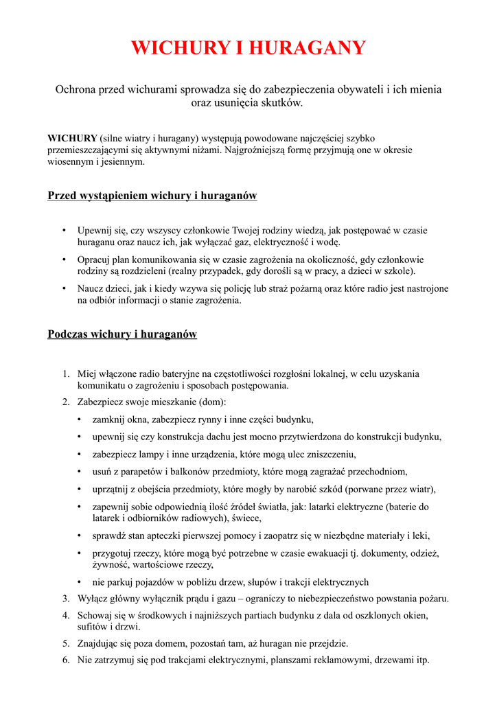 WICHURY I HURAGANY Ochrona przed wichurami sprowadza się do zabezpieczenia obywateli i ich mienia oraz usunięcia skutków. WICHURY (silne wiatry i huragany) występują powodowane najczęściej szybko przemieszczającymi się aktywnymi niżami. Najgroźniejszą formę przyjmują one w okresie wiosennym i jesiennym. Przed wystąpieniem wichury i huraganów • Upewnij się, czy wszyscy członkowie Twojej rodziny wiedzą, jak postępować w czasie huraganu oraz naucz ich, jak wyłączać gaz, elektryczność i wodę. • Opracuj plan komunikowania się w czasie zagrożenia na okoliczność, gdy członkowie rodziny są rozdzieleni (realny przypadek, gdy dorośli są w pracy, a dzieci w szkole). • Naucz dzieci, jak i kiedy wzywa się policję lub straż pożarną oraz które radio jest nastrojone na odbiór informacji o stanie zagrożenia. Podczas wichury i huraganów 1. Miej włączone radio bateryjne na częstotliwości rozgłośni lokalnej, w celu uzyskania komunikatu o zagrożeniu i sposobach postępowania. 2. Zabezpiecz swoje mieszkanie (dom): • zamknij okna, zabezpiecz rynny i inne części budynku, • upewnij się czy konstrukcja dachu jest mocno przytwierdzona do konstrukcji budynku, • zabezpiecz lampy i inne urządzenia, które mogą ulec zniszczeniu, • usuń z parapetów i balkonów przedmioty, które mogą zagrażać przechodniom, • uprzątnij z obejścia przedmioty, które mogły by narobić szkód (porwane przez wiatr), • zapewnij sobie odpowiednią ilość źródeł światła, jak: latarki elektryczne (baterie do latarek i odbiorników radiowych), świece, • sprawdź stan apteczki pierwszej pomocy i zaopatrz się w niezbędne materiały i leki, • przygotuj rzeczy, które mogą być potrzebne w czasie ewakuacji tj. dokumenty, odzież, żywność, wartościowe rzeczy, • nie parkuj pojazdów w pobliżu drzew, słupów i trakcji elektrycznych 3. Wyłącz główny wyłącznik prądu i gazu – ograniczy to niebezpieczeństwo powstania pożaru. 4. Schowaj się w środkowych i najniższych partiach budynku z dala od oszklonych okien, sufitów i drzwi. 5. Znajdując się poza domem, pozostań tam, aż huragan nie przejdzie. 6. Nie zatrzymuj się pod trakcjami elektrycznymi, planszami reklamowymi, drzewami itp. Jeżeli służby ratownicze zalecają ewakuację: • wyrusz tak szybko jak to tylko możliwe, • opuszczając mieszkanie wyłącz energię elektryczną oraz główny zawór wody i gazu. Wygaś ogień w piecach oraz zabezpiecz dom. • zawiadom kogoś, poza zasięgiem wichury, dokąd się ewakuujesz, • zabierz przygotowany zawczasu podręczny bagaż oraz ciepłą odzież. Po wichurze i huraganie • Udziel pierwszej pomocy rannym i poszkodowanym osobom. • Unikaj leżących lub zwisających przewodów elektrycznych. • Ostrożnie wkraczaj do swego domu. • Sprawdź instalację (gazową, elektryczną, wodociągową i ściekową) w zniszczonym domu. O wszystkich zdarzeniach, mających istotne znaczenie dla bezpieczeństwa ludzi informuj: • służby dyżurne Straży Pożarnej, Policji, • pogotowie energetyczne, gazowe, inne.