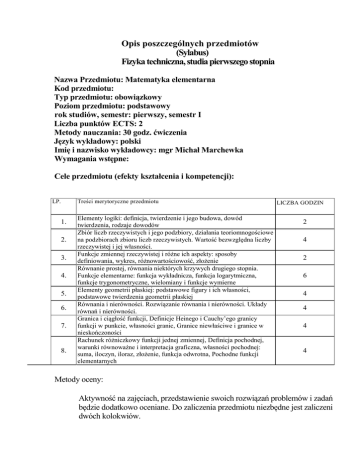Opis poszczególnych przedmiotów (Sylabus) Fizyka techniczna, studia pierwszego stopnia Nazwa Przedmiotu: Matematyka elementarna Kod przedmiotu: Typ przedmiotu: obowiązkowy Poziom przedmiotu: podstawowy rok studiów, semestr: pierwszy, semestr I Liczba punktów ECTS: 2 Metody nauczania: 30 godz. ćwiczenia Język wykładowy: polski Imię i nazwisko wykładowcy: mgr Michał Marchewka Wymagania wstępne: Cele przedmiotu (efekty kształcenia i kompetencji): LP. Treści merytoryczne przedmiotu 1. 2. 3. 4. 5. 6. 7. 8. Elementy logiki: definicja, twierdzenie i jego budowa, dowód twierdzenia, rodzaje dowodów Zbiór liczb rzeczywistych i jego podzbiory, działania teoriomnogościowe na podzbiorach zbioru liczb rzeczywistych. Wartość bezwzględna liczby rzeczywistej i jej własności. Funkcje zmiennej rzeczywistej i różne ich aspekty: sposoby definiowania, wykres, różnowartościowość, złożenie Równanie prostej, równania niektórych krzywych drugiego stopnia. Funkcje elementarne: funkcja wykładnicza, funkcja logarytmiczna, funkcje trygonometryczne, wielomiany i funkcje wymierne Elementy geometrii płaskiej: podstawowe figury i ich własności, podstawowe twierdzenia geometrii płaskiej Równania i nierówności. Rozwiązanie równania i nierówności. Układy równań i nierówności. Granica i ciągłość funkcji, Definicje Heinego i Cauchy’ego granicy funkcji w punkcie, własności granic, Granice niewłaściwe i granice w nieskończoności Rachunek różniczkowy funkcji jednej zmiennej, Definicja pochodnej, warunki równoważne i interpretacja graficzna, własności pochodnej: suma, iloczyn, iloraz, złożenie, funkcja odwrotna, Pochodne funkcji elementarnych LICZBA GODZIN 2 4 2 6 4 4 4 4 Metody oceny: Aktywność na zajęciach, przedstawienie swoich rozwiązań problemów i zadań będzie dodatkowo oceniane. Do zaliczenia przedmiotu niezbędne jest zaliczeni dwóch kolokwiów. Spis zalecanych lektur: 1. M. Karpinski, M. Dobrowolska, M. Braun i J. Lech, Matematyka I, podrecznik dla liceum i technikum, zakres podstawowy z rozszerzeniem 2. Podręczniku kursowe do matematyki dla szkoły średniej 3. L. Górniewicz i R. Ingarden, Analiza matematyczna dla fizyków, t. I i II, Wydawnictwo UMK, Torun 1996 4. J. Banas i S. Wedrychowicz, Zbiór zadan z analizy matematycznej, WNT, Warszawa /podpis prowadzącego/ /podpis Kierownika Zakładu/