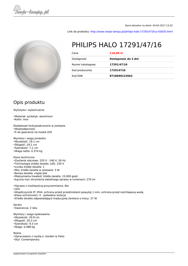 Dane aktualne na dzień: 04-03-2017 13:32 Link do produktu: http://www.twoje-lampy.pl/philips-halo-172914716-p-42635.html PHILIPS HALO 17291/47/16 Cena 119,00 zł Dostępność Dostępność do 3 dni Numer katalogowy 17291/47/16 Kod producenta 172914716 Kod EAN 8718696122662 Opis produktu Stylistyka i wykończenie •Materiał: syntetyk, aluminium •Kolor: inox Dodatkowe funkcje/akcesoria w zestawie •Wodoodporność •5 lat gwarancji na moduł LED Wymiary i waga produktu •Wysokość: 19.1 cm •Długość: 19.1 cm •Szerokość: 7.1 cm •Waga netto: 0.374 kg Dane techniczne •Zasilanie sieciowe: 220 V - 240 V, 50 Hz •Technologia źródła światła: LED, 230 V •Liczba źródeł światła: 1 •Moc źródła światła w zestawie: 3 W •Barwa światła: ciepła biel •Maksymalna trwałość źródła światła: 15,000 godz •Łączna moc strumienia świetlnego oprawy w lumenach: 270 lm •Oprawa z możliwością przyciemniania: Nie •LED •Współczynnik IP: IP44, ochrona przed przedmiotami powyżej 1 mm, ochrona przed rozchlapaną wodą •Klasa ochronności: II - podwójna izolacja •Źródło światła odpowiadające tradycyjnej żarówce o mocy: 27 W Serwis •Gwarancja: 2 lata Wymiary i waga opakowania •Wysokość: 20.8 cm •Długość: 20.3 cm •Szerokość: 9.3 cm •Waga: 0.488 kg Różne •Opracowano z myślą o: Garden & Patio •Styl: Contemporary wygenerowano w programie shopGold •Typ: Kinkiet wygenerowano w programie shopGold Powered by TCPDF (www.tcpdf.org)