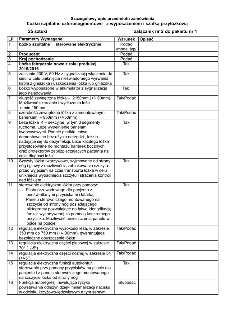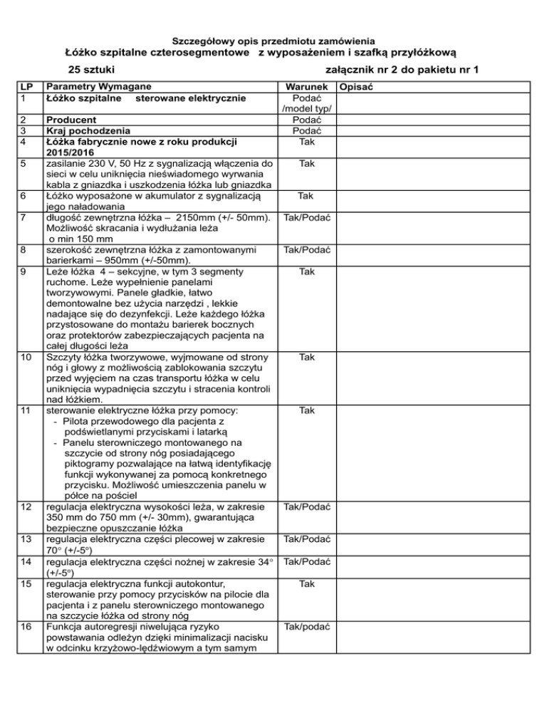 Szczegółowy opis przedmiotu zamówienia Łóżko szpitalne czterosegmentowe z wyposażeniem i szafką przyłóżkową 25 sztuki LP 1 Parametry Wymagane Łóżko szpitalne sterowane elektrycznie 2 3 4 Producent Kraj pochodzenia Łóżka fabrycznie nowe z roku produkcji 2015/2016 zasilanie 230 V, 50 Hz z sygnalizacją włączenia do sieci w celu uniknięcia nieświadomego wyrwania kabla z gniazdka i uszkodzenia łóżka lub gniazdka Łóżko wyposażone w akumulator z sygnalizacją jego naładowania długość zewnętrzna łóżka – 2150mm (+/- 50mm). Możliwość skracania i wydłużania leża o min 150 mm szerokość zewnętrzna łóżka z zamontowanymi barierkami – 950mm (+/-50mm). Leże łóżka 4 – sekcyjne, w tym 3 segmenty ruchome. Leże wypełnienie panelami tworzywowymi. Panele gładkie, łatwo demontowalne bez użycia narzędzi , lekkie nadające się do dezynfekcji. Leże każdego łóżka przystosowane do montażu barierek bocznych oraz protektorów zabezpieczających pacjenta na całej długości leża Szczyty łóżka tworzywowe, wyjmowane od strony nóg i głowy z możliwością zablokowania szczytu przed wyjęciem na czas transportu łóżka w celu uniknięcia wypadnięcia szczytu i stracenia kontroli nad łóżkiem. sterowanie elektryczne łóżka przy pomocy: - Pilota przewodowego dla pacjenta z podświetlanymi przyciskami i latarką - Panelu sterowniczego montowanego na szczycie od strony nóg posiadającego piktogramy pozwalające na łatwą identyfikację funkcji wykonywanej za pomocą konkretnego przycisku. Możliwość umieszczenia panelu w półce na pościel regulacja elektryczna wysokości leża, w zakresie 350 mm do 750 mm (+/- 30mm), gwarantująca bezpieczne opuszczanie łóżka regulacja elektryczna części plecowej w zakresie 70 (+/-5o) regulacja elektryczna części nożnej w zakresie 34 (+/-5o) regulacja elektryczna funkcji autokontur, sterowanie przy pomocy przycisków na pilocie dla pacjenta i z panelu sterowniczego montowanego na szczycie łóżka od strony nóg Funkcja autoregresji niwelująca ryzyko powstawania odleżyn dzięki minimalizacji nacisku w odcinku krzyżowo-lędźwiowym a tym samym 5 6 7 8 9 10 11 12 13 14 15 16 załącznik nr 2 do pakietu nr 1 Warunek Opisać Podać /model typ/ Podać Podać Tak Tak Tak Tak/Podać Tak/Podać Tak Tak Tak Tak/Podać Tak/Podać Tak/Podać Tak Tak/podać 17 18 19 20 21 21 22 23 24 25 26 27 pełniąca funkcje profilaktyczną przeciwko odleżynom stopnia 1-4. W segmencie pleców: min.9cm, w segmencie uda: min.5cm. Funkcja zaawansowanej autoregresji - system teleskopowego odsuwania się segmentu pleców oraz uda nie tylko do tyłu, ale i do góry (ruch po okręgu) podczas podnoszenia segmentów, w celu eliminacji sił tarcia będącymi potencjalnym zagrożeniem powstawania odleżyn stopnia 1:4. regulacja elektryczna pozycji Trendelenburga 15– sterowanie z panelu sterowniczego montowanego na szczycie łóżka od strony nóg regulacja elektryczna pozycji anty-Trendelenburga 15 – sterowanie z panelu sterowniczego montowanego na szczycie łóżka od strony nóg. Regulacja elektryczna do pozycji krzesła kardiologicznego – sterowanie przy pomocy jednego oznaczonego odpowiednim piktogramem przycisku na panelu sterowniczym montowanym na szczycie łóżka od strony nóg Regulacja elektryczna do pozycji antyszokowej – sterowanie przy pomocy jednego oznaczonego odpowiednim piktogramem przycisku na panelu sterowniczym montowanym na szczycie łóżka od strony nóg Regulacja elektryczna funkcji CPR – sterowanie przy pomocy jednego oznaczonego odpowiednim piktogramem przycisku na panelu sterowniczym montowanym na szczycie łóżka od strony nóg Wyłączniki/blokady funkcji elektrycznych (na panelu sterowniczym) dla poszczególnych regulacji: - regulacji wysokości - regulacji części plecowej - regulacji części nożnej Elektroniczne wskaźniki informujące o zablokowanych, aktywnych funkcjach łóżka na panelu sterowniczym i pilocie pacjenta Alarm dźwiękowy informujący o próbie użycia zablokowanej funkcji Zabezpieczenie przed nieświadomym uruchomieniem funkcji poprzez konieczność wciśnięcia przycisku uruchamiającego dostępność funkcji . Przyciski aktywacji dostępne w sterowaniu: na panelu i pilocie Odłączenie wszelkich regulacji po 180 sekundach nieużywania regulacji (konieczność świadomego ponownego uruchomienia regulacji) Przycisk bezpieczeństwa (oznaczony charakterystycznie: STOP lub tez o innym oznaczeniu) natychmiastowe odłączenie wszystkich funkcji elektrycznych w przypadku wystąpienia zagrożenia dla pacjenta lub personelu również odcinający funkcje w przypadku braku podłączenia do sieci – pracy na akumulatorze. Mechaniczna funkcja CPR Tak Tak/Podać Tak/Podać Tak Tak Tak Tak Tak Tak Tak Tak Tak 28 33 Koła o średnicy min 125mm z możliwością indywidualnego lub centralnego blokowania. Bezpieczne obciążenie robocze dla każdej pozycji leża i segmentów na poziomie minimum 185 kg. Pozwalające na wszystkie możliwe regulacje przy tym obciążeniu bez narażenia bezpieczeństwa pacjenta i powstanie incydentu medycznego. System elektrycznej ochrony przed uszkodzeniem łóżka w wyniku przeciążenia, polega na wyłączeniu regulacji łóżka w przypadku przekroczonego obciążenia. wyposażenie: - Barierki boczne metalowe lakierowane składane wzdłuż ramy leża o wysokości min 450mm. Barierki wyposażone w uchwyt z system blokady umożliwiającym odblokowywanie, składanie i rozkładanie za pomocą jednej ręki. Mechanizm wbudowany w górną poprzeczkę barierki – do wszystkich łóżek - Blat nakładany na barierki boczne – do 12 łóżek - Materac o grubości min 120mm wykonany z piany poliuretanowej – do wszystkich łóżek. Rekomendowany dla osób z ryzykiem odleżynowym zapobiegający odleżynom do drugiego stopnia włącznie. Wykonany z wysoce sprężystej pianki. Wyposażony w paroprzepuszczalny pokrowiec z zamkiem nie przepuszczający płynów i