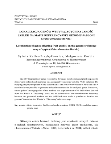 ZESZYTY NAUKOWE INSTYTUTU SADOWNICTWA I KWIACIARSTWA TOM 16 2008 LOKALIZACJA GENÓW WPŁYWAJĄCYCH NA JAKOŚĆ JABŁEK NA MAPIE REFERENCYJNEJ GENOMU JABŁONI (Malus domestica Borkh.) Localization of genes affecting fruit quality on the genome reference map of apple (Malus domestica Borkh.) S y l w i a K e l l e r - P r z y b y łk o w i c z, M a łg o r z a t a K o r b i n Instytut Sadownictwa i Kwiaciarstwa w Skierniewicach ul. Pomologiczna 18, 96-100 Skierniewice e-mail: [email protected] ABSTRACT Six EST fragments of genes responsible for sugar metabolism and plant response to stress were isolated and identified in a comparative analysis with the NCBI database. By studying the polymorphism of the isolated ESTs that was observed after CAPS and SSCP reactions it was possible to generate molecular markers for the analysed genes. Moreover, an analysis of the segregation of the markers in a population set of 48 individuals derived from the ’Fiesta’ x ’Discovery’ cross, and an estimation of the recombination frequency between the generated markers and the published ones made it possible to localize the genes of interest on the ’Fiesta’ x ’Discovery’ reference map. Key words: Malus domestica Borkh., molecular markers, CAPS, SSCP, candidate genes, genetic map WSTĘP Gł ównym celem hodowli twórczej jest uzyskanie nowych odmian o cechach fenotypowych, pożą danych zarówno przez producenta, jak i konsumenta (Watada i Abbot 1985; Kellerhals i in. 2004; Abbot i Kole 70 Zeszyty Naukowe Instytutu Sadownictwa i Kwiaciarstwa, tom 16 2008). W przypadku roś lin drzewiastych stosunkowo dł ugi okres juwenilny powoduje, ż e wyprowadzenie genotypów o poż ą danych cechach moż e trwaćnawet 20-25 lat (Kellerhals i Mayer 1994). Wykorzystanie w procesie hodowlanym technik molekularnych uł atwia wybór najlepszych materiał ów wyjś ciowych do krzyż owań, jak równieżprzyś piesza selekcję osobników o najkorzystniejszej kombinacji genów, kodują cych badane cechy (Reiter i in. 1992; Cipriani i in. 1999; King i in. 2000; Quiros i Li 2001; Yamamoto i in. 2002; Liebhard i in. 2003). Jednąz metod przyspieszania procesu hodowlanego jest generowanie markerów, sprzęż onych z poż ą danącechą , na podstawie analizy polimorfizmu genomowego DNA. Wykrywanie fragmentów polimorficznych w populacji segregują cej (Mohan i in. 1997; Silfverberg-Dilworth i in. 2006) i ocena rozkł adu ich dziedziczenia w takiej populacji, umoż liwia ustalenie odległ oś ci mapowych pomię dzy badanymi regionami genomu i zlokalizowanie badanych genów/markerów na mapie genetycznej roś liny (Lander i Botstein 1989). Badania nad umiejscowieniem na mapie genów odpowiedzialnych za jakoś ćjabł ek oraz zł oż onoś ćich współ dział ania, wią ż ąca sięz losowym rozmieszczeniem w obrę bie często odległ ych regionów genomu, był y tematem badańw wielu oś rodkach naukowych (Harada i in. 2000; King i in. 2000; Tartarini 2003; Costa i in. 2005; 2008). Dzię ki studiom nad molekularnymi mechanizmami dziedziczenia niektórych spoś ród tych cech (Ritter i in. 1990; Ullah 2004 ) udał o sięznacznie zagęś cićdotychczas opisane mapy referencyjne genomu Malus domestica (Hemmat i in. 1994; Maliepaard i in. 1998; Liebhard i in. 2002). Badania nad zagę szczaniem mapy genomu jabł oni podję to w Pracowni Niekonwencjonalnych Metod Hodowli Instytutu Sadownictwa i Kwiaciarstwa w ramach projektu HiDRAS (5 Program Ramowy EU) w 2005 roku. W niniejszej publikacji przedstawiono wyniki prac nad zlokalizowaniem na mapie genetycznej M. domestica sześ ciu fragmentów EST (Express Sequence Tags – znaczników sekwencji kodujących), zidentyfikowanych jako geny wpł ywające na metabolizm cukrów w owocach i reakcjęroś liny na stres. Lokalizacja genów wpł ywających na jakoś ćjabł ek na mapie referencyjnej genomu … 71 MATERIAŁI METODY Materiałbadawczy. Badania prowadzono na DNA wyizolowanym z roś lin odmian Fiesta i Discovery oraz z 48 roś lin potomnych z populacji segregują cej ‘Fiesta’ x ‘Discovery’. Owoce odmian Fiesta i Discovery różniąsięterminem dojrzewania, zawartoś ciącukrów, ję drnoś ciąi kwasowoś cią. Wysoki stopień kwasowoś ci, niska zawartoś ć cukrów oraz niezadowalają ca ję drnoś ćowoców ‘Discovery’ wpł ynęł a mię dzy innymi na negatywnąocenękonsumentów (Liebhard i in. 2002; Kellerhals i in. 2004), co należy wziąćpod uwagę przy opracowywaniu programów hodowlanych z udział em tej odmiany. Fragmenty EST wybrano na podstawie analizy mikromacierzy dla matryc uzyskanych z owoców obu odmian, we współ pracy z Uniwersytetem w Mediolanie. PCR. Fragmenty EST był y izolowane i namnaż ane w mieszaninie reakcyjnej (13 µl), zawierającej 3 ng matrycy DNA; 1x PCR buforu; 3,75 mM MgCl2; 0,5 U Platinium Taq Polimerazy (Invitrogen); 2,5 mM dNTP (Applied Biosystem); 5 mM każdego ze starterów. Startery specyficzne dla fragmentów EST (tab. 1) zaprojektowano w Pracowni Niekonwencjonalnych Metod Hodowli przy uż yciu programu komputerowego DNAStar– Lasergene 7.0. Reakcje prowadzono w termocyklerze PTC-200, MJ Research, przy następują cym profilu termicznym – 120 s w temperaturze o 96 C (wstępna denaturacja DNA), 30 s w temperaturze 96oC, 60 s w temperaturze 60 lub 65oC i 30 s w temperaturze 72oC (30 cyklów). Produkty PCR rozdzielano w 1,5% ż elu agarozowym w obecnoś ci markera wielkoś ci molekularnej 1Kb (DNA faga λ/ Hind III/ EcoR V, Fermentas). Ocena polimorfizmu. Polimorfizm DNA identyfikowano po enzymatycznym trawieniu produktów PCR (technika CAPS, Cleaved Amplified Polymorphism Sequence) i ich analizie w żelu sekwencyjnym (technika SSCP, Single Strand Conformational Polymorphism). W reakcjach CAPS produkty PCR trawiono enzymem Hae III (0,1U) (Fermentas) w temperaturze 37oC. Polimorfizm konformacyjny SSCP 72 Zeszyty Naukowe Instytutu Sadownictwa i Kwiaciarstwa, tom 16 analizowano po rozdziale produktów PCR w 7% ż elu poliakryla