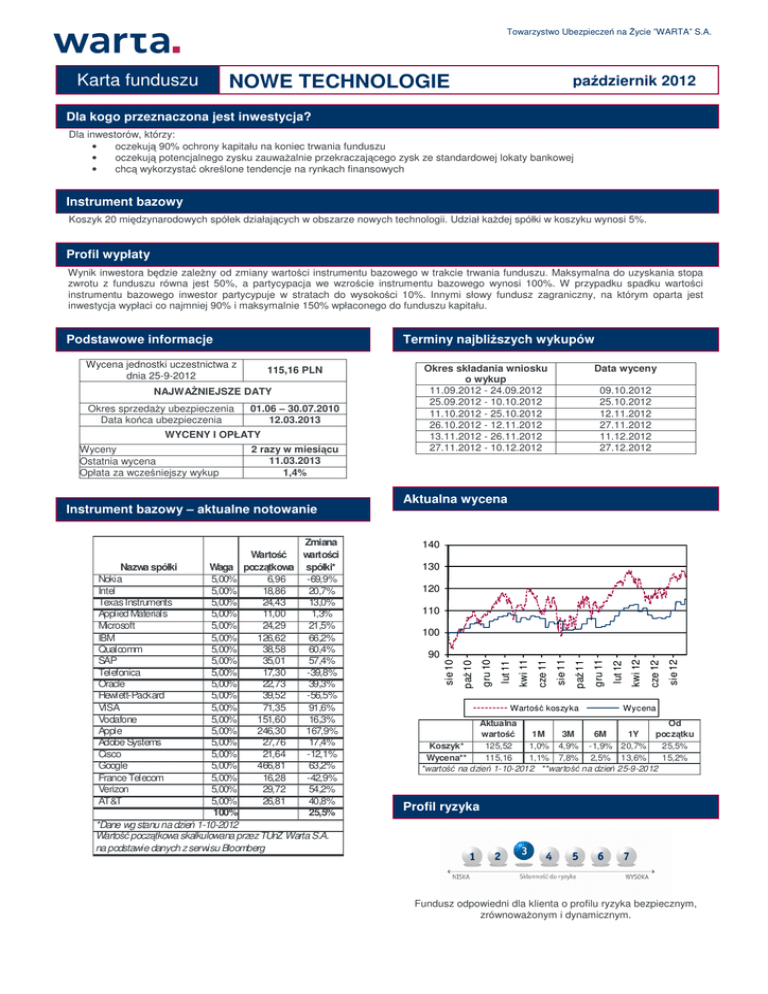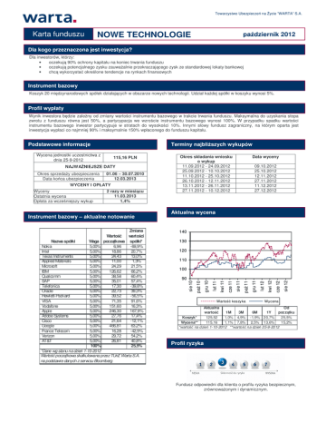 Towarzystwo Ubezpieczeń na śycie ”WARTA” S.A. Karta funduszu NOWE TECHNOLOGIE październik 2012 Dla kogo przeznaczona jest inwestycja? Dla inwestorów, którzy: • oczekują 90% ochrony kapitału na koniec trwania funduszu • oczekują potencjalnego zysku zauwaŜalnie przekraczającego zysk ze standardowej lokaty bankowej • chcą wykorzystać określone tendencje na rynkach finansowych Instrument bazowy Koszyk 20 międzynarodowych spółek działających w obszarze nowych technologii. Udział kaŜdej spółki w koszyku wynosi 5%. Profil wypłaty Wynik inwestora będzie zaleŜny od zmiany wartości instrumentu bazowego w trakcie trwania funduszu. Maksymalna do uzyskania stopa zwrotu z funduszu równa jest 50%, a partycypacja we wzroście instrumentu bazowego wynosi 100%. W przypadku spadku wartości instrumentu bazowego inwestor partycypuje w stratach do wysokości 10%. Innymi słowy fundusz zagraniczny, na którym oparta jest inwestycja wypłaci co najmniej 90% i maksymalnie 150% wpłaconego do funduszu kapitału. Terminy najbliŜszych wykupów 130 120 110 Wartość koszyka sie 12 90 cze 12 100 lut 12 Waga 5,00% 5,00% 5,00% 5,00% 5,00% 5,00% 5,00% 5,00% 5,00% 5,00% 5,00% 5,00% 5,00% 5,00% 5,00% 5,00% 5,00% 5,00% 5,00% 5,00% 100% *Dane wg stanu na dzień 1-10-2012 Wartość początkowa skalkulowana przez TUnś Warta S.A. na podstawie danych z serwisu Bloomberg 140 kwi 12 Nazwa spółki Nokia Intel Texas Instruments Applied Materials Microsoft IBM Qualcomm SAP Telefonica Oracle Hewlett-Packard VISA Vodafone Apple Adobe Systems Cisco Google France Telecom Verizon AT&T Zmiana Wartość wartości początkowa spółki* 6,96 -69,9% 18,86 20,7% 24,43 13,0% 11,00 1,3% 24,29 21,5% 126,62 66,2% 38,58 60,4% 35,01 57,4% 17,30 -39,8% 22,73 39,3% 39,52 -56,5% 71,35 91,6% 151,60 16,3% 246,30 167,9% 27,76 17,4% 21,64 -12,1% 466,81 63,2% 16,28 -42,9% 29,72 54,2% 26,81 40,8% 25,5% Aktualna wycena gru 11 Instrument bazowy – aktualne notowanie 09.10.2012 25.10.2012 12.11.2012 27.11.2012 11.12.2012 27.12.2012 paź 11 2 razy w miesiącu 11.03.2013 1,4% Data wyceny sie 11 WYCENY I OPŁATY Wyceny Ostatnia wycena Opłata za wcześniejszy wykup kwi 11 01.06 – 30.07.2010 12.03.2013 cze 11 Okres sprzedaŜy ubezpieczenia Data końca ubezpieczenia lut 11 NAJWAśNIEJSZE DATY Okres składania wniosku o wykup 11.09.2012 - 24.09.2012 25.09.2012 - 10.10.2012 11.10.2012 - 25.10.2012 26.10.2012 - 12.11.2012 13.11.2012 - 26.11.2012 27.11.2012 - 10.12.2012 gru 10 115,16 PLN paź 10 Wycena jednostki uczestnictwa z dnia 25-9-2012 sie 10 Podstawowe informacje Wycena Aktualna Od wartość 1M 3M 6M 1Y początku 125,52 1,0% 4,9% -1,9% 20,7% 25,5% Koszyk* 115,16 1,1% 7,8% 2,5% 13,6% 15,2% Wycena** *wartość na dzień 1-10-2012 **wartość na dzień 25-9-2012 Profil ryzyka Fundusz odpowiedni dla klienta o profilu ryzyka bezpiecznym, zrównowaŜonym i dynamicznym. Komentarz rynkowy Początkowe wzrosty koszyka spółek (w okresie sierpień 2010 – kwiecień 2011) zostały zniwelowane w okresie wakacyjnym 2011 roku. Po krótkotrwałym powrocie w okolice wartości początkowej wykorzystane w funduszu spółki technologicznie ponownie zaczęły jednak budować zyski dla inwestorów. Obecnie notowane są ok. 25% powyŜej wartości początkowej co moŜna uznać za dobrą stopę zwrotu za okres pierwszych dwóch lat. Sektor technologii naleŜy do tzw. sektorów cyklicznych, czyli w istotnym stopniu zaleŜnych od koniunktury gospodarczej na świecie. W tym przypadku warto mówić o koniunkturze globalnej, a nie dotyczącej jakiegoś konkretnego regionu, poniewaŜ znajdujące się w koszyku spółki działają międzynarodowo. Pod koniec poprzedniego roku tempo wzrostu gospodarczego na świecie zaczęło wyhamowywać. Pomimo tego sytuacja nie przedstawia się źle. MoŜemy oczekiwać, Ŝe w 2012 wzrost PKB w skali świata, choć wolniejszy niŜ 2011 roku, nadal będzie na przyzwoitym poziomie (według prognoz MFW ok. 3,3%). Dodatkowo są podstawy by w 2013 roku spodziewać się przyspieszenia, co w kolejnych miesiącach powinny dyskontować rynki akcji. Czynnikiem ryzyka pozostaje sytuacja w strefie euro. Obecnie zaczęła zdradzać ona oznaki stabilizacji, m.in. po zapowiedzi Europejskiego banku Centralnego, Ŝe będzie skupował obligacje pogrąŜonych w problemach krajów południa Europy, pod warunkiem Ŝe te będą realizować programy reform. Ciągle jednak potrzeba kolejnych działań (w szczególności wspierających wzrost gospodarczy w przyszłości) by względnie dobry sentyment mógł się utrzymać w długim terminie. W przypadku sektora nowych technologii argumentami za inwestycją są ponadto obecnie niskie wyceny znajdujących się w koszyku spółek (patrząc z perspektywy historycznej są one tanie) oraz duŜa innowacyjność większości z nich. Dodatkowo wydaje się, Ŝe pomimo nieco gorszej koniunktury w skali świata firmy nie tną istotnie budŜetów inwestycyjnych przeznaczonych na produkty i usługi oferowane przez spółki z koszyka. Kontakt Informacje na temat funduszy TUnś WARTA S.A. moŜna uzyskać pod numerem infolinii: z telefonu stacjonarnego 801 308 308 z telefonu komórkowego +48 502 308 308 Nota prawna i informacje o firmie TUnś WARTA S.A. NOTA PRAWNA Wszelkie opinie i oceny zawarte w niniejszym opracowaniu wyraŜają opinie Ubezpieczyciela w dniu jego wydania. Opracowanie przygotowano dochowując naleŜytej staranności, wykorzystując źródła informacji, które Ubezpieczyciel uwaŜa za wiarygodne i dokładne, jednakŜe nie istnieje gwarancja, iŜ są one wyczerpujące i w pełni odzwierciedlają stan faktyczny. Wykresy i diagramy przedstawione w niniejszym opracowaniu mają charakter wyłącznie ilustracyjny, nie są one ani doradztwem inwestycyjnym, ani prognozą. Ubezpieczyciel nie świadczy usług doradztwa inwestycyjnego, ani nie udziela porad inwestycyjnych, a informacje nie mają w Ŝadnym wypadku charakteru porady inwestycyjnej. Szczegółowe informacje dotyczące umowy ubezpieczen