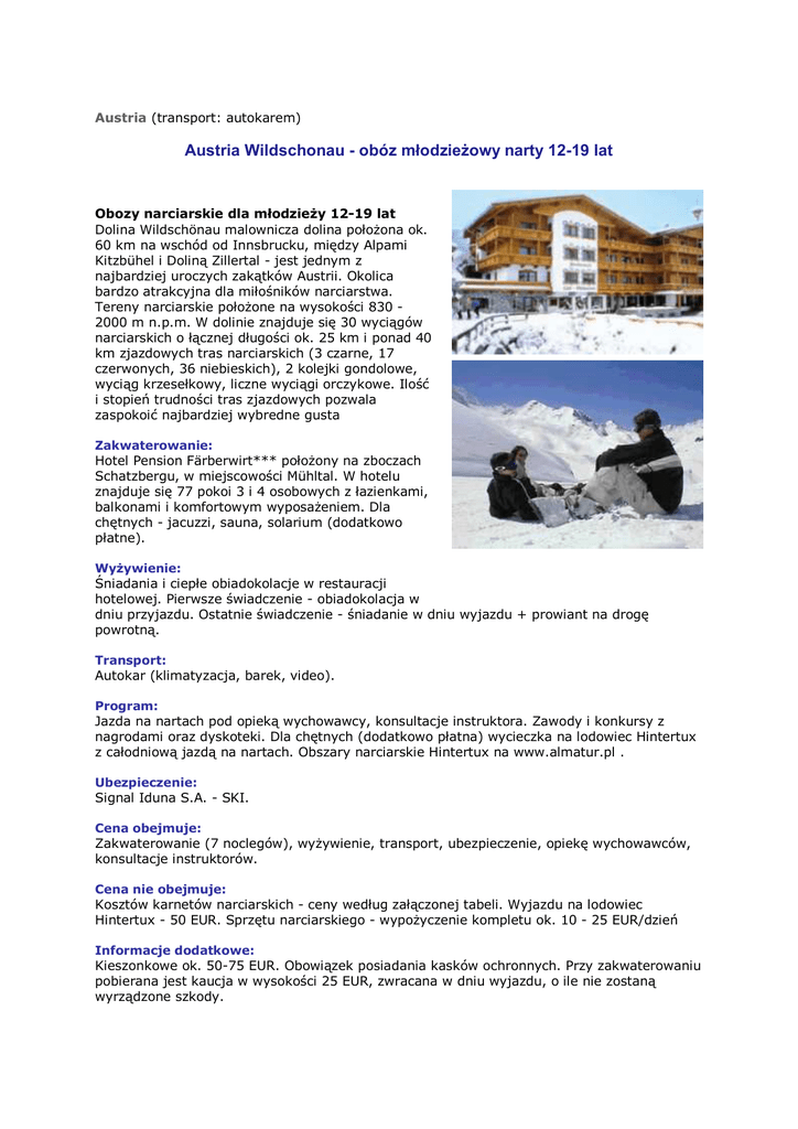 Austria (transport: autokarem) Austria Wildschonau - obóz młodzieżowy narty 12-19 lat Obozy narciarskie dla młodzieży 12-19 lat Dolina Wildschönau malownicza dolina położona ok. 60 km na wschód od Innsbrucku, między Alpami Kitzbühel i Doliną Zillertal - jest jednym z najbardziej uroczych zakątków Austrii. Okolica bardzo atrakcyjna dla miłośników narciarstwa. Tereny narciarskie położone na wysokości 830 2000 m n.p.m. W dolinie znajduje się 30 wyciągów narciarskich o łącznej długości ok. 25 km i ponad 40 km zjazdowych tras narciarskich (3 czarne, 17 czerwonych, 36 niebieskich), 2 kolejki gondolowe, wyciąg krzesełkowy, liczne wyciągi orczykowe. Ilość i stopień trudności tras zjazdowych pozwala zaspokoić najbardziej wybredne gusta Zakwaterowanie: Hotel Pension Färberwirt*** położony na zboczach Schatzbergu, w miejscowości Mühltal. W hotelu znajduje się 77 pokoi 3 i 4 osobowych z łazienkami, balkonami i komfortowym wyposażeniem. Dla chętnych - jacuzzi, sauna, solarium (dodatkowo płatne). Wyżywienie: Śniadania i ciepłe obiadokolacje w restauracji hotelowej. Pierwsze świadczenie - obiadokolacja w dniu przyjazdu. Ostatnie świadczenie - śniadanie w dniu wyjazdu + prowiant na drogę powrotną. Transport: Autokar (klimatyzacja, barek, video). Program: Jazda na nartach pod opieką wychowawcy, konsultacje instruktora. Zawody i konkursy z nagrodami oraz dyskoteki. Dla chętnych (dodatkowo płatna) wycieczka na lodowiec Hintertux z całodniową jazdą na nartach. Obszary narciarskie Hintertux na www.almatur.pl . Ubezpieczenie: Signal Iduna S.A. - SKI. Cena obejmuje: Zakwaterowanie (7 noclegów), wyżywienie, transport, ubezpieczenie, opiekę wychowawców, konsultacje instruktorów. Cena nie obejmuje: Kosztów karnetów narciarskich - ceny według załączonej tabeli. Wyjazdu na lodowiec Hintertux - 50 EUR. Sprzętu narciarskiego - wypożyczenie kompletu ok. 10 - 25 EUR/dzień Informacje dodatkowe: Kieszonkowe ok. 50-75 EUR. Obowiązek posiadania kasków ochronnych. Przy zakwaterowaniu pobierana jest kaucja w wysokości 25 EUR, zwracana w dniu wyjazdu, o ile nie zostaną wyrządzone szkody. Ceny karnetów w EURO za 6 dni Dorośli - Ok.160 Młodzież urodzona w latach 1992-94 - Ok. 130 Dzieci urodzone w latach 1995-2004 - Ok. 90 UWAGA! Na trasach dojazdowych możliwy transport mikrobusem lub innym środkiem transportu. UWAGA ! Depozyt za karnet magnetyczny 2 EUR zwracamy ostatniego dnia. Zniżka za łączenie turnusów - 100 zł Terminy i ceny Nr grupy obóz młodzieżowy narty 12-19 lat Data Cena ISIC Cena 1699 1649 zł Promocja zł ŁAWM01 14.01 - 23.01 (skrót: FARBERMLN) 1624 zł 10 dni Austria Wildschonau Termin imprezy: od 14.01.2011 do 23.01.2011 ROZKŁAD JAZDY Uwaga: godziny powrotów są godzinami orientacyjnymi Miasto Godz. wyjazdu Dopłata Godz. powrotu Białystok 15:30 +150 zł 10:45 Warszawa 19:00 +125 zł 07:15 Radom 20:30 +125 zł 05:30 Kielce 22:00 +125 zł 04:00 Łódź 21:30 +100 zł 04:45 Piotrków Tryb. 22:30 +100 zł 03:45 Radomsko 23:15 +100 zł 03:00 Częstochowa 24:00 +75 zł 02:15 0 zł 01:00 Katowice 01:00*, wyjazd następnego dnia. Wrocław 21:30 +100 zł 04:30 Opole 23:00 +75 zł 03:00 Kraków 24:00 +75 zł 02:00 Tarnów 21:30 +100 zł 04:30 Rzeszów 20:30 +125 zł 05:30 Stalowa Wola 19:00 +125 zł 07:00 Lublin 17:30 +150 zł 08:30 Gdańsk 14:00 +175 zł 12:00 Olsztyn 15:00 +175 zł 11:15 Bydgoszcz 17:00 +150 zł 09:15 Toruń 18:00 +150 zł 08:15 Włocławek 19:15 +125 zł 07:00 Poznań 18:00 +125 zł 08:00 Leszno 19:30 +125 zł 06:30 Konin 19:00 +125 zł 07:00 Turek 19:30 +125 zł 06:30 Szczecin 14:00 +175 zł 12:30 Gorzów Wlkp. 16:00 +175 zł 10:30 Zielona Góra 18:00 +125 zł 08:30 Dojazd Własny 0 zł