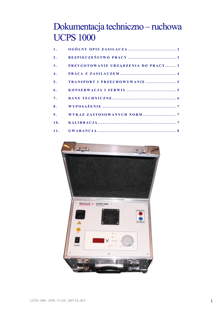 Dokumentacja techniczno – ruchowa UCPS 1000 1. OGÓLNY OPIS ZASILACZA .............................. 2 2. BEZPIECZEŃSTWO PRACY .............................. 3 3. PRZYGOTOWANIE URZĄDZENIA DO PRACY....... 3 4. PRACA Z ZASILACZEM ................................... 4 5. TRANSPORT I PRZECHOWYWANIE ................... 5 6. KONSERWACJA I SERWIS ............................... 5 7. DANE TECHNICZNE ........................................ 6 8. WYPOSAŻENIE .............................................. 7 9. WYKAZ ZASTOSOWANYCH NORM ..................... 7 10. KALIBRACJA ................................................. 7 11. GWARANCJA ................................................. 8 UCPS 1000 DTR V1.0X 2007 EL-JET 1 1. Ogólny opis zasilacza Zasilacz UCPS 1000 jest zasilaczem napięcia stałego. Zasilacz przeznaczony jest do sprawdzania poprawności działania cewek wyłączników WN, SN i NN w zakresie napięć nominalnych, minimalnych i maksymalnych. Szeroki zakres napięć wyjściowych umożliwia badanie cewek zasilanych zarówno napięciem 110VDC jak i 220VDC. Bardzo duża moc zasilacza (1000W) pozwala na sprawdzenie poprawnego działania cewek praktycznie wszystkich typów wyłączników. Zasilacz został wyposażony w szereg zabezpieczeń umożliwiających poprawną i bezawaryjną pracę: · Zabezpieczenie przed zwarciem wyjścia · Zabezpieczenie przed przeciążeniem · Zabezpieczenie przed przegrzaniem Obsługa zasilacza odbywa się z panelu na płycie czołowej urządzenia. Na płycie czołowej zasilacza znajduje się: · Wyświetlacz, · Pokrętło regulatora napięcia wyjściowego, · Diody sygnalizujące - LED zielony - Ready - urządzenie gotowe do pracy - LED czerwony – P>! przekroczona moc zasilacza - LED czerwony – T>! przekroczona temperatura zasilacza · Przycisk kasowania alarmu - Reset · Gniazdo zasilające wraz z bezpiecznikiem (10A zwłoczny) · Włącznik zasilania · Gniazda napięcia wyjściowego · Gniazdo uziemienia · Otwór wentylacyjny UCPS 1000 DTR V1.0X 2007 EL-JET 2 Otwór wentylacyjny Gniazdo sieciowe zasilania Gniazdo uziemienia Gniazda napięcia wyjściowego Diody sygnalizacyjne LED Pokrętło regulatora napięcia wyjściowego Włącznik sieciowy Wyświetlacz amplitudy napięcia wyjściowego 2. Przycisk kasowania alarmu Bezpieczeństwo pracy Zasilacz może być obsługiwany jedynie przez odpowiednio wykształcony i przeszkolony personel. Przed rozpoczęciem pracy należy obowiązkowo zapoznać się z instrukcją obsługi. Otwieranie obudowy, naprawy urządzenia dokonywać mogą jedynie autoryzowane serwisy lub producent. Zasilacz UCPS 1000 należy używać jedynie w środowisku suchym. Woda i wilgoć mogą spowodować uszkodzenie przyrządu Pod żadnym pozorem nie wolno używać zasilacza w środowisku grożącym eksplozją lub wybuchem oraz w środowisku żrącym. 3. Przygotowanie urządzenia do pracy Jeżeli urządzenie zostało przyniesione z niskiej do wyższej temperatury może wystąpić zjawisko kondensacji pary wodnej. W takim przypadku należy odczekać odpowiedni czas aż urządzenie się nagrzeje. UCPS 1000 DTR V1.0X 2007 EL-JET 3 Praca z wilgotnym zasilaczem może prowadzić do uszkodzenia urządzenia. Wszystkich połączeń zasilacza z wyłącznikiem należy dokonać przy użyciu odpowiednich przewodów i adapterów. Stosowanie przewodów wykonanych niedbale, z nieodpowiednich materiałów może prowadzić do uszkodzenia przyrządu i grozi porażeniem prądem elektrycznym!!! Urządzenie należy obowiązkowo uziemić wykorzystując gniazdo uziemiające umieszczone na płycie czołowej urządzenia. Również badany wyłącznik powinien być z jednej strony uziemiony. Punkt uziemienia testera powinien być wspólny z punktem uziemienia wyłącznika. 4. Praca z zasilaczem Po podłączeniu przewodu zasilającego zasilacza do sieci i włączeniu zasilacza włącznikiem sieciowym, urządzenie dokonuje wewnętrznego testu. Jeżeli test przebiegł pomyślnie zaświeci się zielona dioda LED (Ready) i można przystąpić do pracy. Uwaga: Należy zwrócić uwagę, aby podczas podłączania przewodu zasilającego wyłącznik sieciowy znajdował się w pozycji – wyłączonej. · Pokrętłem potencjometru należy ustawić amplitudę napięcia wyjściowego zasilacza · Wyłączyć zasilacz · Połączyć zasilacz z wyłącznikiem · Włączyć ponownie zasilacz · Jeżeli to konieczne – dokonać korekty napięcia wyjściowego · Wykonać testy wyłącznika dla różnych napięć zasilających cewki · Wyłączyć zasilacz UCPS 1000 DTR V1.0X 2007 EL-JET 4 Na spodzie i na górze zasilacza znajdują się otwory wentylacyjne. Otwory wentylacyjne nie mogą być zatkane lub zasłonięte !!!. Podczas dłuższej pracy zasilacza ze znacznym obciążeniem może nastąpić jego przegrzanie. Przegrzanie zasilacza sygnalizowane jest zaświeceniem się czerwonej diody LED T>! oraz wstrzymaniem jego pracy. · Należy odłączyć obciążenie, · Obniżyć napięcie wyjściowe do minimum · Odczekać aż zasilacz ostygnie. · Skasować alarm przyciskiem Reset. · Jeżeli zasilacz nie zostanie ponownie uruchomiony oznacza to, że w dalszym ciągu jest jeszcze przegrzany. Próbę ponownego załączenia należy powtórzyć Przeciążenie zasilacza Praca zasilacza zostanie również wstrzymana w przypadku, gdy obciążenie zasilacza jest zbyt duże, co sygnalizowane jest zaświeceniem czerwonej diody LED P>! Przeciążenie jest często chwilowe i skasowanie alarmu, (Reset) spowoduje ponowne uruchomienie urządzenia W przypadku, gdy alarm przeciążenia nie daje się skasować oznacza to, że obciążenie zasilacza przekracza jego maksymalną moc i test nie może zostać przeprowadzony. Aby uniknąć przeciążenia nie należy z zasilacza zasilać napędu wyłącznika (silnik mechanizmu zbrojenia podczas rozruchu może pobierać nawet dziesiątki amper!!!) 5. Transport i przechowywanie Podczas transportu zasilacz nie powinien ulegać wstrząsom i upadkom. Urządze
