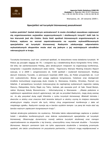Agencja Public Relations CORE PR Siedziba: ul. Algierska 25B, 03-977 Warszawa Tel. (+48 22) 402 96 10 Fax. (+48 22) 402 96 20 Warszawa, dn. 20 sierpnia 2009 r. Specjaliści od turystyki biznesowej poszukiwani Lubisz podróŜe? Jesteś dobrym animatorem? A moŜe chciałbyś zawodowo zajmować się organizowaniem wyjazdów wypoczynkowych i słuŜbowych innych? Jeśli tak to ten kierunek jest dla Ciebie. DuŜa ilość spotkań biznesowych organizowanych w Polsce, wpływa specjalistów od na wzrost turystyki zapotrzebowania biznesowej. na Radzymin wysoko wykwalifikowanych zdobywając odpowiednio wykształconych ekspertów moŜe stać się jednym z jej waŜniejszych ośrodków rekreacyjnych w kraju. Turystyka biznesowa, czyli tzw. przemysł spotkań, to stosunkowo nowa dziedzina turystyki. W Polsce jej początki sięgają lat 70. i związane są z działalnością Biura Kongresów firmy Orbis. Od kilku lat zainteresowanie Polską, jako atrakcyjnym miejscem na organizację konferencji, kongresów i wyjazdów słuŜbowych stale rośnie. Tegoroczny Warsaw Meeting Industry Report szacuje, iŜ w 2009 r. zorganizowano ok. 4100 spotkań i wydarzeń biznesowych. Według danych Instytutu Turystki, w pierwszym kwartale 2009 roku, do Polski przyjechało ok. 11,8 mln cudzoziemców. Biorąc pod uwagę zaplecze kongresowe, hotelowe oraz dostępność środków komunikacji wygrywają duŜe miasta tj. Warszawa, Kraków, Wrocław, Poznań czy Gdańsk. Z perspektywy turystyki motywacyjnej do najchętniej wybieranych regionów naleŜą Mazury, Małopolska, Dolny Śląsk czy Tatry. Jednak, jak zauwaŜa prof. dr hab. Paweł BoŜyk, rektor WyŜszej Szkoły Ekonomiczno – Informatycznej w Warszawie - „Miasta połoŜone w najbliŜszym sąsiedztwie duŜych aglomeracji, tak jak na przykład Radzymin, mają duŜą szansę na to aby pozyskać duŜą część Klientów z rynku turystyki biznesowej. Bliskość lotniska i dworców w stolicy oraz znaczna ilość terenów leśnych w okolicy czynią to miejsce niezwykle atrakcyjnym między innymi dla tych, którzy chcą zorganizować konferencje z dala od miejskiego zgiełku. Radzymin rozwija się w bardzo szybkim tempie i za parę lat moŜe stać się bardzo waŜnym zapleczem kongresowym kraju”. Jednak atrakcyjne połoŜenie nie wystarczy. Potrzeba takŜe odpowiedniego zaplecza w postaci hoteli i ośrodków konferencyjnych oraz dobrze wykształconych specjalistów od turystyki biznesowej. Obserwując dynamiczny rozwój sektora turystyki słuŜbowej oraz rosnące zapotrzebowanie na ekspertów z tej branŜy, utworzyliśmy nowy kierunek studiów - Turystyka Biznesowa. Naszym zamiarem było nie tylko zapoznanie studentów z tematyką przemysłu spotkań, ale takŜe umoŜliwienie im pozyskania partnerów, z którymi mogą współpracować w Agencja Public Relations CORE PR Siedziba: ul. Algierska 25B, 03-977 Warszawa Tel. (+48 22) 402 96 10 Fax. (+48 22) 402 96 20 ramach swoich projektów- tłumaczy prof. dr hab. Paweł BoŜyk, rektor WyŜszej Szkoły Ekonomiczno – Informatycznej. #### WyŜsza Szkoła Ekonomiczno-Informatyczna w Warszawie powstała 10 lipca 1996 roku na podstawie zezwolenia Ministra Edukacji Narodowej i Sportu. Od początku zapewnia wysoki poziom kształcenia, a celem nauczania jest jak najlepsze przygotowanie absolwentów do pracy zawodowej. Szkoła zatrudnia ponad 260 nauczycieli akademickich, w tym 90 profesorów i doktorów habilitowanych. Są to wykładowcy o najwyŜszych kwalifikacjach naukowych i zawodowych. Uczelnia łączy akademicki i biznesowy charakter kształcenia, dzięki czemu absolwenci są wyposaŜeni nie tylko w wiedzę teoretyczną, ale przede wszystkim otrzymują znakomite przygotowanie praktyczne. Obok atrakcyjnego i oryginalnego programu szkoła zapewnia studentom równieŜ stały kontakt z najlepszymi wykładowcami oraz liczne praktyki zawodowe. Kontakt dla mediów: Michał Czekański CORE PR Tel.: 22 406 96 10; 22 406 96 20 e-mail: [email protected]