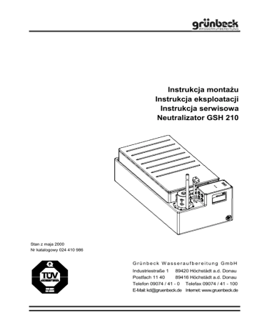 Instrukcja montażu Instrukcja eksploatacji Instrukcja serwisowa Neutralizator GSH 210 Stan z maja 2000 Nr katalogowy 024 410 986 Neutralizator GSH 210 2 Neutralizator GSH 210 Spis treści A Wskazówki ogólne ............................................................ 3 1 2 3 4 5 Wstęp Gwarancja Ogólne wskazówki bezpieczeństwa Transport i składowanie Utylizacja części złomowanych i materiałów eksploatacyjnych B Podstawowe informacje ................................................... 6 1 Ustawy, rozporządzenia, normy 2 Neutralizacja C Opis produktu ................................................................... 7 1 2 3 4 5 6 Tabliczka znamionowa Zakres dostawy Sposób pracy Obsługa Dane techniczne Stosowanie zgodnie z przeznaczeniem D Instalowanie / Uruchomienie .......................................... 11 1 2 3 4 Wskazówki ogólne Instalacja sanitarna – wskazówki instalowania Instalacja elektryczna – wskazówki instalowania Uruchomienie E Zakłócenia ....................................................................... 17 F Konserwacja .................................................................... 18 1 Podstawowe wskazówki 2 Przeglądy 3 Konserwacja G Lista części zamiennych i osprzętu ................................ 20 Załącznik: Dziennik eksploatacji Stopka redakcyjna Wszystkie prawa zastrzeżone. Copyright by Grünbeck Wasseraufbereitung GmbH Obowiązuje data wydania na stronie tytułowej. - Zmiany służące postępowi technicznemu zastrzeżone – Niniejszą instrukcję wolno tłumaczyć na języki obce, przedrukowywać, przenosić na nośniki danych lub powielać w inny sposób, także we fragmentach, wyłącznie za wyraźną pisemną zgodą firmy Grünbeck Wasseraufbereitung. Każdy rodzaj powielania nie zaakceptowany przez firmę Grünbeck stanowi naruszenie praw autorskich i będzie ścigany sądownie. Wydawca odpowiedzialny za treść: Grünbeck Wasseraufbereitung GmbH Industriestraße 1, 89240 Höchstadt a.d. Donau skr. poczt. 1140, 89416 Höchstadt a.d. Donau Telefon 09074/41-0 Telefaks 09074/41- 100 e-mail: [email protected] internet: www.gruenbeck.de 1 Neutralizator GSH 210 Deklaracja zgodności EWG Niniejszym oświadczamy, że niżej opisane urządzenie, pod względem jego koncepcji, budowy i wyprowadzonego przez nas do obrotu wykonania, odpowiada podstawowym wymaganiom bezpieczeństwa i higieny wynikającym z odnośnych dyrektyw EWG. Deklaracja niniejsza traci ważność w przypadku dokonania nie uzgodnionych z nami zmian w urządzeniu. Określenie urządzenia: Neutralizator Typ urządzenia: GSH 210 Numer urządzenia: patrz tabliczka znamionowa Odnośne dyrektywy EWG: Dyrektywa EWG Maszyny (89/392/EWG w wersji 91/368/EWG) Dyrektywa EWG Kompatybilność elektromagnetyczna (89/336/EWG w wersji 92/31/EWG Dyrektywa EWG Niskie napięcie (73/23/EWG i 93/68/EWG) Zastosowane normy DIN EN 292-1 i DIN EN 292-2 zharmonizowane, zwłaszcza: DIN EN 50 081-1, DIN EN 50 082-2. Pierwsze rozporządzenie do ustawy o bezpieczeństwie urządzeń z 11.06.1979 (BGB1) Zastosowane normy narodowe i specyfikacje techniczne, zwłaszcza: ATV-A 251 (11/98); DVGW-VP114 Data i podpis producenta: 12.05.2000 Funkcja podpisującego: 2 dr inż G. Stoll Dyrektor Techniczny Neutralizator GSH 210 A Wskazówki ogólne 1 Wstęp Cieszymy się, że zdecydowali się Państwo na urządzenie firmy Grünbeck. Od wielu lat zajmujemy się problematyką uzdatniania i obróbki wody i dla każdego problemu z wodą dysponujemy rozwiązaniem na miarę potrzeb. Wszystkie urządzenia firmy Grünbeck wytwarzane są z wysokojakościowych materiałów. Gwarantuje to ich długą, niezakłóconą eksploatację, o ile neutralizatory nasze będą traktowane z należytą starannością. Pomogą w tym informacje zawarte w niniejszej instrukcji eksploatacji. Dlatego instrukcję tę należy przeczytać, zanim przystąpi się do instalowania, obsługi lub konserwacji urządzenia. Naszym celem jest zadowolenie Klientów. Dlatego firma Grünbeck kładzie duży nacisk na profesjonalne doradztwo. Tak więc we wszelkich kwestiach związanych z tym urządzeniem, możliwościach jego rozbudowy, czy też ogólnie w sprawach związanych z uzdatnianiem i obróbką wody i ścieków są do Państwa dyspozycji zarówno nasi przedstawiciele handlowi, jak i eksperci z naszego zakładu macierzystego w Höchstädt. Radę i pomoc uzyskają Państwo w naszym właściwym terytorialnie przedstawicielstwie (patrz załączony wykaz). W nagłych przypadkach do dyspozycji jest nasza „gorąca linia” serwisowa 0049 90 74 / 41 – 400. Telefonując tam prosimy podać dane Waszego urządzenia, co umożliwi szybkie połączenie bezpośrednio z właściwym ekspertem. Aby potrzebne dane mieć zawsze pod ręką, proponujemy wpisać je na tabliczkę znamionową zamieszczoną w rozdziale C. 2 Gwarancja Wszystkie aparaty i urządzenia firmy Grünbeck Wasseraufbereitung GmbH wytwarzane są wg uznanych zasad techniki i poddawane są obszernym kontrolom jakościowym. Jeśli mimo to zaistniały by jakiekolwiek powody do zastrzeżeń, to prosimy zgłaszać je na zasadach ogólnych warunków sprzedaży i dostaw firmy Viessmann i porozumień dodatkowych pomiędzy firmami Viessmann i Grünbeck. 3 Neutralizator GSH 210 3 Ogólne wskazówki bezpieczeństwa 3.1 Symbole i wskazówki S TO P Ważne wskazówki, podawane w niniejszej instrukcji, akcentowane są symbolami. Dla zapewnienia bezpiecznej i ekonomicznej eksploatacji urządzenia należy zwracać szczególną uwagę na przestrzeganie tych właśnie wskazówek. Niebezpieczeństwo! Zlekceważenie tak oznaczonych wskazówek prowadzi do ciężkich i nawet niebezpiecznych dla życia obrażeń ciała, poważnych strat materialnych lub niedopuszczalnego zanieczyszczenia wody pitnej Ostrzeżenie! Zlekceważenie tak oznaczonych wskazówek może w pewnych okolicznościach doprowadzić do zranień, szkód materialnych lub zanieczyszczenia wody pitnej. Uwaga! Zlekceważenie tak oznaczonych wskazó