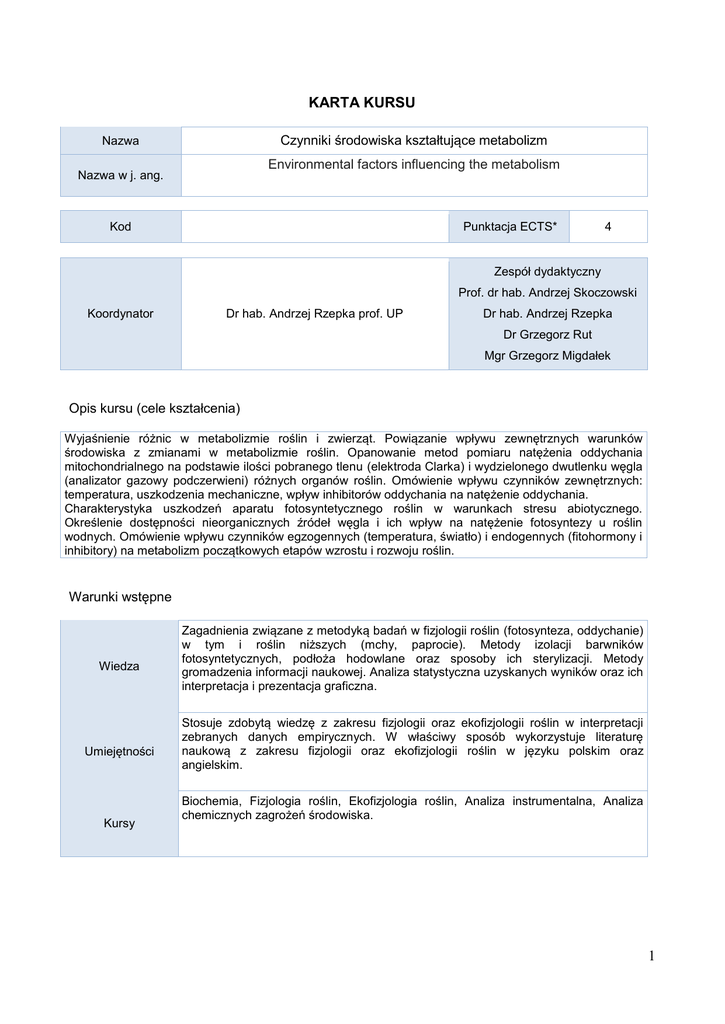 KARTA KURSU Czynniki środowiska kształtujące metabolizm Nazwa Environmental factors influencing the metabolism Nazwa w j. ang. Kod Punktacja ECTS* 4 Zespół dydaktyczny Prof. dr hab. Andrzej Skoczowski Koordynator Dr hab. Andrzej Rzepka prof. UP Dr hab. Andrzej Rzepka Dr Grzegorz Rut Mgr Grzegorz Migdałek Opis kursu (cele kształcenia) Wyjaśnienie różnic w metabolizmie roślin i zwierząt. Powiązanie wpływu zewnętrznych warunków środowiska z zmianami w metabolizmie roślin. Opanowanie metod pomiaru natężenia oddychania mitochondrialnego na podstawie ilości pobranego tlenu (elektroda Clarka) i wydzielonego dwutlenku węgla (analizator gazowy podczerwieni) różnych organów roślin. Omówienie wpływu czynników zewnętrznych: temperatura, uszkodzenia mechaniczne, wpływ inhibitorów oddychania na natężenie oddychania. Charakterystyka uszkodzeń aparatu fotosyntetycznego roślin w warunkach stresu abiotycznego. Określenie dostępności nieorganicznych źródeł węgla i ich wpływ na natężenie fotosyntezy u roślin wodnych. Omówienie wpływu czynników egzogennych (temperatura, światło) i endogennych (fitohormony i inhibitory) na metabolizm początkowych etapów wzrostu i rozwoju roślin. Warunki wstępne Wiedza Umiejętności Kursy Zagadnienia związane z metodyką badań w fizjologii roślin (fotosynteza, oddychanie) w tym i roślin niższych (mchy, paprocie). Metody izolacji barwników fotosyntetycznych, podłoża hodowlane oraz sposoby ich sterylizacji. Metody gromadzenia informacji naukowej. Analiza statystyczna uzyskanych wyników oraz ich interpretacja i prezentacja graficzna. Stosuje zdobytą wiedzę z zakresu fizjologii oraz ekofizjologii roślin w interpretacji zebranych danych empirycznych. W właściwy sposób wykorzystuje literaturę naukową z zakresu fizjologii oraz ekofizjologii roślin w języku polskim oraz angielskim. Biochemia, Fizjologia roślin, Ekofizjologia roślin, Analiza instrumentalna, Analiza chemicznych zagrożeń środowiska. 1 Efekty kształcenia Efekt kształcenia dla kursu Odniesienie do efektów kierunkowych W01 Objaśnia znaczenie procesów katabolicznych na K_W04 poziomie molekularnym, komórkowym dla organizmu w powiązaniu z wpływem czynników środowiskowych. W02 Opisuje mechanizmy wiązania dwutlenku węgla u K_W02, K_W10, K_W04 roślin w powiązaniu z rozmieszczeniem geograficznym i przystosowaniami anatomicznymi. W03 Wyjaśnia wpływ zanieczyszczeń środowiska na K_W03, K_W06 przebieg procesów fizjologicznych u organizmów roślinnych. Wiedza W04 Objaśnia przystosowania w budowie anatomicznej i K_W06, K_W07 morfologicznej do odmiennych środowisk życia. W05 Rozumie znaczenie fitohormonów dla prawidłowego K_W03, K_W04 wzrostu i rozwoju roślin. W06 Zna i interpretuje rolę inhibitorów wzrostu i rozwoju K_W03, K_W04 roślin w procesach anabolicznych i katabolicznych. W07 Tłumaczy zmiany natężenia procesów K_W04, K_W05 metabolicznych zachodzących na poszczególnych etapach wzrostu i rozwoju organizmu roślinnego. W08 Wyjaśnia wpływ czynników środowiskowych na K_W03, K_W04 zmiany metaboliczne w procesie fotosyntezy i oddychania. 2 Odniesienie do efektów kierunkowych Efekt kształcenia dla kursu U01 Przeprowadza eksperymenty wykazujące różnice K_U01, K_U04, K_U06 między roślinami C3 i C4. U02 Weryfikuje wpływ czynników egzo i endogennych na K_U06, K_U04, K_U08 intensywność przebiegu oddychania mitochondrialnego Umiejętności U03 Dokonuje metabolicznego zewnętrznymi. analizy przebiegu w powiązaniu danego procesu K_U01, K_U06 z warunkami U04 Wykorzystuje znajomość obsługi aparatury K_U04 pomiarowej niezbędnej w pracy doświadczalnej. U05 Dokonuje analizy danych pomiarowych K_U05, K_U07 pochodzących z różnych źródeł i wyciąga na tej podstawie wnioski U06 Interpretuje wpływ zanieczyszczeń środowiska na K_U04, K_U06 funkcjonowanie oraz metabolizm organizmów roślinnych. Odniesienie do efektów kierunkowych Efekt kształcenia dla kursu Kompetencje społeczne K01 Sprawnie organizuje pracę samodzielnie i w małej K_K02, K_K03, K_K09, grupie K_K10 K02 Dba o powierzone szkło i sprzęt laboratoryjny K_K03 zgodnie z obowiązującymi procedurami i przepisami BHP K03 Wykazuje samodzielność w organizowaniu sobie K_K03, K_K09 stanowiska pracy Organizacja Forma zajęć Ćwiczenia w grupach Wykład (W) A Liczba godzin 5 K L S P E 15 3 Opis metod prowadzenia zajęć Wykład w formie prezentacji multimedialnej obejmuje zagadnienia wpływu zewnętrznych warunków środowiska na zmiany w metabolizmie roślin. Ćwiczenia laboratoryjne opierają się na pracy indywidualnej i 2-3 osobowych grupach. Studenci przeprowadzają pomiary natężenia wymiany gazowej roślin (fotosynteza, oddychanie), fluorescencji oraz stężenia chlorofilu z wykorzystaniem aparatury badawczej. Wykonują pomiary biometryczne przydatne w ocenie pierwszych etapów wzrostu i rozwoju roślin. Omówienie ćwiczeń w formie prezentacji multimedialnej. Ocena sprawozdań z przeprowadzonych pomiarów w czasie ćwiczeń. Aparatura wykorzystywana podczas ćwiczeń: analizatory gazowe podczerwieni: Ciras 2, ADC MK3, fluorymetr FMS, FLUORCAM FC, spektrofotometr CECIL Aquarius 9500, komory fititonowe z światłem niebieskim, czerwonym lub dalekiej czerwieni. W01 W02 W03 W04 W05 W06 W07 W08 U01 U02 U03 U04 U05 U06 K01 K02 K03 Kryteria oceny x x x x x x x x x x x x x x x Inne Egzamin pisemny Egzamin ustny Praca pisemna (esej) Referat Udział w dyskusji Projekt grupowy Projekt indywidualny Praca laboratoryjna Zajęcia terenowe Ćwiczenia w szkole Gry dydaktyczne E – learning Formy sprawdzania efektów kształcenia x x x x x x x x x x x Egzamin: egzamin pisemny z pytaniami zamkniętymi (50 pytań, dla każdego pytania 4 odpowiedzi). Ocena z ćwiczeń obejmująca: sprawdzenie przygotowania teoretycznego, ocenę sprawozdań, kolokwium zaliczeniowego z pytaniami zamkniętymi i otwartymi. Omówienie sprawozdań i ich interpretacja oraz wyników kol