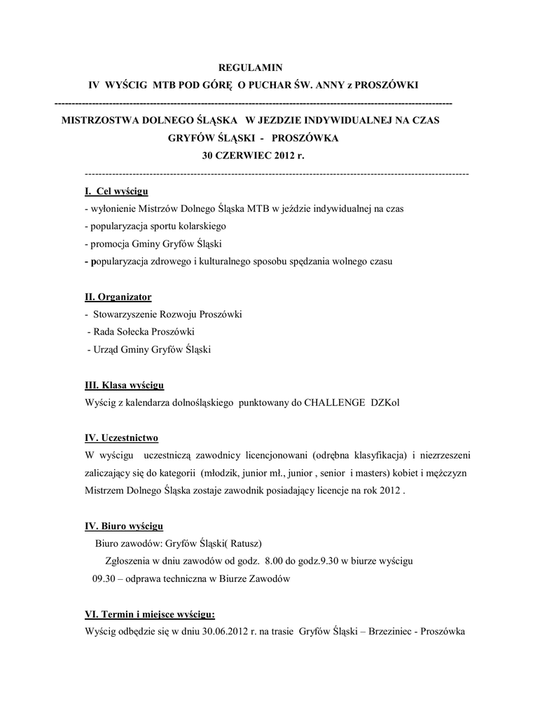 REGULAMIN IV WYŚCIG MTB POD GÓRĘ O PUCHAR ŚW. ANNY z PROSZÓWKI --------------------------------------------------------------------------------------------------------------------MISTRZOSTWA DOLNEGO ŚLĄSKA W JEZDZIE INDYWIDUALNEJ NA CZAS GRYFÓW ŚLĄSKI - PROSZÓWKA 30 CZERWIEC 2012 r. ----------------------------------------------------------------------------------------------------------------I. Cel wyścigu - wyłonienie Mistrzów Dolnego Śląska MTB w jeździe indywidualnej na czas - popularyzacja sportu kolarskiego - promocja Gminy Gryfów Śląski - popularyzacja zdrowego i kulturalnego sposobu spędzania wolnego czasu II. Organizator - Stowarzyszenie Rozwoju Proszówki - Rada Sołecka Proszówki - Urząd Gminy Gryfów Śląski III. Klasa wyścigu Wyścig z kalendarza dolnośląskiego punktowany do CHALLENGE DZKol IV. Uczestnictwo W wyścigu uczestniczą zawodnicy licencjonowani (odrębna klasyfikacja) i niezrzeszeni zaliczający się do kategorii (młodzik, junior mł., junior , senior i masters) kobiet i mężczyzn Mistrzem Dolnego Śląska zostaje zawodnik posiadający licencje na rok 2012 . IV. Biuro wyścigu Biuro zawodów: Gryfów Śląski( Ratusz) Zgłoszenia w dniu zawodów od godz. 8.00 do godz.9.30 w biurze wyścigu 09.30 – odprawa techniczna w Biurze Zawodów VI. Termin i miejsce wyścigu: Wyścig odbędzie się w dniu 30.06.2012 r. na trasie Gryfów Śląski – Brzeziniec - Proszówka Start godz.10.00 Gryfów Śląski Rynek meta : Proszówka góra Św. Anny Kapliczka VII. Sposób przeprowadzenia wyścigu: - jazda indywidualna na czas pod górę rozegrana zostanie w 24 kategoriach W dniu 30.06.2012r. (sobota) Dystans 11,5 km. Start zawodników co 1 min. Zakończenie około godz. 14.00 – Góra Św. Anny (meta) Wyścig odbędzie się zgodnie z przepisami PZKol. i niniejszym regulaminem. Wyścig jest rozgrywany w następujących kategoriach wiekowych licencja i niezrzeszeni : Młodzik/czka 13 -14 lat rocznik 1999-1998 Junior/ka mł. 15 -16 lat rocznik 1997-1996 Junior/ka 17 -18 lat rocznik 1995-1994 Senior/ka 19 - lat rocznik 1993 i starszy/a Masters K30+ 30- lat rocznik 1982 i starsza I Masters 30 - 39 lat rocznik 1982-1973 II Masters 40 – 49 lat rocznik 1972-1963 III Masters 50 lat - rocznik 1962 i starszy Startujący winni: posiadać pełny kask, sprawny technicznie rower górski z dwoma czynnymi hamulcami, zawodnicy z licencją aktualne badania lekarskie, zawodnicy bez licencji wypełnią zgłoszenie do wyścigu a Ci którzy nie ukończyli 18 lat winni posiadać pisemną zgodę rodzica lub prawnego opiekuna zezwalającą na start w wyścigu. VII Klasyfikacja : Zwycięzcą wyścigu zostanie zawodnik, który uzyska najlepszy czas przejazdu na powyższym dystansie. VIII. Finansowanie: Opłata startowa w wyścigu dla zawodników z licencją wynosi wg stawek PZKol i kalendarza masters na rok 2012. Opłata startowa dla niezrzeszonych: Młodzik/czka 13 -14 lat, Junior/ka mł. 15 -16 lat, wg Pzkol nie płacą Junior/ka 17 -18 5 ,zł Seniorka 10 zł Senior 10 zł I , II , III Masters, i Masters K30+ 10,-zł Koszty uczestnictwa pokrywają sami uczestnicy. Koszty organizacyjne i komisji sędziowskiej pokrywa organizator. IX. Nagrody: Puchar za najlepszy czas przejazdu licencja i niezrzeszeni Medale MDŚ licencja I do III miejsca Nagrody rzeczowe I do III miejsca Dyplomy od I do VI miejsce Jeżeli w danej kategorii będzie mniej niż 10 zawodników/czek , nagradzany będzie tylko zwycięzca. Każdy uczestnik wyścigu, po oddaniu numeru startowego otrzyma bon na posiłek X. Postanowienia Końcowe: Komisję sędziowską wyznaczy Kolegium DZKol na wniosek organizatora. Sędzia Główny wyścigu Wiesław Kucab z Jeleniej Góry tel. Kom. 607 495 737 Organizator nie odpowiada za wypadki spowodowane przez zawodników bądź osoby towarzyszące w trakcie trwania wyścigu. Organizator nie ponosi odpowiedzialności za rzeczy skradzione , zagubione lub zniszczone przed , w trakcie i po imprezie. Organizator w porozumieniu z sędzią głównym zastrzegają sobie prawo ewentualnych zmian w regulaminie we wszystkich sprawach w nim nie ujętych. Zawodnicy powinni posiadać ubezpieczenie NW i OC XI. Osoby odpowiedzialne za organizację imprezy - Biuro Zawodów: Agnieszka August tel. 501 306 950 Adriana Karpowicz tel. 500 101 651 Adres szpitala: Jelenia Góra, ul. Ogińskiego 6, tel. +48 (075) 75-31-905, 75-42-048 Regulamin zatwierdzono dnia 17.05.2012 DZKol Wrocław – T. Daszkiewicz