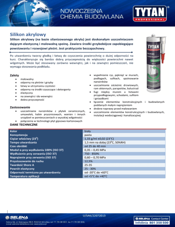 ` Silikon akrylowy Silikon akrylowy (na bazie silanizowanego akrylu) jest doskonałym uszczelniaczem dającym elastyczną i malowalną spoinę. Zawiera środki grzybobójcze zapobiegające powstawaniu i rozwojowi pleśni. Jest praktycznie bezzapachowy. Po utwardzeniu tworzy gładką i łatwą do czyszczenia powierzchnię o dużej odporności na kurz. Charakteryzuje się bardzo dobrą przyczepnością do większości powierzchni nawet wilgotnych. Może być stosowany zarówno wewnątrz, jak i na zewnątrz pomieszczeń, nie wymaga stosowania podkładu. Zalety malowalny odporny na pleśnie i grzyby łatwy w utrzymaniu czystości odporny na środki czyszczące i detergenty elastyczny na zewnątrz i do wewnątrz dobra przyczepność Zastosowanie uszczelnianie narożników z płytek ceramicznych, umywalek, kabin prysznicowych, wanien i innych urządzeń w pomieszczeniach o wysokiej wilgotności połączenia w technologii płyt gipsowo-kartonowych wypełnianie rys, pęknięć w murach, podłogach, sufitach, spoinowanie narożników uszczelnianie ościeżnic drzwiowych, ram okiennych, parapetów, balustrad fugi między murem a listwami przypodłogowymi, schodami, sufitem i gniazdkami łączenie elementów konstrukcyjnych i budowlanych poddanych małym naprężeniom drobne naprawy przed malowaniem uszczelnianie elementów konstrukcyjnych i budowlanych, instalacji wodociągowej i kanalizacyjnej DANE TECHNICZNE Kolor Konsystencja Ciężar właściwy (230) Tempo utwardzania Czas obróbki Moduł α przy wydłużeniu 100% (ISO 37) Wydłużenie przy zerwaniu (ISO 37) Naprężenie przy zerwaniu (ISO 37) Przystosowanie do ruchu Twardość Shore A Powrót elastyczny Odporność termiczna po utwardzeniu Temperatura aplikacji biały pasta 1,33 g/ml ±0,02 (23°C) 1,5 mm na dobę (230C, 50%RH) od 25 do 40 min 0,35 – 0,45 MPa 750 - 850% 0,60 – 0,70 MPa 12,5% 25-35 25 - 30% od -20°C do +60°C od +5°C do +40°C U/SAK/22072013 ` SPOSÓB UŻYCIA Przygotowanie podłoża łączone powierzchnie powinny być czyste, bez kurzu, rdzy, luźnych kawałków starego uszczelniacza lub farb, smarów i olejów oraz innych zanieczyszczeń obniżających przyczepność szczeliwa powierzchnie porowate, przesuszone zaleca się lekko zwilżyć w celu zwiększenia przyczepności akrylu Aplikacja uszczelniacza akryl układamy za pomocą wyciskaczy mechanicznych z z kartuszy 310 ml. W przypadku folii używamy wyciskaczy mechanicznych lub pneumatycznych przed użyciem należy obciąć końcówkę kartusza pozostawiając część gwintu do wkręcania dyszy wylotowej. Dyszę wylotową obciąć pod kątem ostrym na szerokość spoiny w celu uniknięcia zabrudzenia okolic szczeliny oraz utrzymania równej linii stosujemy taśmy samoprzylepne, które usuwamy natychmiast po zakończeniu obróbki szczeliwa. Spoiny należy wygładzić kostką Tytan do rozprowadzania silikonu, szpatułką, palcem lub szmatką zamoczoną dla zmniejszenia przyczepności w roztworze detergentu ponadto należy pamiętać o dokładnym wypełnieniu spoin w celu zapewnienia dokładnego i ciągłego przylegania szczeliwa do powierzchni obrabialnej Czyszczenie nadmiar nieutwardzonego akrylu z rąk, narzędzi i zabrudzonych powierzchni należy usunąć ręcznikiem papierowym przed jego utwardzeniem po utwardzeniu silikon z rąk należy usunąć wodą z mydłem, a z narzędzi w sposób mechaniczny OGRANICZENIA STOSOWANIA silikonu nie należy stosować na powierzchniach bitumicznych, podłożach na bazie naturalnego kauczuku, chloroprenowych lub na materiałach, które mogą wydzielać oleje, plastyfikatory lub rozpuszczalniki nie zaleca się do stosowania powierzchniach narażonych na ciągły(stały) kontakt z wodą silikonu nie zaleca się do stosowania na wrażliwych powierzchniach metalowych np. miedzi i jej stopach lub srebrzance luster silikonu nie jest przeznaczony zarówno do kontaktów z żywnością, jak i do zastosowań medycznych. Produkt nie był badany ani przekładany do testów dopuszczających zastosowania medyczne i farmaceutyczne PRZECHOWYWANIE I OPAKOWANIE Okres przechowywania 12 miesięcy w suchych i chłodnych pomieszczeniach w szczelnie oryginalnie zamkniętych opakowaniach w temperaturze od +5°C do +25°C. Dostępne kolory: biały Dostępne pojemności: 310ml Zużycie Ostrzeżenia i zalecenia BHP Należy przestrzegać zwykłych zasad higieny pracy. Unikać kontaktu z oczami i skórą. Stosować w miejscach z dobrą wentylacją. Chronić przed dziećmi. PRZED ZASTOSOWANIEM NALEŻY ZAPOZNAĆ SIĘ Z KARTĄ BEZPIECZEŃSTWA PRODUKTU LUB PRZECZYTAĆ ETYKIETĘ NA OPAKOWANIU. Data sporządzenia 22.07.2013 Powyższe dane, zalecenia i wskazówki opierają się na naszej najlepszej wiedzy, badaniach oraz doświadczeniach i zostały udzielone w dobrej wierze, zgodnie z zasadami obowiązującymi w naszej firmie i u naszych dostawców. Zaproponowane sposoby postępowania uznane są za powszechne, jednak każdy z użytkowników tego materiału powinien upewnić się na wszelkie możliwe sposoby, włącznie ze sprawdzeniem produktu końcowego w odpowiednich warunkach, o przydatności dostarczanych materiałów dla osiągnięcia celów przez niego zamierzonych. Ani Spółka, ani jej upoważnieni przedstawiciele nie mogą ponosić odpowiedzialności za jakiekolwiek straty poniesione na skutek nieprawidłowego, bądź błędnego użycia jej materiałów. U/SAK/22072013