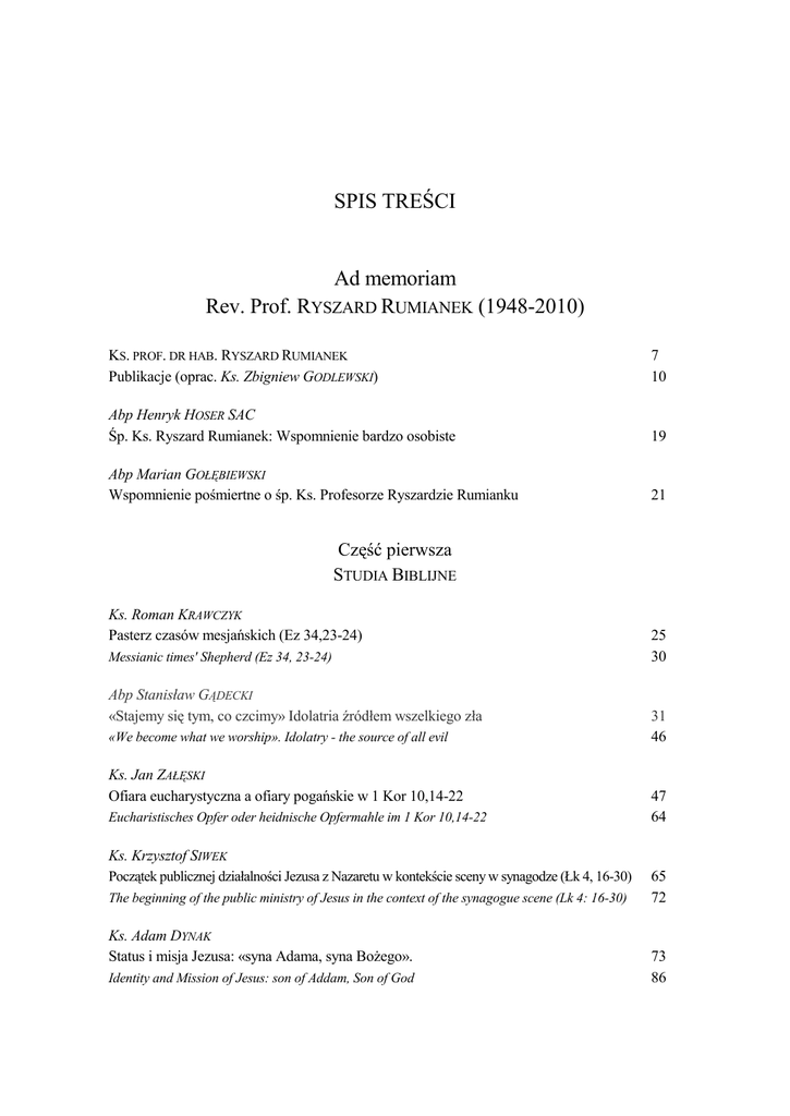 SPIS TREŚCI Ad memoriam Rev. Prof. RYSZARD RUMIANEK (1948-2010) KS. PROF. DR HAB. RYSZARD RUMIANEK Publikacje (oprac. Ks. Zbigniew GODLEWSKI) 7 10 Abp Henryk HOSER SAC Śp. Ks. Ryszard Rumianek: Wspomnienie bardzo osobiste 19 Abp Marian GOŁĘBIEWSKI Wspomnienie pośmiertne o śp. Ks. Profesorze Ryszardzie Rumianku 21 Część pierwsza STUDIA BIBLIJNE Ks. Roman KRAWCZYK Pasterz czasów mesjańskich (Ez 34,23-24) Messianic times' Shepherd (Ez 34, 23-24) Abp Stanisław GĄDECKI «Stajemy się tym, co czcimy» Idolatria źródłem wszelkiego zła «We become what we worship». Idolatry - the source of all evil Ks. Jan ZAŁĘSKI Ofiara eucharystyczna a ofiary pogańskie w 1 Kor 10,14-22 Eucharistisches Opfer oder heidnische Opfermahle im 1 Kor 10,14-22 Ks. Krzysztof SIWEK Początek publicznej działalności Jezusa z Nazaretu w kontekście sceny w synagodze (Łk 4, 16-30) The beginning of the public ministry of Jesus in the context of the synagogue scene (Lk 4: 16-30) Ks. Adam DYNAK Status i misja Jezusa: «syna Adama, syna BoŜego». Identity and Mission of Jesus: son of Addam, Son of God 25 30 31 46 47 64 65 72 73 86 566 SPIS TREŚCI Część druga STUDIA O KAPŁAŃSTWIE Ks. Krzysztof BARDSKI Symbolika kapłaństwa w obrazach biblijnych 89 The symbolism of the priesthood in Biblical Images 104 Ks. Józef WARZESZAK Duch Święty a kapłaństwo w ujęciu Jana Pawła II Holy Spirit and priesthood in John Paul II teaching Jacek SALIJ OP Eucharystyczny kształt posługi kapłańskiej Eucharistic Dimension of the priestly ministry Izabella SMENTEK Wymagania wobec kapłanów w niełatwym kontekście współczesności na podstawie wypowiedzi Benedykta XVI związanych z Rokiem Kapłańskim Herausforderungen Papst Benedikts XVI an den Priestern im Priesterjahr Ks. Józef WARZESZAK Teologia kapłaństwa w przemówieniach Benedykta XVI w Roku Kapłańskim Teologia del sacerdozio nei discorsi di Benedetto XVI durante l’anno sacerdotale Ks. Marek STAROWIEYSKI Kapłaństwo w literaturze Il sacerdozio nella letteratura Zdzisława S. SPECHT-ABRAMIUK Wychowawcza rola dramaturgii w Ŝyciu Karola Wojtyły Educational meaning of dramaturgy in Karol Wojtyła’s life 105 134 135 141 143 156 157 182 183 196 197 212 Część trzecia STUDIA O BŁ. KS. JERZYM POPIEŁUSZCE Ks. Cezary SMUNIEWSKI Kościół w myśli błogosławionego ks. Jerzego Popiełuszki The Church according to the Blessed Fr Jerzy Popiełuszko Ks. Jan SOCHOŃ Ksiądz Jerzy Popiełuszko: W kręgu kultury przykościelnej Father Jerzy Popiełuszko: In a Church Culture Circle Ks. Piotr BURGOŃSKI Polski patriotyzm w dobie komunizmu Polish patriotism during the communist regime 215 230 231 240 241 252 567 TABLE DES MATIÈRES Część czwarta STUDIA Z TEOLOGII I HISTORII IDEI Waldemar LINKE CP Adhortacja «Verbum Domini» a przyszłość dyskusji o rozumieniu natchnienia Exhortation «Verbum Domini» and the future of discussion about biblical inspiration Ks. Jan MIAZEK Liturgia jako uprzywilejowana przestrzeń Słowa BoŜego według Verbum Domini Liturgia come spazio Della parola di Dio nell’Esortazione Apostolica Verbum Domini Ks. Grzegorz BACHANEK Ruchy religijne w perspektywie teologicznej Josepha Ratzingera Kirchliche Bewegungen in der theologischen Perspektive von Josef Ratzinger Krzysztof SZWARC Rahner’s Anthropological Return 255 268 269 279 281 291 293 305 Rahnerowski zwrot antropologiczny Ks. Jacek GRZYBOWSKI Bóg Abrahama – Bóg Derridy? The God of Abraham – The God of Derrida? Ks. Janusz FRANKOWSKI Człowiek i wojna (kilka luźnych uwag) 307 322 323 338 L’Homme et la guerre Część piąta RECENZJE I OMÓWIENIA Jan WOLSKI, Bioetyka w perspektywie personalizmu Zdzisława S. SPECHT-ABRAMIUK 341 Rafał CZEKALSKI, Personalistyczne podstawy wychowania Ks. Stanisław WARZESZAK 344 Michael NOVAK, Boga nikt nie widzi. Noc ciemna ateistów i wierzących Ks. Andrzej PERZYŃSKI 345 Lucjan BALTER SAC, Eschatologia współczesna dla duszpasterzy i katechetów Izabella SMENTEK 356 568 SPIS TREŚCI Dogmatyka w perspektywie BoŜego Miłosierdzia, red. K. GÓŹDŹ, K. GUZOWSKI Izabella SMENTEK 358 Paul Josef CORDES, Dlaczego kapłan? Poszukiwanie odpowiedzi z Benedyktem XVI Ks. Józef WARZESZAK 360 Klaus WENGST, «Wie lange noch». Schreien nach Recht und Gerechtigkeit – eine Deutung der Apokalypse des Johannes Ks. Jan ZAŁĘSKI 362 OMÓWIENIA – VARSAVIANA Ks. Marek STAROWIEYSKI 367 Część szósta KRONIKA PWTW XX-lecie PWTW 377 Pracownicy naukowi PWTW 380 Kronika za rok akademicki 2009/2010 549 Wydarzenia 549 Stopnie i tytuły naukowe 550 Prace dyplomowe 552