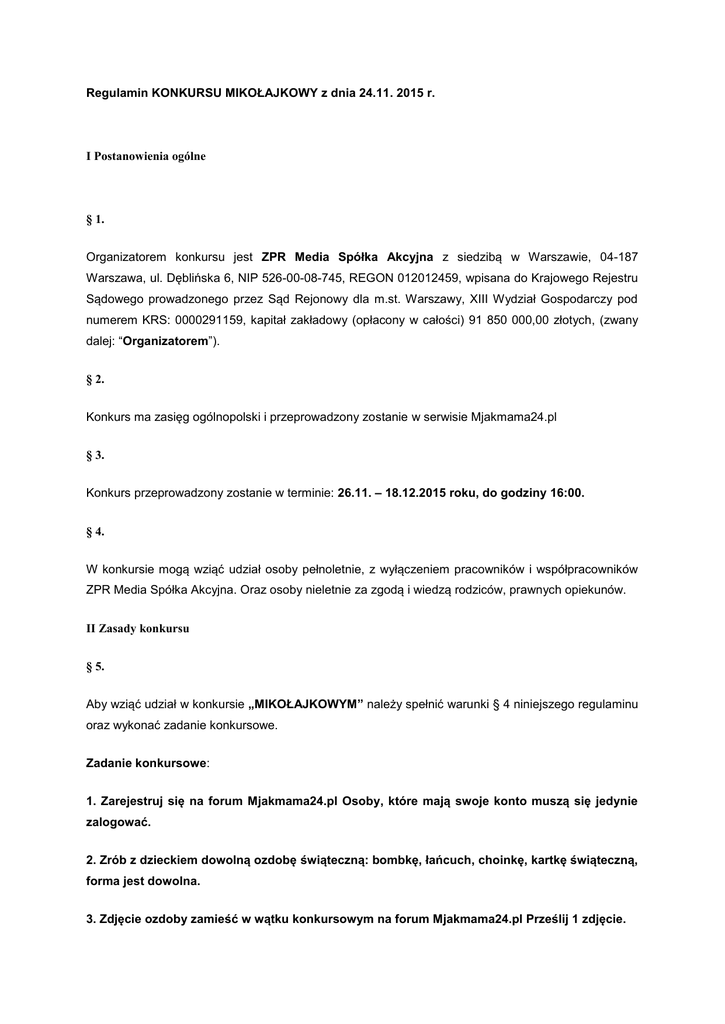 Regulamin KONKURSU MIKOŁAJKOWY z dnia 24.11. 2015 r. I Postanowienia ogólne § 1. Organizatorem konkursu jest ZPR Media Spółka Akcyjna z siedzibą w Warszawie, 04-187 Warszawa, ul. Dęblińska 6, NIP 526-00-08-745, REGON 012012459, wpisana do Krajowego Rejestru Sądowego prowadzonego przez Sąd Rejonowy dla m.st. Warszawy, XIII Wydział Gospodarczy pod numerem KRS: 0000291159, kapitał zakładowy (opłacony w całości) 91 850 000,00 złotych, (zwany dalej: “Organizatorem”). § 2. Konkurs ma zasięg ogólnopolski i przeprowadzony zostanie w serwisie Mjakmama24.pl § 3. Konkurs przeprowadzony zostanie w terminie: 26.11. – 18.12.2015 roku, do godziny 16:00. § 4. W konkursie mogą wziąć udział osoby pełnoletnie, z wyłączeniem pracowników i współpracowników ZPR Media Spółka Akcyjna. Oraz osoby nieletnie za zgodą i wiedzą rodziców, prawnych opiekunów. II Zasady konkursu § 5. Aby wziąć udział w konkursie „MIKOŁAJKOWYM” należy spełnić warunki § 4 niniejszego regulaminu oraz wykonać zadanie konkursowe. Zadanie konkursowe: 1. Zarejestruj się na forum Mjakmama24.pl Osoby, które mają swoje konto muszą się jedynie zalogować. 2. Zrób z dzieckiem dowolną ozdobę świąteczną: bombkę, łańcuch, choinkę, kartkę świąteczną, forma jest dowolna. 3. Zdjęcie ozdoby zamieść w wątku konkursowym na forum Mjakmama24.pl Prześlij 1 zdjęcie. 4. Polub funpage Mjakmama24.pl na FB Laureatami konkursu zostaną osoby, których zdjęcia Komisja Konkursowa uzna za najciekawsze. Najbardziej przekonujące. Oceniane będą kreatywność, pomysłowość. § 6. Nagrodą w konkursie „MIKOŁAJKOWYM” są: - 3 zegarki marki FLIK FLAK SWATCH o łącznej wartości 605 złotych, miejsca 1-3 - 3 lalki Lalaloopsy, o wartości 99 zł każda, miejsca 4-6 - 15 zestawów kosmetyków marki LANGSTEINER, miejsca 7 – 21: Zestaw zawiera: proszek zasadowy na odkwaszanie, płyn do kąpieli Bąbel Hotlux na przeziębienie dla dzieci, płyn do kąpieli Hotlux na przeziębienie dla dorosłych, Vitamina K i D3 dla dzieci, płyn Ecto Skin P7. Wartość zestawu 120 zł - 25 zestawów kosmetyków marki OILLAN, miejsca od 22 - 46: Zestaw zawiera: mleczko nawilżające, krem do pielęgnacji twarzy i ciała, płyn do mycia 2w1, szampon nawilżający. Wartość jednego zestawu: 80 zł - 10 filmów na DVD Królowa Śniegu, miejsca 47- 56 - 5 książek Baśnie polskie cudowna studzienka, miejsca 57- 61 - 5 książek Krowa Matylda na wakacjach, miejsca 62 - 66 - 5 książek Opowieści do poduszki, miejsca 67 - 71 - 5 książek Cztery strony czasu, miejsca 72 - 76 - 5 książek Najsłynniejsze legendy europejskie, miejsca 77 - 81 Wszystkie książki Wydawnictwa Media Rodzina, 25 szt. o łącznej wartości 200 zł § 7. W skład Komisji Konkursowej wchodzą: Redaktor prowadząca serwis Mjakmama24.pl – Katarzyna Stańczyk Redaktor serwisu Mjakmama24.pl.pl – Ania Sierant Dział Marketingu serwisów Internet – Gabriela Rybińska § 8. Komisja Konkursowa potwierdza zgodność przeprowadzenia konkursu z niniejszym regulaminem. § 9. Nad prawidłowością przebiegu konkursu i pracy Komisji Konkursowej czuwają władze statutowe Organizatora. § 10. Nicki laureatów Konkursu zostaną opublikowane 18.12.2015 r. w wątku konkursowym na forum.mjakmama24.pl § 11. O wygranej Organizator konkursu poinformuje Zwycięzców drogą mailową do 21.12.2015 r. III Postanowienia końcowe § 12. Regulamin jest dostępny w lokalu Organizatora przy ul. Dęblińskiej 6, 04-187 Warszawa od poniedziałku do piątku w godzinach od 9: 00 do 16: 00 oraz na forum.mjakmama24.pl w czasie trwania konkursu i w terminie 14 dni roboczych od jego zakończenia. § 13. Ewentualne reklamacje związane z konkursem mogą być kierowane do Organizatora w formie pisemnej, na adres Organizatora w terminie 14 dni roboczych od daty zakończenia konkursu. W przypadku przesłania reklamacji za pośrednictwem poczty decyduje data stempla pocztowego. § 14. Reklamacja powinna zawierać imię, nazwisko, dokładny adres i numer telefonu, jak również dokładny opis i powód reklamacji. § 15. Złożone przez Uczestników reklamacje będą rozpatrywane przez Organizatora niezwłocznie, jednakże nie później niż w terminie 14 dni od daty otrzymania reklamacji przez Organizatora. § 16. Zainteresowani Uczestnicy zostaną powiadomieni o wyniku rozpatrzenia reklamacji na piśmie, najpóźniej w ciągu 14 dni od daty rozpatrzenia reklamacji przez Organizatora. § 17. Niniejszy konkurs nie jest grą hazardową w rozumieniu ustawy o grach hazardowych z dnia 19.11.2009 r. § 18. Niniejszy regulamin stanowi podstawę prowadzenia konkursu i określa jego warunki oraz prawa i obowiązki jego uczestników. § 19. Adres e-mail Organizatora, pod którym można uzyskać informacje na temat organizacji konkursu: [email protected] W imieniu Organizatora, Gabriela Rybińska Specjalista ds. Marketingu Serwisów Internetowych Warszawa, 24.11.2015 r.
