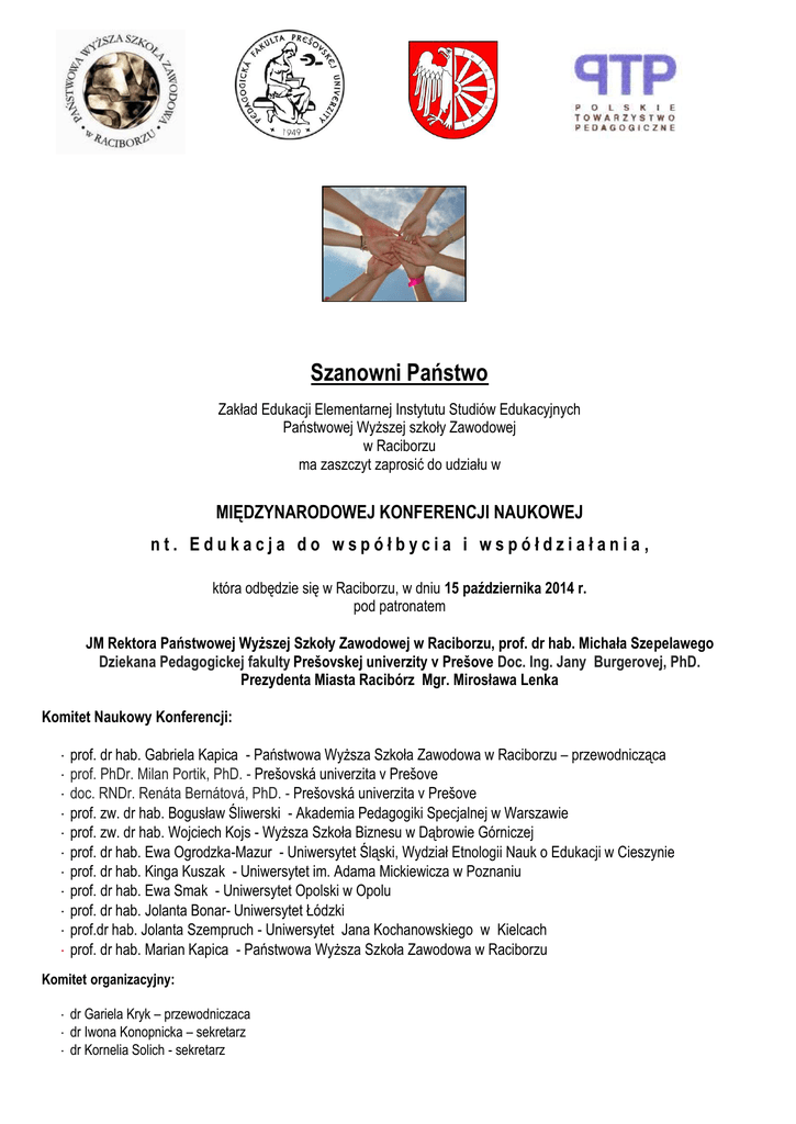 Szanowni Państwo Zakład Edukacji Elementarnej Instytutu Studiów Edukacyjnych Państwowej Wyższej szkoły Zawodowej w Raciborzu ma zaszczyt zaprosić do udziału w MIĘDZYNARODOWEJ KONFERENCJI NAUKOWEJ nt. Edukacja do współbycia i współdziałania, która odbędzie się w Raciborzu, w dniu 15 października 2014 r. pod patronatem JM Rektora Państwowej Wyższej Szkoły Zawodowej w Raciborzu, prof. dr hab. Michała Szepelawego Dziekana Pedagogickej fakulty Prešovskej univerzity v Prešove Doc. Ing. Jany Burgerovej, PhD. Prezydenta Miasta Racibórz Mgr. Mirosława Lenka Komitet Naukowy Konferencji: prof. dr hab. Gabriela Kapica - Państwowa Wyższa Szkoła Zawodowa w Raciborzu – przewodnicząca prof. PhDr. Milan Portik, PhD. - Prešovská univerzita v Prešove doc. RNDr. Renáta Bernátová, PhD. - Prešovská univerzita v Prešove prof. zw. dr hab. Bogusław Śliwerski - Akademia Pedagogiki Specjalnej w Warszawie prof. zw. dr hab. Wojciech Kojs - Wyższa Szkoła Biznesu w Dąbrowie Górniczej prof. dr hab. Ewa Ogrodzka-Mazur - Uniwersytet Śląski, Wydział Etnologii Nauk o Edukacji w Cieszynie prof. dr hab. Kinga Kuszak - Uniwersytet im. Adama Mickiewicza w Poznaniu prof. dr hab. Ewa Smak - Uniwersytet Opolski w Opolu prof. dr hab. Jolanta Bonar- Uniwersytet Łódzki prof.dr hab. Jolanta Szempruch - Uniwersytet Jana Kochanowskiego w Kielcach prof. dr hab. Marian Kapica - Państwowa Wyższa Szkoła Zawodowa w Raciborzu Komitet organizacyjny: dr Gariela Kryk – przewodniczaca dr Iwona Konopnicka – sekretarz dr Kornelia Solich - sekretarz Założenia programowe konferencji Przemiany ustrojowe, polityczne, społeczno-ekonomiczne i kulturowe spowodowały zepchnięcie wielu zagadnień edukacyjnych na dalszy plan. Wśród nich znalazły się także kwestie dotyczące przygotowania dzieci i młodzieży do współdziałania, do partnerstwa oraz do zachowań kooperatywnych. W zatomizowanym społeczeństwie, w warunkach erozji społecznej dominuje wciąż wyścig oparty na egoistycznym dążeniu jednostek do realizacji własnych celów. Lekceważone jest natomiast nawiązywanie pozytywnych kontaktów interpersonalnych oraz emocjonalnych. Te negatywne zachowania przyczyniają się do obniżenia kondycji psychospołecznej oraz poziomu kapitału społecznego całego społeczeństwa. Motywem wiodącym tematyki naszej konferencji uczyniliśmy sformułowanie zaczerpnięte z Raportu dla UNESCO pt. Edukacja. Jest w niej ukryty skarb ( red. J. Delors, 1998), określające tzw. trzeci filar edukacji: Uczyć się by żyć wspólnie, uczyć się współżycia z innymi”. Zadanie to zostało uznane jako największe wyzwanie dla edukacji XXI wieku. Nasze naukowe spotkanie traktujemy jako szerokie forum dyskusyjne, które umożliwi dokonanie szerszej eksploracji oraz głębszych refleksji - teoretycznych, metodologicznych i praktycznych – nad wieloma zagadnieniami dotyczącymi interesującej nas problematyki. Proponujemy następujące obszary tematyczne: Homo cooperativus – wizja człowieka dojrzałego społecznie, współdziałającego – w kontekście współczesnych przemian cywilizacyjnych; Kształtowanie kompetencji kooperatywnych – głównym wyzwaniem współczesnej permanentnej edukacji na wszystkich szczeblach kształcenia, a także w obrębie edukacji nieformalnej i incydentalnej; Środowisko rodzinne i rówieśnicze w procesie wychowania społecznego; Budowanie partnerstwa kulturowego w ramach współpracy międzynarodowej, w tym transgranicznej – w przestrzeni euroregionu. Praktyczne konteksty w zakresie wdrażania dzieci i młodzieży do współbycia i współdziałania w różnych przestrzeniach edukacyjnych, np. projekty edukacyjne, zajęcia lekcyjne, pozalekcyjne, pozaszkolne i inne. Wierzymy, iż nasze obrady zainspirują teoretyków i praktyków do twórczych przedsięwzięć intensyfikujących i optymalizujących działania w obrębie tak ważnej sfery edukacji. Naszym życzeniem jest bowiem ożywienie procesu wychowania społecznego, tak by przestało ono być jedną z najbardziej zaniedbanych przestrzeni współczesnej pedagogiki. Z wyrazami szacunku Organizatorzy Konferencji Komunikat dotyczący spraw organizacyjnych Program konferencji obejmuje jeden dzień - 15.10. 2014 roku ( środa). Proponujemy obrady w formie wymiany poglądów, dyskusji, wspólnie formułowanych wniosków, tez i sugestii badawczych. Taka forma spotkania sprawia, że pożytki poznawcze i rekomendacje badawcze w dużej mierze zależą od stopnia aktywności Uczestników w poszczególnych częściach całej konferencji. Opłata za udział w konferencji wynosi 200 zł i obejmuje: opłatę konferencyjną, materiały konferencyjne, przerwy kawowo-kanapkowe, obiad oraz publikację. Uczestnicy sami pokrywają koszty ewentualnych noclegów oraz koszty dojazdu. Zgłoszenia uczestnictwa (wzór – w załączeniu) należy nadesłać do 15 kwietnia 2014 r. na adres: [email protected] Potwierdzeniem chęci udziału w Konferencji będzie wniesienie do dnia 15 maja 2014 r. opłaty konferencyjnej na konto bankowe Uczelni: Państwowa Wyższa Szkoła Zawodowa ul. Słowackiego 55 47-400 Racibórz Nr konta: 69 10 50 1328 1000 0022 6112 0386 z dopiskiem: Edukacja do współbycia i współdziałania Tekst wystąpienia należy dostarczyć – pocztą elektroniczną na adres e–mailowy [email protected], do dnia konferencji lub wydruk i płytę CD w dniu konferencji. Wymogi znajdują się w załączniku. Wszelkie dodatkowe informacje organizacyjne można uzyskać pod numerami telefonów: dr Gabriela Kryk +48 604145541 dr Iwona Konopnicka +48 603532455 dr Kornelia Solich +48 696448726 Wskazówki redakcyjne W związku z zamiarem wydania publikacji uprzejmie prosimy o przygotowanie artykułu nieprzekraczającego 0,5 arkusza wydawniczego wraz z bibliografią (20 000 znaków). Rozprawy powinny być oryginalnymi i dotąd niepublikowanymi artykułami. FORMATOWANIE TEKSTU imię i nazwisko wraz z nazwą reprezentowanej instytucji 