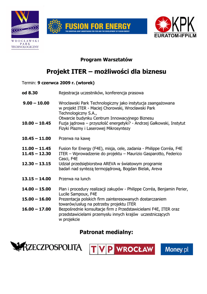Program Warsztatów Projekt ITER – moŜliwości dla biznesu Termin: 9 czerwca 2009 r. (wtorek) od 8.30 Rejestracja uczestników, konferencja prasowa 9.00 – 10.00 Wrocławski Park Technologiczny jako instytucja zaangaŜowana w projekt ITER - Maciej Chorowski, Wrocławski Park Technologiczny S.A., Otwarcie budynku Centrum Innowacyjnego Biznesu Fuzja jądrowa – przyszłość energetyki? - Andrzej Gałkowski, Instytut Fizyki Plazmy i Laserowej Mikrosyntezy 10.00 – 10.45 10.45 – 11.00 Przerwa na kawę 11.00 – 11.45 11.45 – 12.30 Fusion for Energy (F4E), misja, cele, zadania - Philippe Corréa, F4E ITER – Wprowadzenie do projektu – Maurizio Gasparotto, Federico Casci, F4E Udział przedsiębiorstwa AREVA w światowym programie badań nad syntezą termojądrową, Bogdan Bielak, Areva 12.30 – 13.15 13.15 – 14.00 Przerwa na lunch 14.00 – 15.00 Plan i procedury realizacji zakupów - Philippe Corréa, Benjamin Perier, Lucile Sampoux, F4E Prezentacja polskich firm zainteresowanych dostarczaniem towarów/usług na potrzeby projektu ITER Bezpośrednie konsultacje firm z Przedstawicielami F4E, ITER oraz przedstawicielami przemysłu innych krajów uczestniczących w projekcie 15.00 – 16.00 16.00 – 17.00 Patronat medialny: Miejsce warsztatów: Wrocławski Park Technologiczny Budynek ALFA ul. Klecińska 123, 54-413 Wrocław Sala konferencyjna – parter Udział w warsztatach jest bezpłatny. Decyduje kolejność zgłoszeń. Uczestnikom warsztatów zapewniamy komplet materiałów, tłumaczenie symultaniczne, poczęstunek i obiad. Organizatorzy nie pokrywają kosztów noclegu. Zgłoszenia uczestnictwa w warsztatach prosimy nadsyłać do dnia 20 maja 2009 r. na załączonym formularzu (skan, faks): e-mail: [email protected] faks: +48 71 780 40 34 Noclegi: Dla Państwa wygody w hotelu Diament zostały zarezerwowane pokoje. Zainteresowanych prosimy o potwierdzenie rezerwacji w hotelu do dnia 25.05.2009 r. Opłaty za nocleg/i naleŜy dokonywać bezpośrednio w hotelu. Ceny noclegów: 190,00 PLN (pokój 1-os.), 230,00 PLN (pokój 2-os.). Rezerwacja na hasło: Wrocławski Park Technologiczny Hotel "Diament" Wrocław, ul. Muchoborska 10, 54 - 424 Wrocław [email protected] tel.: 071/7-350-350 faks: 071/7-350-351 http://www.hoteldiament.pl Dojazd komunikacją miejską: Autobusy: 126, 134, 136 – przystanek: Wrocławski Park Technologiczny www.technologpark.pl www.fusionforenergy.europa.eu www.iter.org Dodatkowe informacje: [email protected], tel.: + 48 71 798 58 00