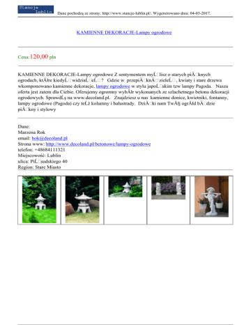 Dane pochodzą ze strony: http://www.stancje-lublin.pl/. Wygenerowano dnia: 04-03-2017. KAMIENNE DEKORACJE-Lampy ogrodowe Cena:120,00 pln KAMIENNE DEKORACJE-Lampy ogrodowe Z sentymentem myĹlisz o starych piÄknych ogrodach, ktĂłre kiedyĹ widziaĹeĹ ? Gdzie w przepiÄknÄ zieleĹ , kwiaty i stare drzewa wkomponowano kamienne dekoracje, lampy ogrodowe w stylu japoĹskim tzw lampy Pagoda. Nasza oferta jest zatem dla Ciebie. Oferujemy ogromny wybĂłr wykonanych ze szlachetnego betonu dekoracji ogrodowych. SprawdĹş na www.decoland.pl. Znajdziesz u nas kamienne donice, kwietniki, fontanny, lampy ogrodowe (Pagoda) czy teĹź kolumny i balustrady. DziÄki nam TwĂłj ogrĂłd bÄdzie piÄkny i stylowy Dane: Marzena Rok email: [email protected] Strona www: http://www.decoland.pl/betonowe/lampy-ogrodowe telefon: +48684111321 Miejscowość: Lublin ulica: PiĹsudskiego 40 Region: Stare Miasto