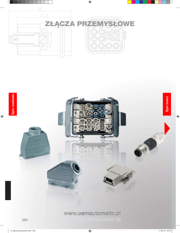 Spis treści Spis rozdziału ZŁĄCZA PRZEMYSŁOWE 252 9. Zlacza przemyslowe.indd 252 www.oemautomatic.pl www.oemautomatic.pl 11-02-19 23:18 Innehåll Kontaktdon strona 254 Złącza HAN E strona 256 Złącza HAN 3A strona 258 Złącza HAN A strona 262 Złącza HAN D i DD strona 264 Złącza HAN K strona 266 Złącza HAN HSB strona 269 Złącza Han Terminal Block strona 270 Złącza HAN Modular strona 271 HAN Compact strona 281 Złącza Harax M8/M12 strona 283 Złącza Han-Yellock® strona 284 Obudowy złącz strona 290 Złącza Ethernet strona 311 Akcesoria i narzędzia strona 312 Obudowy specjalne strona 313 www.oemautomatic.pl www.oemautomatic.pl 9. Zlacza przemyslowe.indd 253 Złącza przemysłowe Informacje ogólne Spis treści SPIS TREŚCI 253 11-02-19 23:18 Informacje ogólne Rozmiar HAN 3A 230/400 V 10 A HAN 4A 230/400 V HAN 7D 230/400 V HAN 8D 50 V 10 A 10 A 10 A 258 HAN 10A 230 V 16 A 258 HAN 15D 230 V 10 A 3A Patrz strona 307 307 308 308 261 261 10A Patrz strona 262 264 HAN 16A 230 V 16 A HAN 25D 230 V 10A 262 HAN 32A 230 V 16 A 264 HAN 50D 230 V 10 A Spis rozdziału Patrz strona 309 309 310 310 Spis treści 16A 32A Patrz strona 262 264 HAN 6E 230 V 16 A HAN 24DD 230 V 16 A 6B Patrz strona 290 290 256 264 HAN 10E 230 V 16 A HAN 42DD 230 V 10 A 10B Patrz strona 292 292 256 264 HAN 16E 230 V 16 A HAN 40D 230 V 10 A HAN 72DD 230 V 16 A 16B Patrz strona 296 296 296 256 HAN 24B 400 V 16 A 264 HAN 64D 230 V 10 A 264 HAN 108DD 400 V 10 A 24B Patrz strona 300 300 300 256 264 HAN 32E 400 V 16 A HAN 80D 230 V 10 A HAN 144DD 400 V 10 A 256 HAN 48B 400 V 16 A 264 HAN 128D 230 V 10 A HAN 216DD 400 V 10 A 264 32B Patrz strona 304 304 264 48B Patrz strona 254 9. Zlacza przemyslowe.indd 254 305 305 256 264 264 Zamówienia : tel. 022-8632722 • fax. 022-8632724 11-02-19 23:18 Informacje ogólne Rozmiar HAN Q5/10 400 V HAN Q7/10 400 V HAN Q12/0 400 V/ 10 A 10 A 16 A 3A 259 259 260 307 307 307 10A 308 308 16A 309 32A 310 310 Spis treści Spis rozdziału 309 Modular 50-1000 V 5-100 A 6B 271 291 291 291 10B 271 HAN 6A SB 400/690 V 35 A 293 293 293 HANK4/0 690 V 80 A 16B 269 HAN 24AV 400 V 16 A 266 271 297 297 297 HANK4/8 400 V 0/16 A 24B 270 267 271 301 301 301 HAN 32A HSB 400/690 V 35 A 32B 269 271 304 304 304 48B 271 [email protected] • www.oemautomatic.pl 9. Zlacza przemyslowe.indd 255 305 305 255 11-02-19 23:18 Złącza przemysłowe HAN E 6-48 - Liczba pól 6-48 • • • Szybkie i bezpieczne połączenie Połączenie śrubowe, sprężynowe, zaciskane IP65 Funkcja Wtyki lub gniazda mogą być montowane według potrzeb użytkownika w obudowach górnych lub dolnych (chassi) różnych typów w zależności od tego, która z tych części znajduje się pod napięciem. Obudowy chassi dostępne są w dwóch różnych wariantach. Pierwszy z nich - z otwartym spodem - umożliwia montaż poprzez ścianę szafy sterowniczej. Drugi typ ze spodem zamkniętym - nadaje się do montażu na maszynach. Obudowy górne dostępne są również w dwóch wariantach: z wejściem przewodu z boku lub z góry obudowy. Przewód wprowadza się najczęściej poprzez króciec z uszczelkami i gwintem PG lub metrycznym. Niektóre ze złącz mogą łączyć nie tylko sygnały słabo i silnoprądowe, ale również sygnały pneumatyczne i świetlne Spis treści Spis rozdziału Złącza typu HAN stosowane są do szybkiego i jednocześnie prostego połączenia maszyn i urządzeń elektrycznych. Dzięki nim istnieje możliwość szybkiego rozłączenia maszyny i przygotowania jej do konserwacji,remontu lub modernizacji. Odpowiednia konstrukcja złącz umożliwia stosowanie ich w środowisku narażonym na zanieczyszczenia określone w klasie 3 (wg DIN VDE 0110-01.89). Złącza spełniają wymogi grupy izolacji C, co oznacza, że można je stosować w przemyśle, zakładach naprawczych, kotłowniach itp. Kompletne złącze posiada wysoki stopień ochrony IP65 lub IP68, zależny od zastosowanej obudowy (wyjątek stanowią obudowy HAN 3A, dla których stopień ochrony wynosi IP44). Dane techniczne Prąd Napięcie pracy Temperatura pracy Stopień ochrony Liczba pól Przekrój przewodu (zaciskane) Przekrój przewodu (śrubowe) Materiał styku Materiał obudowy Certyfikaty 16 A max. 500 V zgodnie z DIN EN 61984 600 V zgodnie z UL/CSA -40 °C do +125 °C IP65 zgodnie z DIN 40 050 6, 10, 16, 24, 32, 48 + 0,14-2,5 mm² 2,5 mm² stop miedzi z pokrywą srebrzaną lub pozłacaną stop aluminium lakierowany proszkowo UL, CSA, SEV Wymiary Otwory, w obudowie z otwartym spodem M F 256 9. Zlacza przemyslowe.indd 256 mm 6-bieg. 10-bieg. 16-bieg. 24-bieg. 32-bieg. 48-bieg. x 48 60 82 108 86 117 y 35 35 35 35 71 81 a 70 83 103 130 110 148 Liczba pól/Połączenie 6-24-bieg. śrubowe/zaciskane 6-24-bieg. sprężynowe Liczba pól/Połączenie 6-bieg. 10-bieg. 16-bieg. 24-bieg. L 44 57 77,5 104 b 32 32 32 32 65 70 a 20 21 b 35 36 c 21 19 d 37 35 l 51 64 84,5 111 Zamówienia : tel. 022-8632722 • fax. 022-8632724 11-02-19 23:19 Nr katalogowy Wtyk Nr katalogowy Gniazdo Pola Rodzaj/pola 09330062601 09330062602 09330062616 09330062701 09330062702 09330062716 6 6 6 09330102601 09330102602 09330102616 09330102701 09330102702 09330102716 09330162601 09330162602 09330162616 Śrubowy Zaciskany Sprężynowy Rozmiar obudowy 6B 6B 6B 290 290 290 10 10 10 Śrubowy Zaciskany Sprężynowy 10B 10B 10B 292 292 292 09330162701 09330162702 09330162716 16 16 16 Śrubowy Zaciskany Sprężynowy 16B 16B 16B 296 296 296 09330242601 09330242602 09330242616 09330242701 09330242702 09330242716 24 24 24 Śrubowy Zaciskany Sprężynowy 24B 24B 24B 300 300 300 09330162601 09330162611 09330162602 09330162612 09330162616 09330162626 09330162701 09330162711 09330162702 09330162712 09330162716 09330162726 32 32 32 32 32 32 Śrubowy nr. 1-16 Śrubowy nr. 17-32 Zaciskany nr. 1-16 Zaciskany nr. 17-32 Sprężynowy nr. 1-16 Sprężynowy nr. 17-32 * 32B 32B 32B 32B 32B 32B 304 304 304 304 304 304 09330242601 09330242611 09330242602 09330242612 09330242616 09330242626 09330242701 093302427