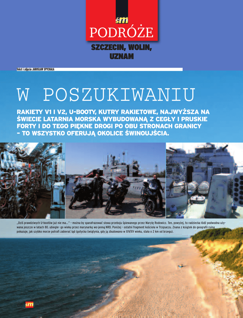 PODRÓŻE SZCZECIN, WOLIN, UZNAM Tekst i zdjęcia JAROSŁAW SPYCHAŁA W POSZUKIWANIU RAKIETY V1 I V2, U-BOOTY, KUTRY RAKIETOWE, NAJWYŻSZA NA ŚWIECIE LATARNIA MORSKA WYBUDOWANĄ Z CEGŁY I PRUSKIE FORTY I DO TEGO PIĘKNE DROGI PO OBU STRONACH GRANICY – TO WSZYSTKO OFERUJĄ OKOLICE ŚWINOUJŚCIA. „Dziś prawdziwych U-bootów już nie ma…” - można by sparafrazować słowa przeboju śpiewanego przez Marylę Rodowicz. Ten, powyżej, to radziecka łódź podwodna używana jeszcze w latach 80. ubiegłe- go wieku przez marynarkę wo-jenną NRD. Poniżej - ostatni fragment kościoła w Trzęsaczu. Znana z książek do geografii ruina pokazuje, jak szybko morze potrafi zabierać ląd (gotycka świątynia, gdy ją zbudowano w XIV/XV wieku, stała o 2 km od brzegu). 66 PAŹDZIERNIK 2013 ożna tam dojechać główną, bardzo nudną drogą krajową S3, ale zdecydowanie lepiej jest pojechać opłotkami, czyli od Szczecina przez Załom, Lubczynę i Komarów do Goleniowa, po czym jadąc dalej drogą nr 6 uciec z niej na północ przed Nowogardem na Golczewo i Świerzno. Ta zupełnie boczna droga o małym natężeniu ruchu wiedzie przez lasy Pomorza Zachodniego oferując niezapomniane zapachy, wąskie, momentami kręte asfalty w całkiem dobrym stanie i skłaniając do jazdy tempem kontemplacyjnym. M Zyskujemy godzinkę Docieramy do Trzęsacza, gdzie (jeszcze) można zobaczyć resztki kościoła stojącego na osuwającym się klifie. Została po nim już tylko jedna ściana, którą oglądać można ze specjalnie wybudowanego pomostu. Dalej na trasie nie będzie już pomników ani skansenów. Śmigamy wzdłuż wybrzeża przez Dziwnów i Międzyzdroje w kierunku Świnoujścia. Warto wiedzieć, że znaki wykierują nas na prom biegnący „pod” Świnoujściem, który przeznaczony jest dla turystów, przez co dołożymy ok. 12 km. Nie trzeba się nimi kierować i pojechać na rondzie dojazdowym do Świnoujścia prosto. Wtedy dojedziemy po chwili do promu przeznaczonego dla ruchu lokalnego (w okresie letnim jest ogólnie dostępny). Samochody o numerach innych niż miejscowe nie są wpuszczane, ale motocykle, jak wiadomo mogą więcej. Zy- skamy w ten sposób co najmniej godzinę na przeprawie. Rakiety i odrzutowce W Świnoujściu mamy szereg atrakcji. Miłośnikom wspinaczki i widoków proponuję wejść na liczącą 68 metrów (co daje ok. 22 piętra) i przeszło 300 stopni, najwyższą nad polskim Bałtykiem latarnię morską po czym tych, którzy mają jeszcze siłę, zapraszam na zwiedzanie świetnie zachowanych i wręcz wzorcowo przygotowanych do oglądania, pruskich fortów – Gerharda i Anioła. Naprawdę warto. 1. SZCZECIN 2. TRZĘSACZ 3. ŚWINOUJŚCIE 4. PEENEMUNDE 5. USEDOM 6. ŚWINOUJŚCIE – 119 km – – 60 km – – 48 km – – 61 km – – 25 km – W TRZĘSACZU CIĄGLE JESZCZE MOŻNA ZOBACZYĆ RESZTKI KOŚCIOŁA STOJĄCEGO NA OSUWAJĄCYM SIĘ KLIFIE. OGLĄDA SIĘ JE ZE SPECJALNEGO POMOSTU. DALEJ NA TRASIE NIE MA JUŻ POMNIKÓW ANI SKANSENÓW. PAŹDZIERNIK 2013 67 TURYSTYKA Szczecin, Wolin, Uznam A ponieważ Europa nie ma granic, to po 48 kilometrach jazdy znajdziemy się w niemieckim Muzeum Techniki w Peenemunde, czyli tak naprawdę w miejscu, gdzie konstruowano, testowano i produkowano w czasie wojny rakiety V1 i V2. Miejsce jest szalenie ciekawe, ponieważ Niemcy, jak to Niemcy, ekspozycje przygotowali perfekcyjnie. Są makiety prototypów samolotów o napędzie odrzutowym i odrestaurowane rakiety V1 i V2. A gdyby tego mało, to na tyłach muzeum przycumowany jest kuter rakietowy z lat 60. ubiegłego wieku. Można go zwiedzać. Robi wrażenie. Można dotykać, tylko nie dzika Muzeum Techniki w Peenemunde to miejsce, gdzie konstruowano, testowano i produkowano rakiety V1 i V2. W czasie wojny zakłady zostały zbombardowane przez Anglików dzięki informacjom zdobytym przez wywiad Armii Krajowej. ŚWINOUJŚCIE JEST MIEJSCEM, KTÓREMU WARTO POŚWIĘCIĆ MINIMUM CAŁY WEEKENDU. GORĄCO DO TEGO ZACHĘCAM. 68 PAŹDZIERNIK 2013 Tylko kilometr dalej, przy nabrzeżu zobaczymy „prawdziwego U-boota”. Nie jest to łódź z II wojny światowej, tylko bardzo duża (dwa razy większa, niż niemieckie) radziecka łódź podwodna używana jeszcze w latach 80. ubiegłego wieku przez marynarkę wojenną NRD. Można zwiedzić wszystkie przedziały tego współczesnego U-boota, od rufy do dziobu. Umieszczono w nich nawet manekiny marynarzy, co sprawa wrażenie, jakby okręt żył i za chwile miał znowu wyjść w morze. Po zwiedzaniu czas pojeździć. Jedziemy więc z powrotem trochę okrężną drogą, przez Wolgast i Usdom po to, żeby zobaczyć i poczuć różnicę w technologii budowy lokalnych dróg oraz perfekcyjne, przygraniczne niemieckie wioski, gdzie trawa stoi na baczność, a przed domami, zamiast krzaków i chaszczy, rosną piękne kwiaty. Świnoujście jest miejscem wartym poświęcenia mu minimum całego weekendu, do czego zachęcam. Tylko pamiętajcie: nie karmcie dzików chodzących spokojnie przy przejściach na plażę! Oglądać – tak, dotykać – nie… Słonecznej pogody! n