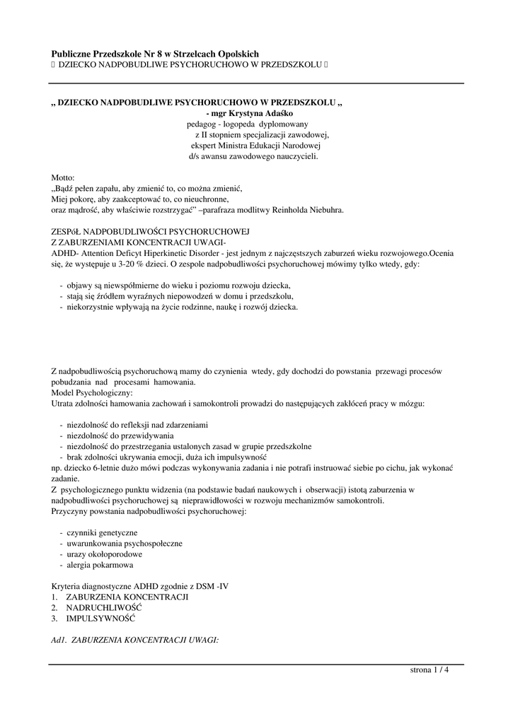 Publiczne Przedszkole Nr 8 w Strzelcach Opolskich DZIECKO NADPOBUDLIWE PSYCHORUCHOWO W PRZEDSZKOLU „ DZIECKO NADPOBUDLIWE PSYCHORUCHOWO W PRZEDSZKOLU „ - mgr Krystyna Adaśko pedagog - logopeda dyplomowany z II stopniem specjalizacji zawodowej, ekspert Ministra Edukacji Narodowej d/s awansu zawodowego nauczycieli. Motto: „Bądź pełen zapału, aby zmienić to, co można zmienić, Miej pokorę, aby zaakceptować to, co nieuchronne, oraz mądrość, aby właściwie rozstrzygać” –parafraza modlitwy Reinholda Niebuhra. ZESPóŁ NADPOBUDLIWOŚCI PSYCHORUCHOWEJ Z ZABURZENIAMI KONCENTRACJI UWAGIADHD- Attention Deficyt Hiperkinetic Disorder - jest jednym z najczęstszych zaburzeń wieku rozwojowego.Ocenia się, że występuje u 3-20 % dzieci. O zespole nadpobudliwości psychoruchowej mówimy tylko wtedy, gdy: - objawy są niewspółmierne do wieku i poziomu rozwoju dziecka, - stają się źródłem wyraźnych niepowodzeń w domu i przedszkolu, - niekorzystnie wpływają na życie rodzinne, naukę i rozwój dziecka. Z nadpobudliwością psychoruchową mamy do czynienia wtedy, gdy dochodzi do powstania przewagi procesów pobudzania nad procesami hamowania. Model Psychologiczny: Utrata zdolności hamowania zachowań i samokontroli prowadzi do następujących zakłóceń pracy w mózgu: - niezdolność do refleksji nad zdarzeniami - niezdolność do przewidywania - niezdolność do przestrzegania ustalonych zasad w grupie przedszkolne - brak zdolności ukrywania emocji, duża ich impulsywność np. dziecko 6-letnie dużo mówi podczas wykonywania zadania i nie potrafi instruować siebie po cichu, jak wykonać zadanie. Z psychologicznego punktu widzenia (na podstawie badań naukowych i obserwacji) istotą zaburzenia w nadpobudliwości psychoruchowej są nieprawidłowości w rozwoju mechanizmów samokontroli. Przyczyny powstania nadpobudliwości psychoruchowej: - czynniki genetyczne uwarunkowania psychospołeczne urazy okołoporodowe alergia pokarmowa Kryteria diagnostyczne ADHD zgodnie z DSM -IV 1. ZABURZENIA KONCENTRACJI 2. NADRUCHLIWOŚĆ 3. IMPULSYWNOŚĆ Ad1. ZABURZENIA KONCENTRACJI UWAGI: strona 1 / 4 Publiczne Przedszkole Nr 8 w Strzelcach Opolskich DZIECKO NADPOBUDLIWE PSYCHORUCHOWO W PRZEDSZKOLU - Dziecko nie jest w stanie skoncentrować się na szczegółach podczas zajęć w przedszkolu, lub w czasie wykonywania innych czynności - Często ma trudności z utrzymaniem uwagi za grach, zadaniach - często wydaje się nie słuchać tego co do niego się mówi - Często nie stosuje się do kolejno podawanych instrukcji i ma kłopoty z dokończeniem zadań i wypełnieniem codziennych obowiązków, - Często ma trudności ze zorganizowaniem sobie zajęć lub zabaw - Nie lubi, ociąga się lun unika rozpoczęcia zajęć wymagających wysiłku umysłowego jak zajęcia dydaktyczne w przedszkolu - Często gubi zabawki, ołówki, książki, przybory przedszkolne, Ad.2 NADRUCHLIWOŚĆ: - Dziecko ma często nerwowe ruchy rąk lub stóp, bądź nie jest w stanie usiedzieć w miejscu - Wstaje z miejsca w czasie zajęć dydaktycznych w przedszkolu lub w innych sytuacjach wymagających spokojnego siedzenia - Często chodzi po pomieszczeniu lub wspina się na meble w sytuacjach gdy jest to zachowanie niewłaściwe- w przedszkolu, w domu, - Często ma trudności ze spokojnym bawieniem się lub odpoczywaniem - Często jest nadmiernie gadatliwe Ad.3 IMPULSYWNOŚĆ: - Często wyrywa się z odpowiedzią zanim pytanie zostało sformułowane w całości przez nauczyciela, - Często ma kłopoty z zaczekaniem na swoją kolej, - Często przerywa lub przeszkadza innym np. wtrąca się do rozmowy lub zabawy, Uwaga: Sześć lub więcej objawów ADHD musi utrzymywać się u dziecka przynajmniej przez 6 miesięcy oraz występować w różnych sytuacjach (przedszkole, dom, zabawa), w stopniu utrudniającym funkcjonowanie dziecka w grupie rówieśniczej, bądź w stopniu niewspółmiernym do jego rozwoju. W ramach klasyfikacji DSM- IV wyróżnia się trzy podtypy ADHD: - Podtyp z przewagą zaburzeń koncentracji uwagi: - dziecko nie może się skupić, jest jednak w stanie pozostać w bezruchu, jeśli wymaga tego sytuacja - Podtyp z przewagą nadpobudliwości psychoruchowej: - tzw. „żywe srebro” na którego aktywność nie ma wpływu żadna sytuacja. Odpowiednio zmotywowany jest w stanie skupić się na dłużej. - Podtyp mieszany: - u dziecka występują zarówno nasilone objawy niepokoju ruchowego, słaba kontrola impulsów oraz zaburzenia uwagi. Pamiętaj! - Im młodsze dziecko, tym wyraźniejsze są objawy nadruchliwości i kłopotów z kontrolą impulsów - Im starsze dziecko- na plan pierwszy wysuwają się trudności w zakresie koncentracji uwagi - U chłopców częściej występuje podtyp mieszany lub podtyp z przewagą nadpobudliwości psychoruchowej - U dziewczynek częściej stwierdza się podtyp z przewagą zaburzeń koncentracji uwagi - U dzieci w wieku przedszkolnym występuje najczęściej podtyp z dominującą nadpobudliwością psychoruchową. strona 2 / 4 Publiczne Przedszkole Nr 8 w Strzelcach Opolskich DZIECKO NADPOBUDLIWE PSYCHORUCHOWO W PRZEDSZKOLU W niemowlęctwie nadpobudliwość psychoruchowa przejawia się: 1. Krzykliwością 2. Płaczliwością 3. Zaburzeniami snu 4. Zaburzeniami łaknienia U dzieci starszych w wieku przedszkolnym-szkolnym występuje w złożonych formach i obejmuje trzy sfery rozwojowe: 1. Ruchową 2. Poznawczą 3. Emocjonalną Pełna diagnostyka w kierunku ADHD dokonywana jest przez lekarza specjalistę neurologa lub psychiatrę dziecięcego obejmuje następujące czynności: - Zabranie wywiadu od rodziców i obserwacji dziecka - Badanie pediatryczne - Badanie psychologiczne ( ocena ilorazu inteligencji) - Badanie neurologiczne ( EEG) - Analiza opinii n nauczyciela przedszkola ( funkcjonowanie dziecka w grupie przedszkolnej) - Rozmowa z dzieckiem - Ocena funkcjonowania dziecka na podstawie kryteriów DSM- IV, ICD-10. W przypadku stwierdzenia ADHD należy podjąć 
