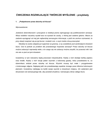 ĆWICZENIA ROZWIJAJĄCE TWÓRCZE MYŚLENIE - przykłady 1. „Podpatrzone przez dziurkę od klucza” Wprowadzenie: Jesteście dziennikarzami i pracujecie w redakcji pisma zajmującego się publikowaniem sensacji. Wasz redaktor naczelny wysłał was na wywiad do osoby, o której jest ostatnio głośno. Macie za zadanie wyciągnąć od niej jak najbardziej sensacyjne informacje, a jeśli nie zechce rozmawiać, to przy okazji rozejrzeć się po jej biurze i znaleźć coś, o czym ludzie chcą przeczytać. Niestety ta osoba zdążyła już wyjechać za granicę, a wy zostaliście pod zamkniętymi drzwiami biura. Cóż to jednak za problem dla prawdziwego tropiciela sensacji? Przez dziurkę od klucza można zobaczyć naprawdę wiele, a to czego się nie zobaczy można zmyślić, bo przecież nikt i tak nie wie co jest za tymi drzwiami. Uczestnicy w tym ćwiczeniu będą pracować indywidualnie. Każdy z nich dostaje kartkę papieru oraz kredki. Każdy z nich losuje jeden wycinek z kolorowej gazety, który przedstawia to, co dziennikarz widział przez dziurkę od klucza. Wycinki muszą być małe i przygotowane z kolorowego zdjęcia. Najlepiej jeśli nie przedstawiają zupełnie niczego poza kilkoma kolorowymi plamami. Uczestnicy naklejają na kartki swoje wycinki w dowolnym miejscu. Ich zadaniem jest dorysować coś sensacyjnego tak, aby powstał zmyślony i sensacyjny obraz całego biura. praca Magdy praca Mateusza 2. Podaj jak najwięcej przykładów nakryć głowy. Przykładowe odpowiedzi: czapka, kapelusz, beret, chustka, kask, hełm, melonik, cylinder, turban, czepek, welon, kaptur. 3. Podaj jak najwięcej przykładów na wykorzystanie kartki papieru. Przykładowe odpowiedzi: napisać list, zrobić samolot, czapkę, kubek, użyć jako serwetkę, talerzyk, zrobić wiatraczek, tunel dla samochodzików. 4. Tajemniczy stwór Należy przygotować kartki i mazaki. Nauczyciel mówi: A teraz bierzemy jeden mazak do ręki i rysujemy na kartce jakąkolwiek linię krzywą, jaka nam tylko przyjdzie na myśl. Następnie bierzemy drugi mazak i nim wykonujemy inną dowolną linię. Na wszystkie pytania o to, jaka ma być linia, odpowiada: ”Jaka ci przyjdzie na myśl”. Na koniec tego etapu nauczyciel mówi:” A teraz ostatnim mazakiem rysujemy ostatnią linię, ale tak, aby utworzyć, wykorzystując wszystkie pozostałe – jakieś nieistniejące zwierzę, wymyślone przez was. Mamy z tych trzech kolorowych linii stworzyć dziwnego stwora”. Kiedy już wszyscy narysują wymyślonego stwora, nauczyciel zachęca, aby wymyślić: - nazwę dla stwora, może być też imię, - W jakim środowisku żyje: wodnym, wodno – lądowym, w powietrzu, w (na) ziemi, a może w mieszanym? - Czym się odżywia? - Jakiego rodzaju dźwięki wydaje? - Jakiej jest wielkości? - Czy ma futro, pióra, czy łuski? - Czy odznacza się jakimiś szczególnymi zdolnościami? - Jakie ma trzy podstawowe cechy usposobienia, czy jest sympatyczny, miły czy raczej agresywny i groźny dla człowieka? Jaki jest? Np. NUDZIARZ KRÓTKONOGI PLAŻOWY Żyje w środowisku wodnym, w godzinach 8 – 20, potem w środowisku lądowym. Je stare puszki po konserwach i butelki zostawione na plażach. Jest jak sama nazwa wskazuje znudzony, powolny, ciągle senny, ale miły dla ludzi. praca Mateusza praca Magdy